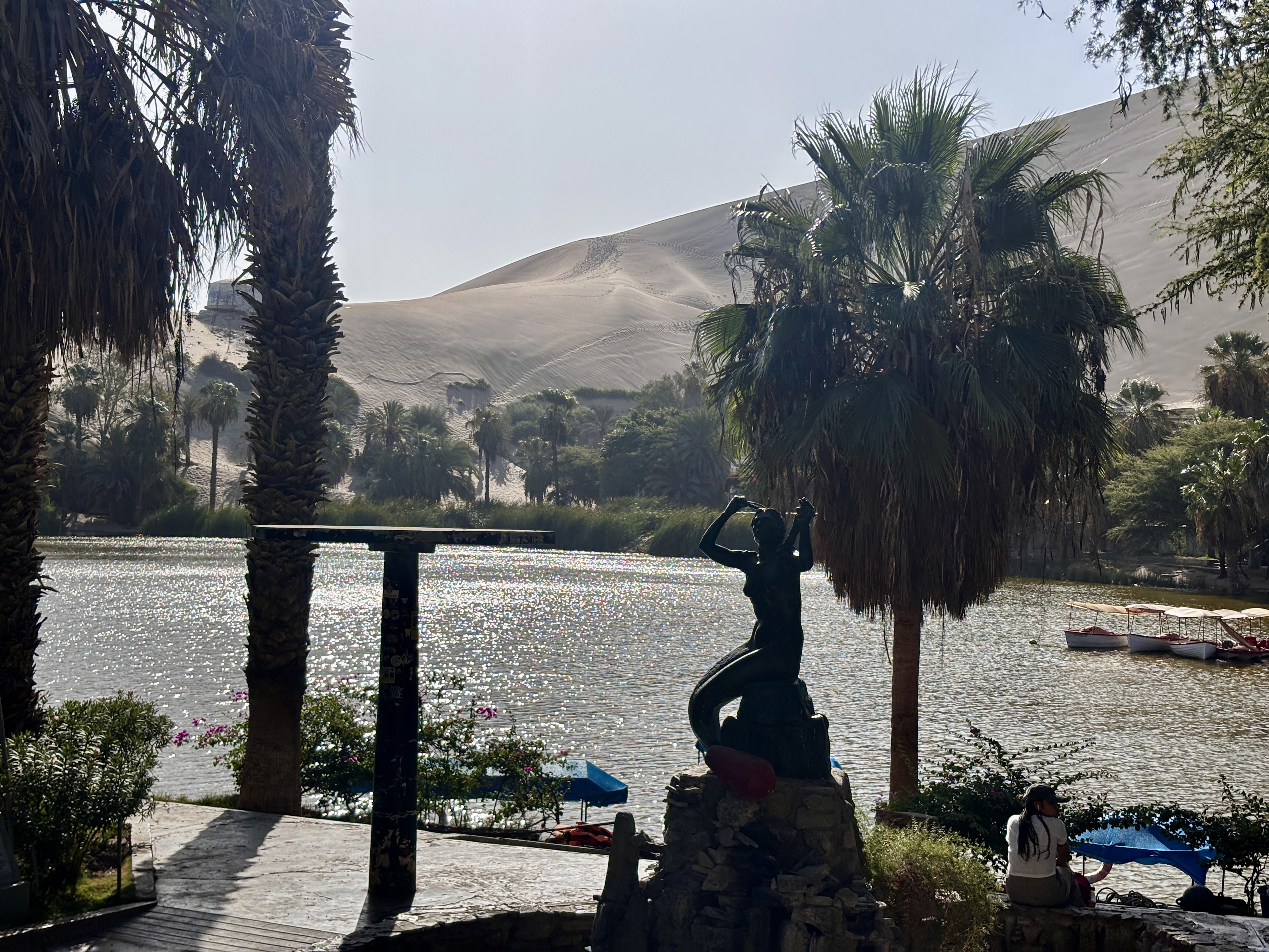 Huacachina. Semblant de ville en boucle autour d’un étang vert comme un mirage persistant, cernée de bars vides et d’hôtels absurdes, plantée là entre désert et béton : s’étonner chaque seconde que l’oasis existe vraiment, et plus encore qu’on ait voulu y croire assez pour construire son rêve humain.