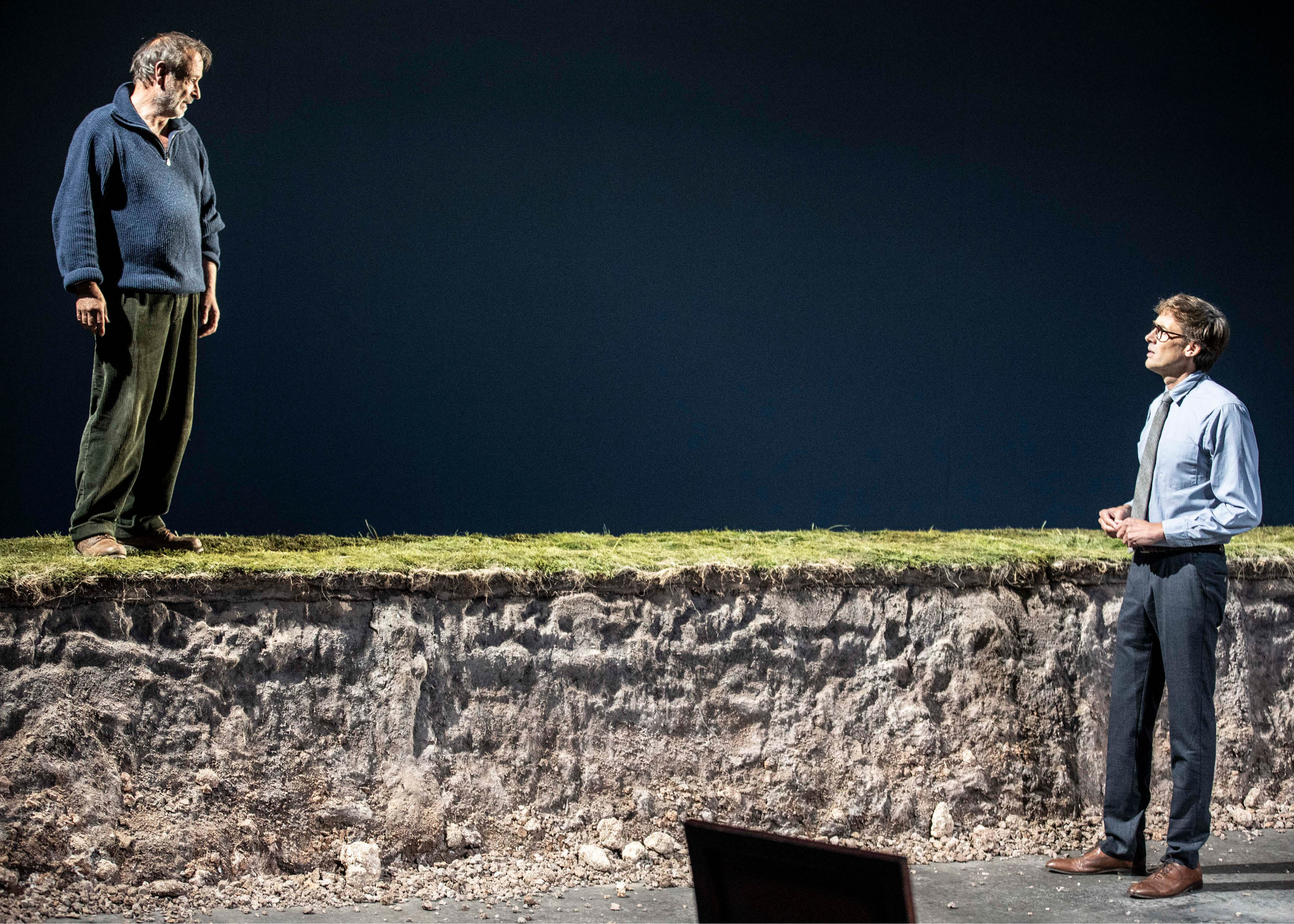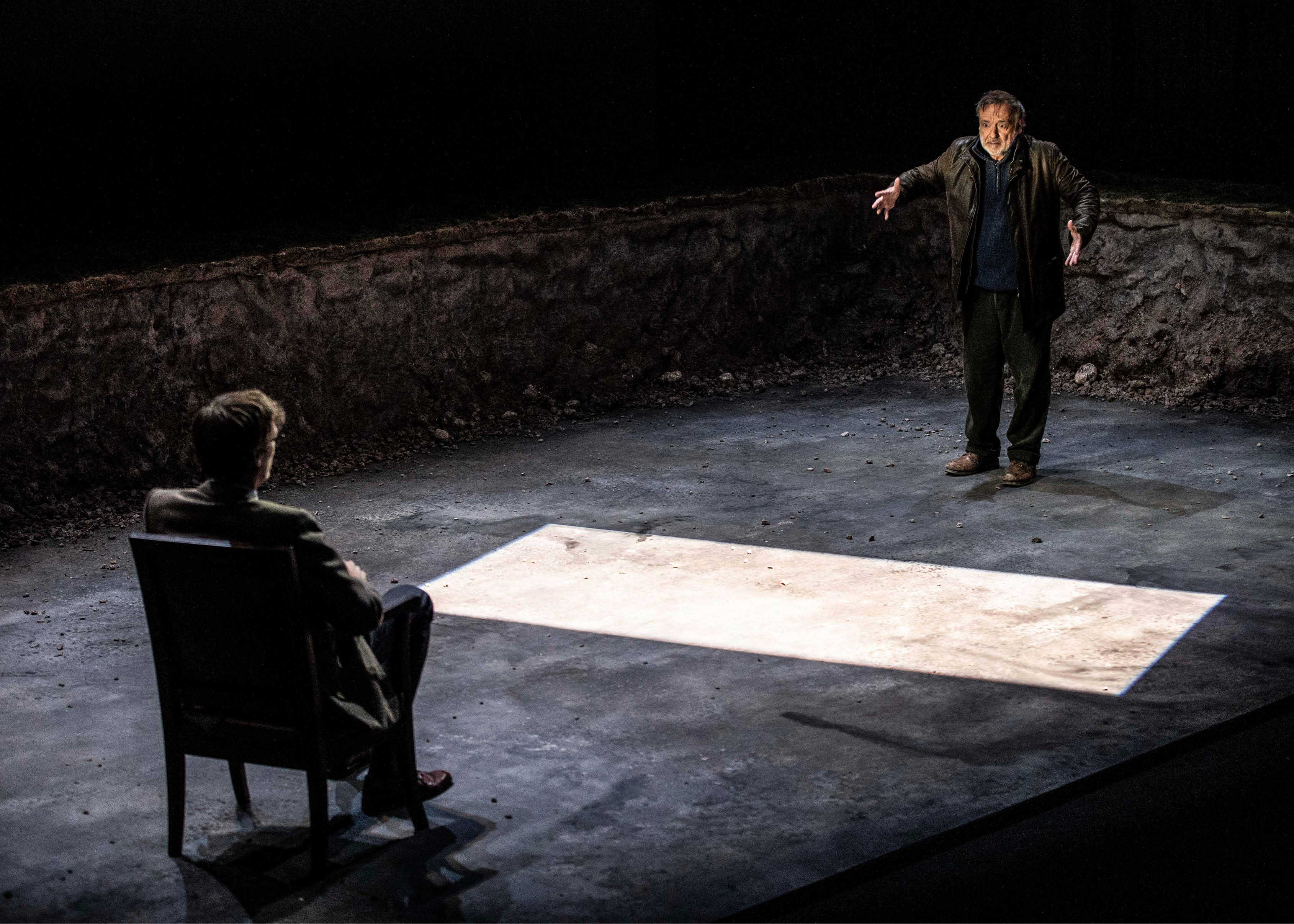 Sur le plateau, le lieu de la représentation — une cellule de commissariat de province, étroite et confinée — se déploie en un lieu représenté déréalisé : un chantier à l’abandon, avec son trou de terre dans l’herbe verte, un tombeau en friche où gisent les espoirs des hommes trop crédules. La situation d’audition de l’accusé devant son juge (interprété par le metteur en scène lui-même, Emmanuel Noblet, sobre et profond) se métamorphose ainsi en espace symbolique, où la contrainte carcérale et l’enfermement psychologique dialoguent avec la dépossession sociale et territoriale qu’incarne ce chantier laissé aux promesses trahies. Ce déplacement d’un lieu clos vers un extérieur apparemment vaste — la rade de Brest, la presqu’île transformée par les promoteurs et vite abandonnée — installe une tension entre enfermement et liberté illusoire, entre contrainte individuelle et dépossession collective. L’écran, qui diffuse de temps à autres des plans de la mer, accentue cette sensation d’espace ouvert, de respiration et de fuite possibles, mais toujours sous l’ombre du système qui broie. Emmanuel Noblet choisit ainsi la sobriété : dépouillé, le plateau est réduit à son ossature et renvoyé à l’énigme de son allégorie, scénographie faite silence pour que résonne la langue de Tanguy Viel — langue sans ornement qui épouse les contours d’une parole ordinaire et qui, par là même, rend visible ce qui trop souvent demeure hors-champ. C’est là que réside l’élégance de ce geste théâtral : refuser l’illusion spectaculaire pour laisser toute la place à cette langue patiente et latente, qui dit la misère sociale, les humiliations communes, la mécanique implacable par laquelle un homme est conduit jusqu’au meurtre. Le théâtre devient ainsi cette chambre d’audience où se rejoue, sous nos yeux, la tension entre la loi et la justice.