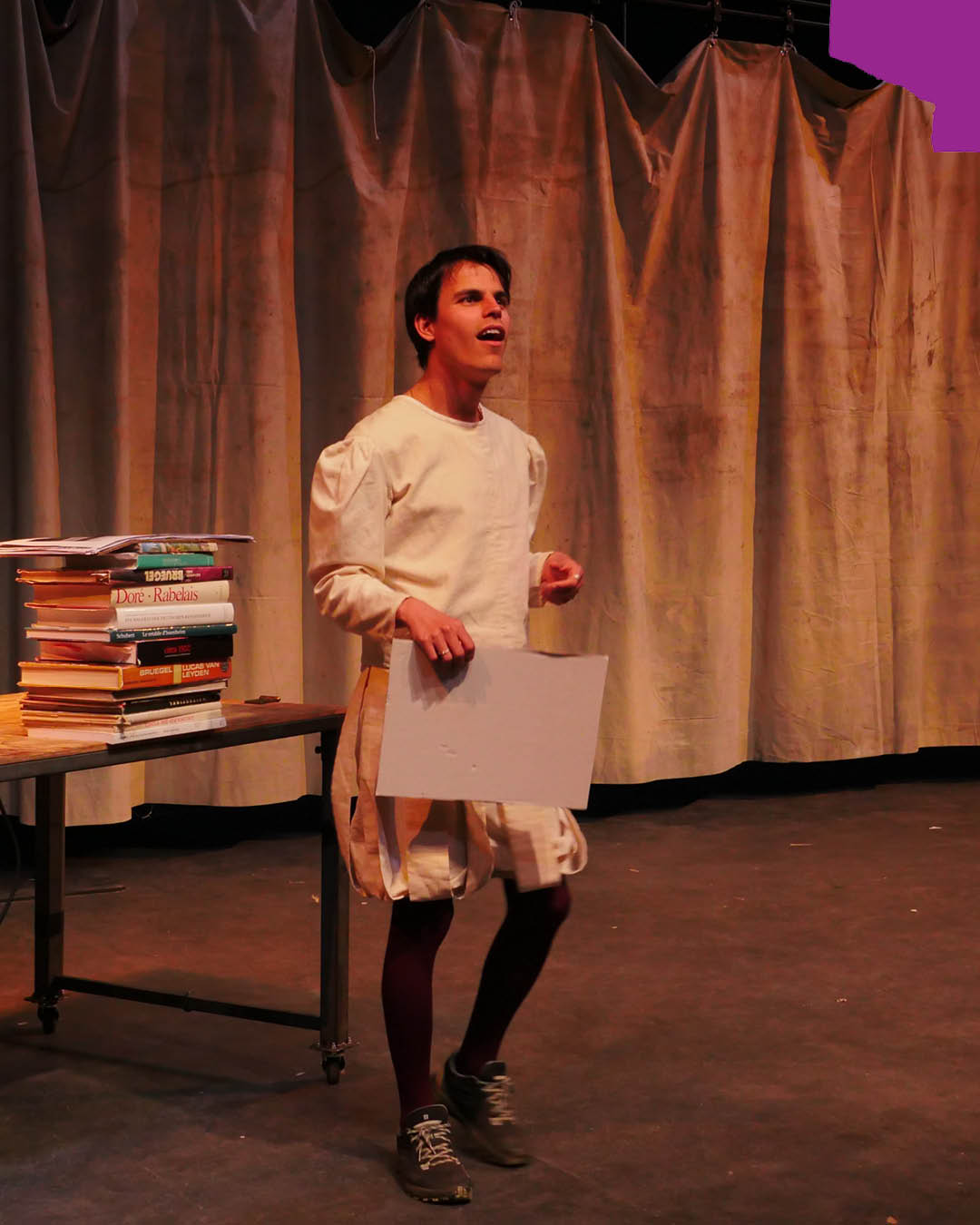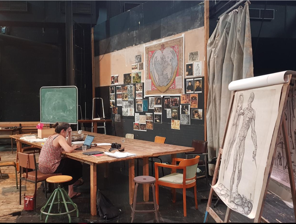 Le spectacle s’ouvre sur un paradoxe spectaculaire qui en donne aussitôt la règle : en montrant sa fabrique, il affirme sa loi. Ce qui saisit d’emblée relève d’un certain dénuement exposé, celui d’un atelier qui tient lieu de théâtre, où l’œuvre et l’instrument qui la produit se confondent, tenus dans la même main et laissés visibles. Le spectaculaire ne tient pas ici à l’effet, mais au fait même que se donne en spectacle sa matière, à nu. En exhibant ce peu, il se tient à sa propre mesure, élaborant à vue des moyens ajustés à son désir. Au centre du plateau, un panneau court sur une grande partie de la largeur de la scène sur lequel s’affichent les images du monde, puisque le monde nous parvient comme image, qu’il ne se saisit d’abord que comme image de lui : cartes, tableaux renaissants de portraits d’humanistes que recouvrent les portraits de puissants de ce monde eux-mêmes recouverts de paysages qui tâchent de les renverser. Surimpression, vertige fixé. Ailleurs, ce sont les emblèmes de ce temps qui s’ouvre alors comme un cadavre qu’on dissèque en public, image par quoi s’autorise un autre savoir que celui des autorités religieuses. Car c’est par les images qu’on peut le voir aussi, le saisir et le défier. Sur la table devant le panneau sont déposés les livres, à côté de quoi se poseront les assiettes et les couverts, les verres, quand la table de travail se changera en table à manger : mais se change-t-elle ? Ou s’opère-t-il une sorte de métaphorisation à vue de ce que la pensée est la chair de l’esprit — image devenue lieu commun de la Renaissant que la scène ici immédiatement assemble et traverse avec désinvolture. Il y aurait ainsi là quelque chose qui relèverait d’emblée de l’atelier, comme d’un laboratoire humaniste : les instruments pour penser, et qui ordonnent le chaos du réel en signes lisibles. Parmi ces images, discrètement, on reconnaît le cadavre du Christ exécuté par Holbein – rappel muet que ce monde est dressé sur les charniers des hommes et des dieux. Accolé à ce panneau, autre surface : un large rideau blanc qui sépare et joint, cache en laissant deviner tout un théâtre de l’autre côté d’où va surgir le théâtre. Rideau qu’on va tirer — non lever, mais tirer : rideau de la farce qui dit aussi d’emblée ce dont il s’agit et d’où l’on relève.