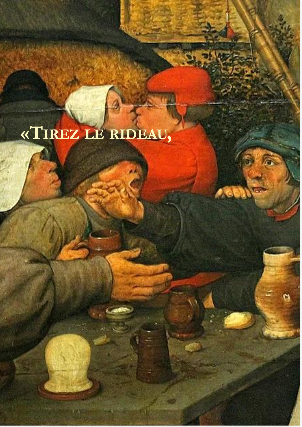 Ce geste inaugural rejoindrait celui de Boccace qui, avant de confier à ses dix jeunes gens la joie de raconter, décrit longuement en prélude de son Decameron la peste qui ravage Florence et les corps, comme si la parole partagée trouvait son ressort dans la reconnaissance lucide de l’effroi. L’effroi agit alors comme le terreau d’où surgit la parole joyeuse, parce qu’il situe l’état des forces en présence et rappelle que les hommes déploient une inventivité égale pour se détruire et pour créer de la beauté. Et ce serait dans cette conscience aiguë du péril que se fonde l’urgence du rassemblement : se réunir pour raconter, boire, manger et rire, prend sens sous la menace dans l’affirmation immédiate d’une vie qui se sait fragile. La communauté qui se forme sur scène, à l’image de celle du Decameron ou de la troupe pantagruélique, trouve sa nécessité dans cette alliance forgée « à l’instant du danger » afin de maintenir cette « certaine gayeté d’esprit » que tout, autour d’elle, cherche à dissoudre.
