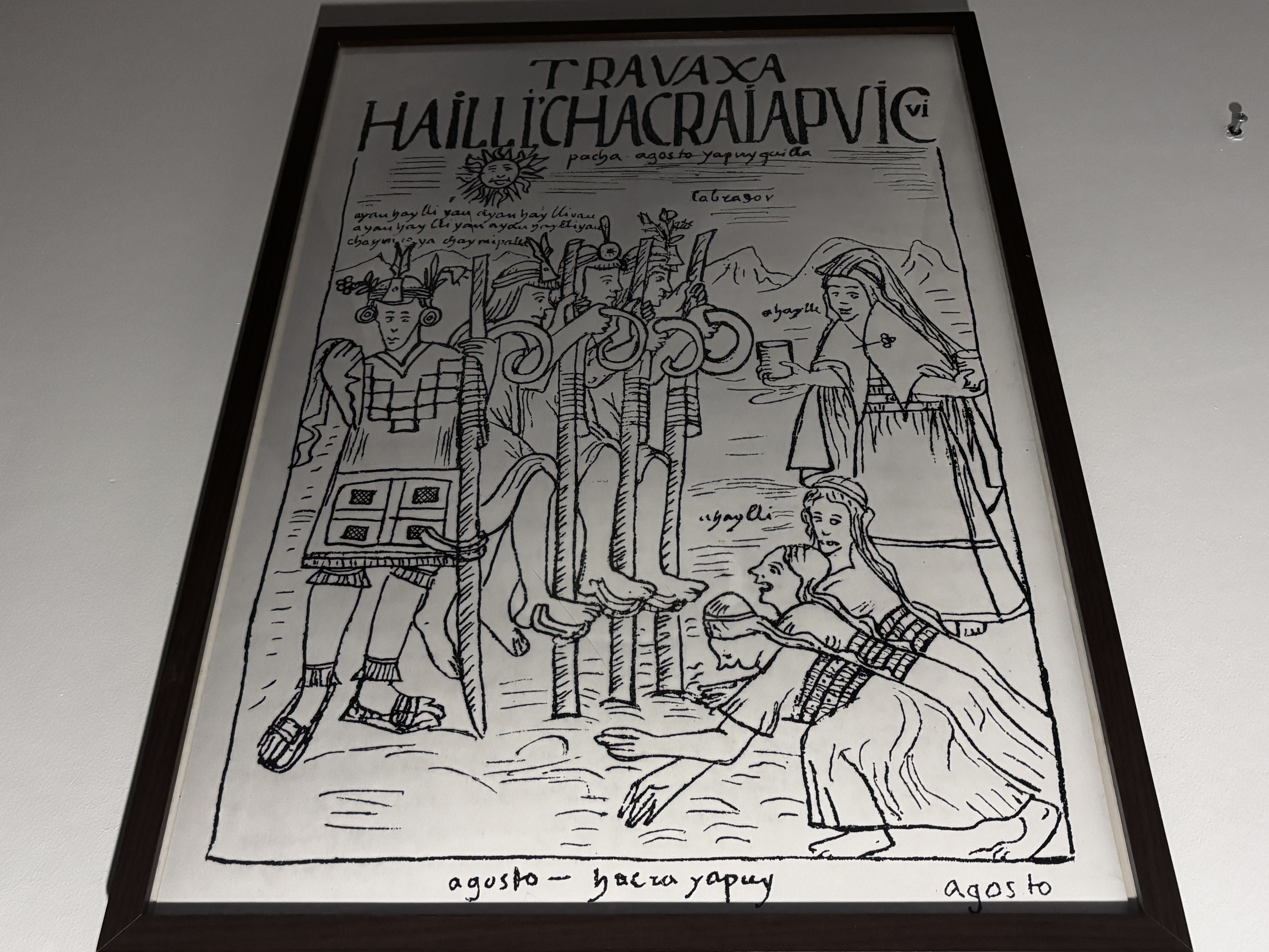 Descendant de quelques bâtards massacrés, Felipe Guamán Poma de Ayala n’est plus fils des enfants du Soleil depuis quelques générations déjà, depuis ce soir-là où Pizarro a lancé son cheval sur l’Inca en hurlant le nom de Dieu, de l’or et de la soif — liant par son hurlement l’un à l’autre ; mais Felipe n’est pas encore espagnol, peut-être le deviendra-t-il dans un siècle ou deux, alors il écrit ; il compose le calendrier. Puisqu’il ne sait plus la langue de ses pères, il invente les syllabes des mots qui lui viennent aux lèvres quand il tâche de se souvenir de ce que lui disait une grand-mère aveugle, qui tenait de sa grand-mère aveugle les contes de leurs grands-mères : on n’écrit pas l’histoire autrement que comme Felipe Guamán Poma de Ayala. Pour chaque mois, quelques silhouettes jetées à grands traits, comme si c’était un cheval. Au mois d’août, ceci :