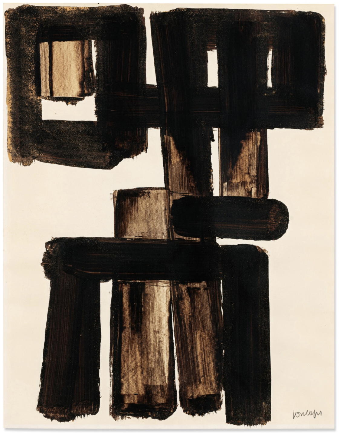 La guerre s’achève. Pierre Soulages est reçu aux Beaux-Arts de Paris, refuse de s’y rendre — il sait qu’il se trouvera en désaccord avec l’académisme qui y règne encore. Il s’installe à Montpellier avec Colette, qu’il vient d’épouser — choix de la marge, de l’écart, loin des circuits obligés. Il travaille des figurations abstraites : la forme ne peut plus être transcription docile d’un motif. Elle doit devenir acte, événement visuel qui surgit dans l’instant de sa propre nécessité. L’huile le contraint trop. Par impatience, rage, il jette sur du papier des lignes brutales au brou de noix avec des outils de peintre en bâtiment : là, ces lignes vibrent autrement sous ses larges brosses et ses racloirs.