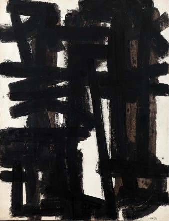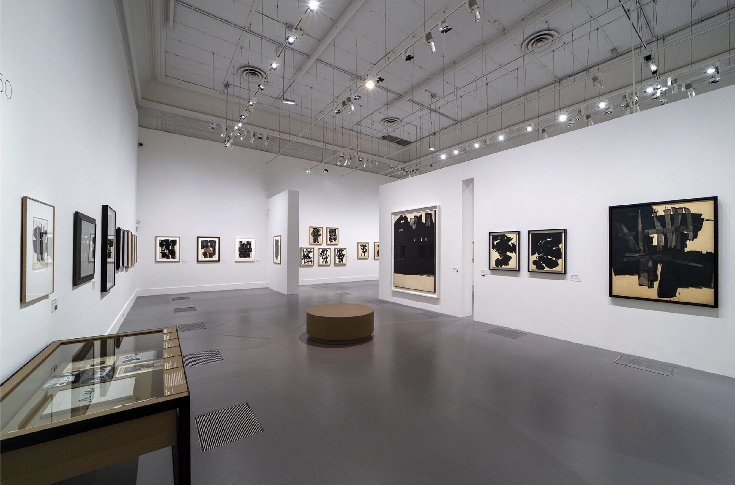 Marge du travail sur toile, ou laboratoire central ? Le papier reste le lieu où s’exercent les plus grandes violences : variantes dans l’usage du brou — couches épaisses, coups de brosse horizontaux et verticaux, alternance mat / brillant. C’est aussi sur papier que débutent les lithographies dès 1952 — noires, puissamment contrastées, réalisées avec l’imprimeur Fernand Mourlot à Paris.