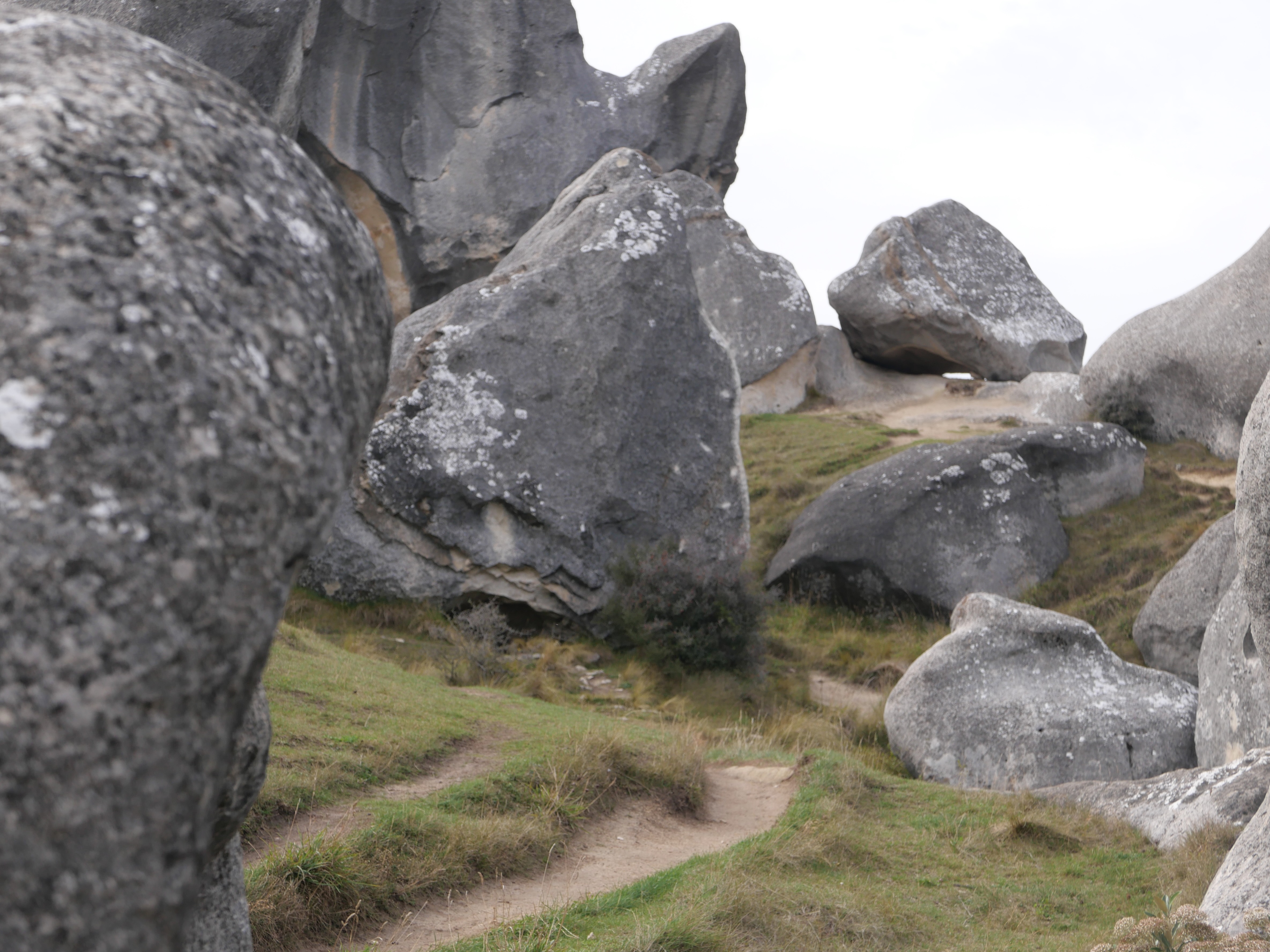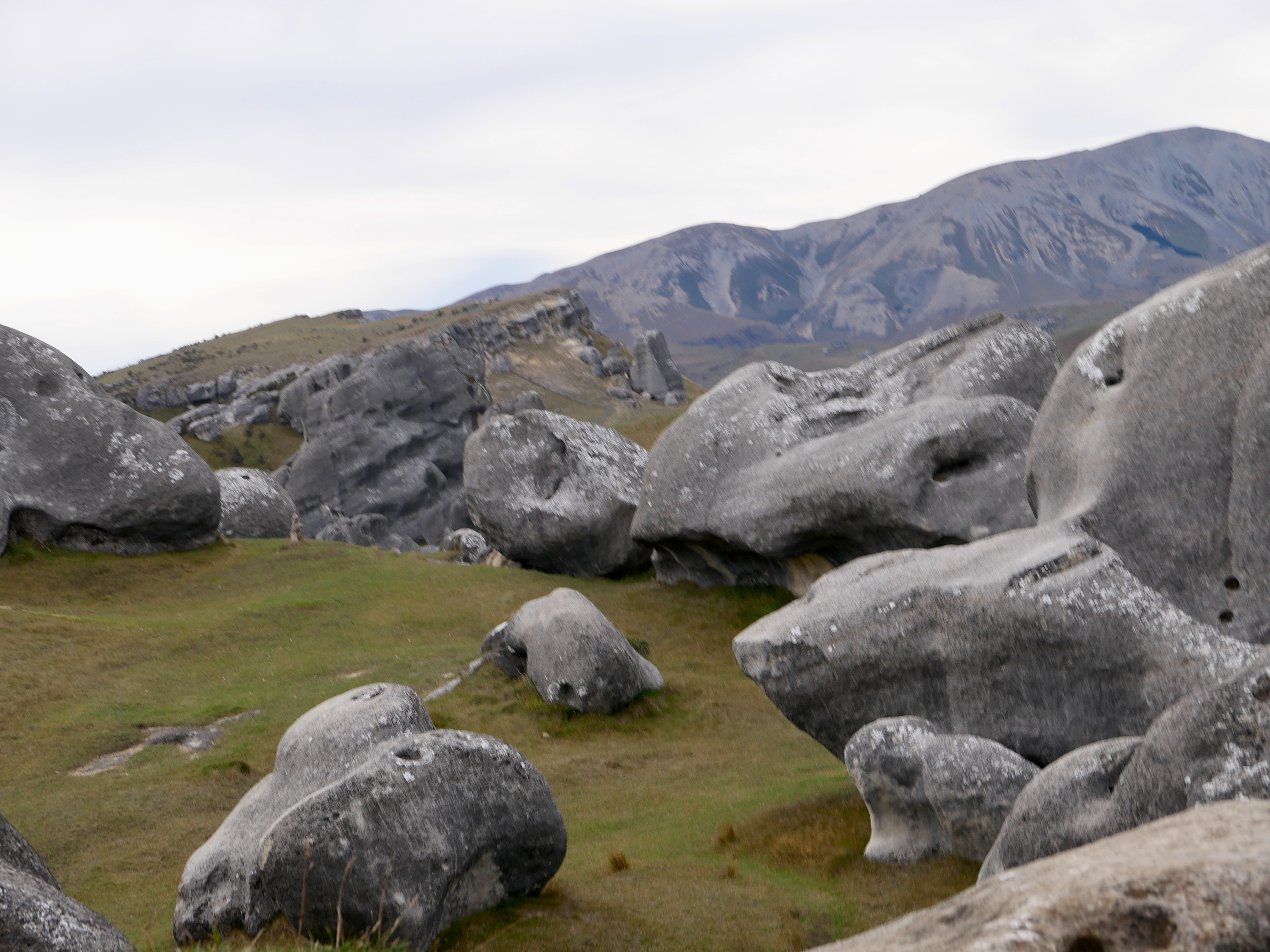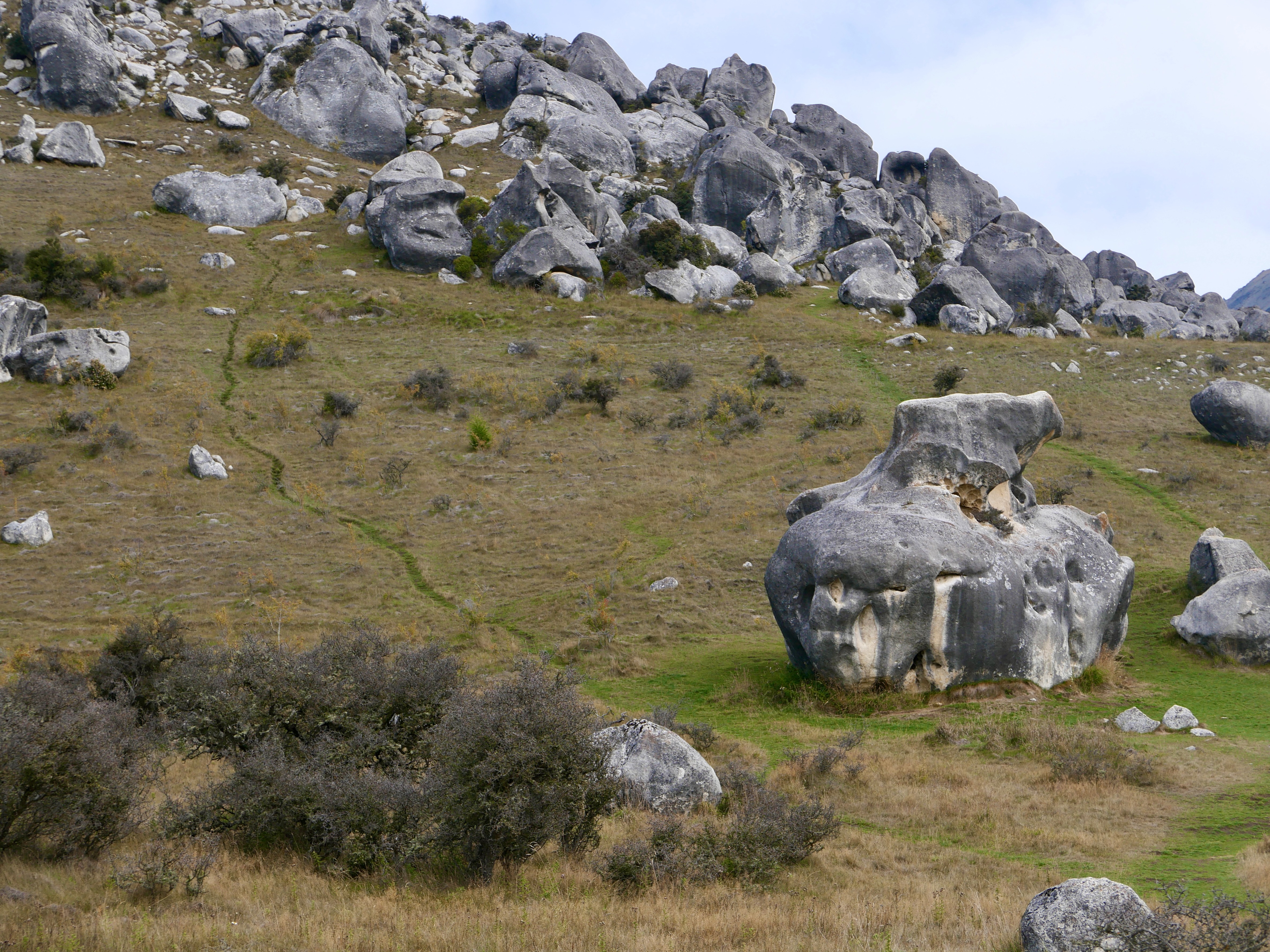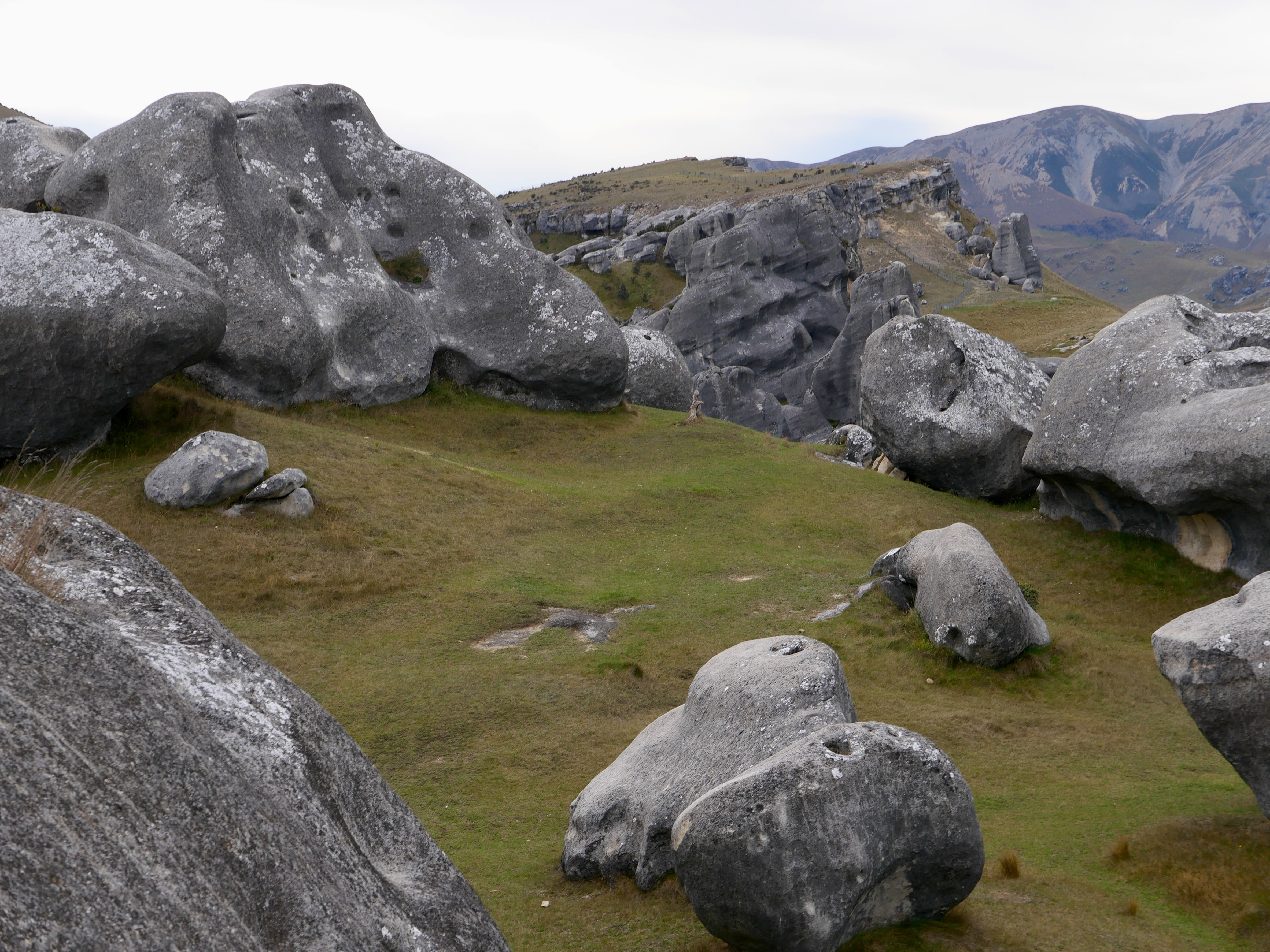 Nous sommes au cœur de l’île du Sud, dans les Alpes néo-zélandaises, entre Christchurch et Arthur’s Pass. Ici, à plus de 700 mètres d’altitude, la pierre est du calcaire, sculpté par le vent, la glace, les pluies acides d’un autre âge. Ces blocs géants sont nés sous la mer, il y a 30 millions d’années, soulevés lentement par les mouvements de la croûte terrestre, puis burinés par le temps. Les anciens Maoris connaissaient cette vallée depuis longtemps : les Ngāi Tahu y venaient en pèlerinage, pour chercher le pounamu dans les rivières de l’ouest, mais aussi pour écouter, pour honorer. Kura Tāwhiti n’était pas seulement un passage : c’était un seuil, un lieu de savoirs et de récits, chargé de tapu. Puis vinrent les colons, les routes, les clôtures. Un nom anglais s’est posé là — Castle Hill, pour les ressemblances que les Européens voyaient entre ces blocs et les ruines de leurs châteaux écroulés. Mais les pierres, elles, n’ont pas changé qui veillent. Et quelque part dans l’ombre qu’elles projettent, l’ancien nom continue de battre.