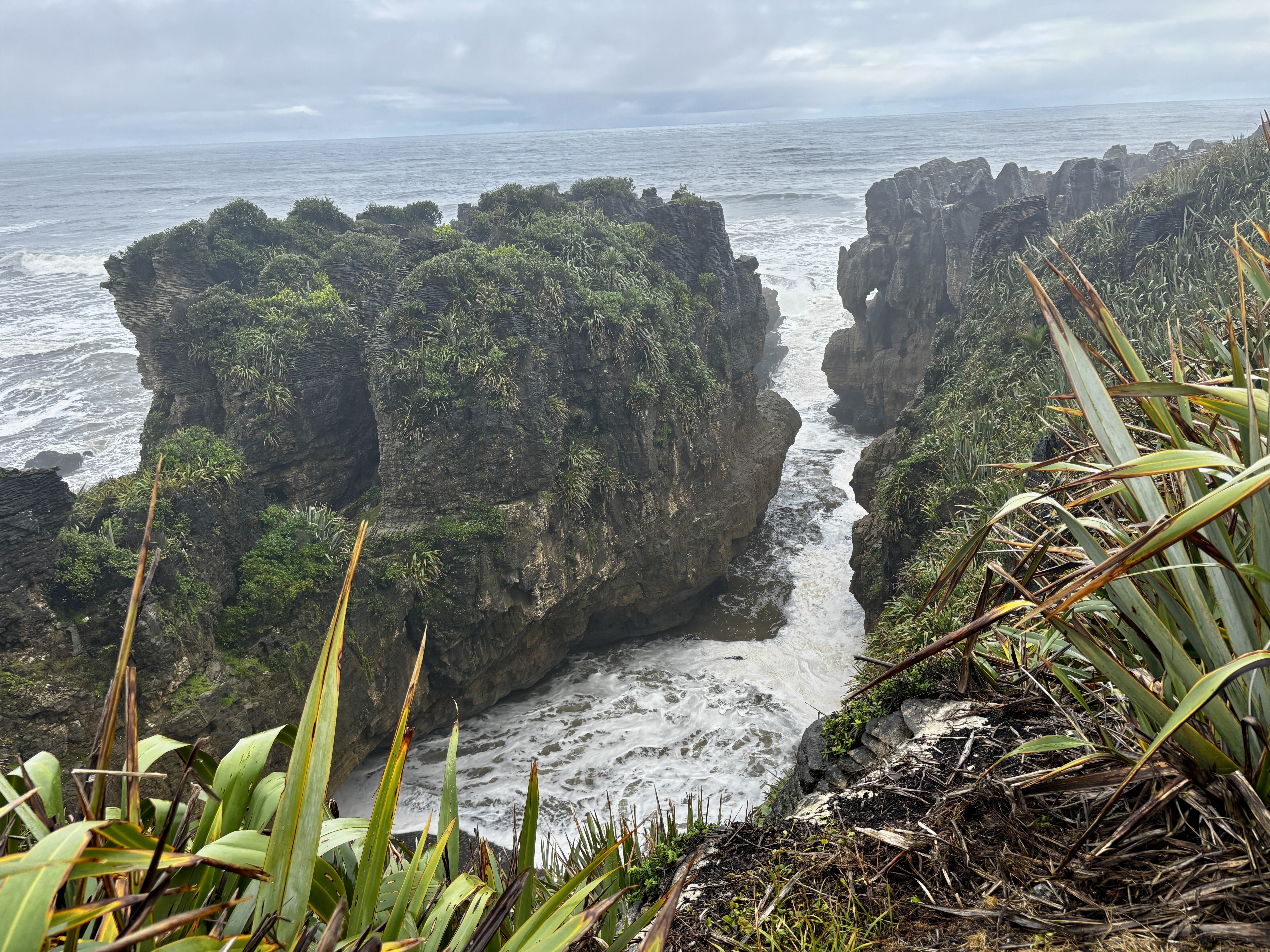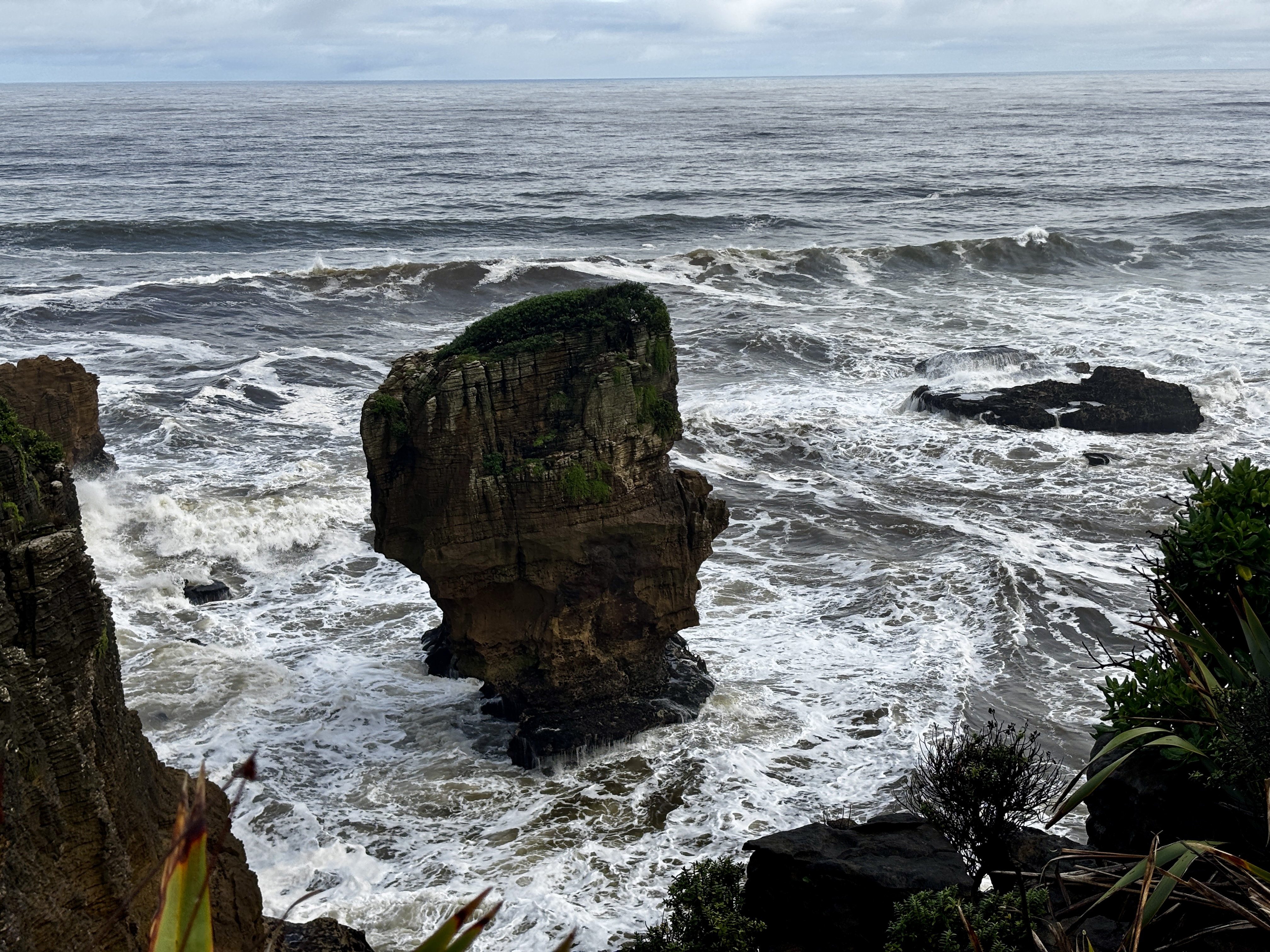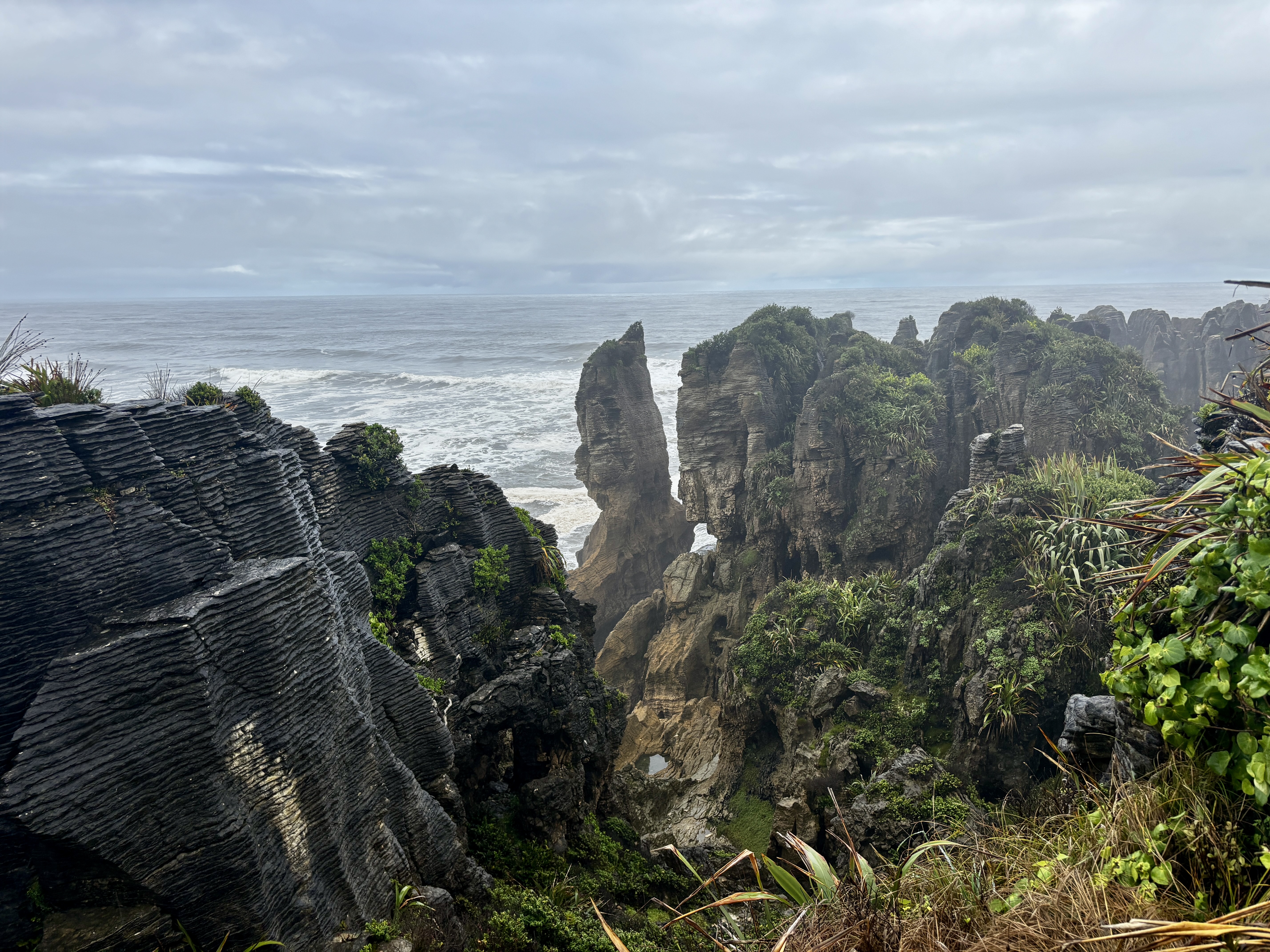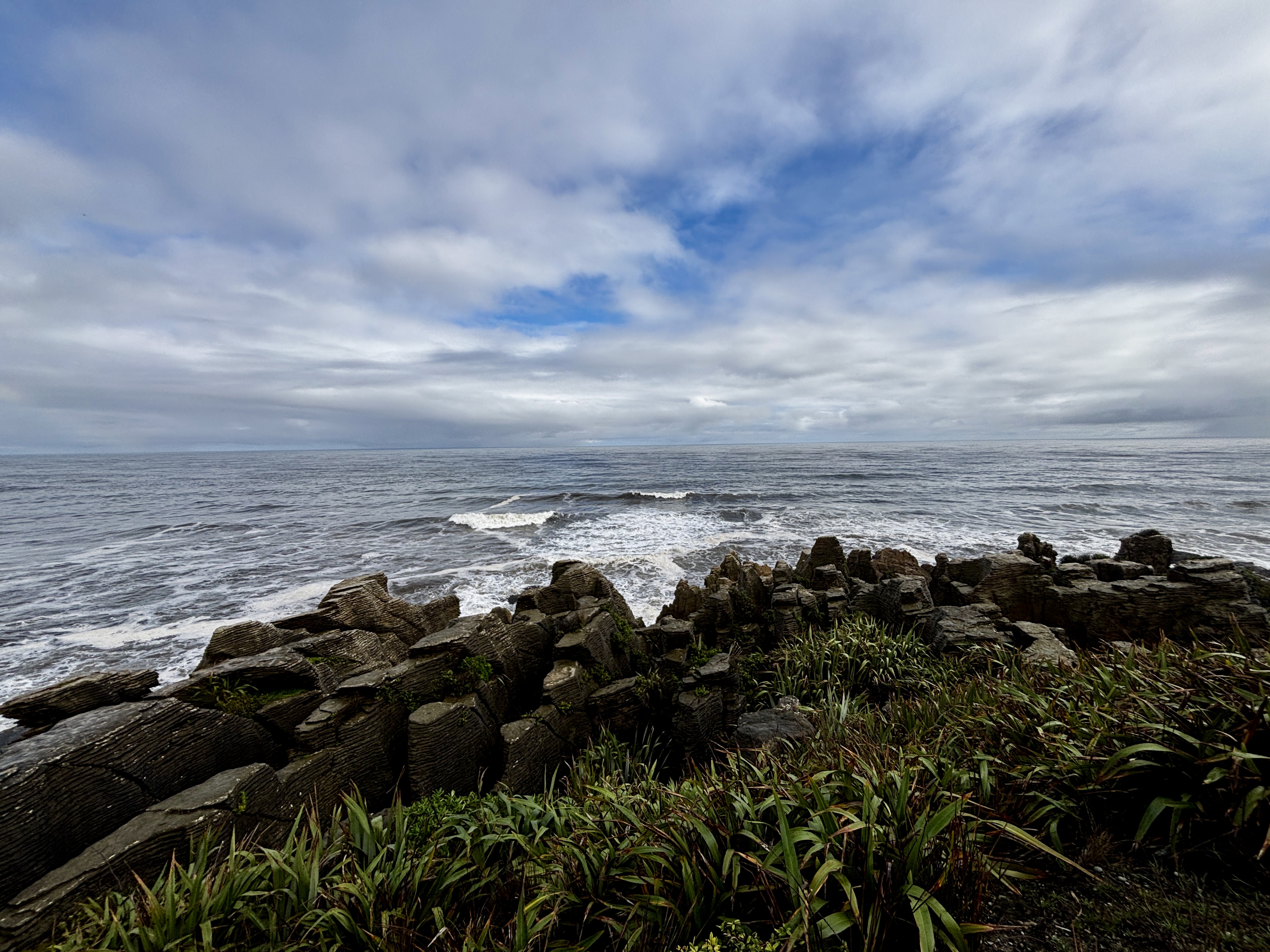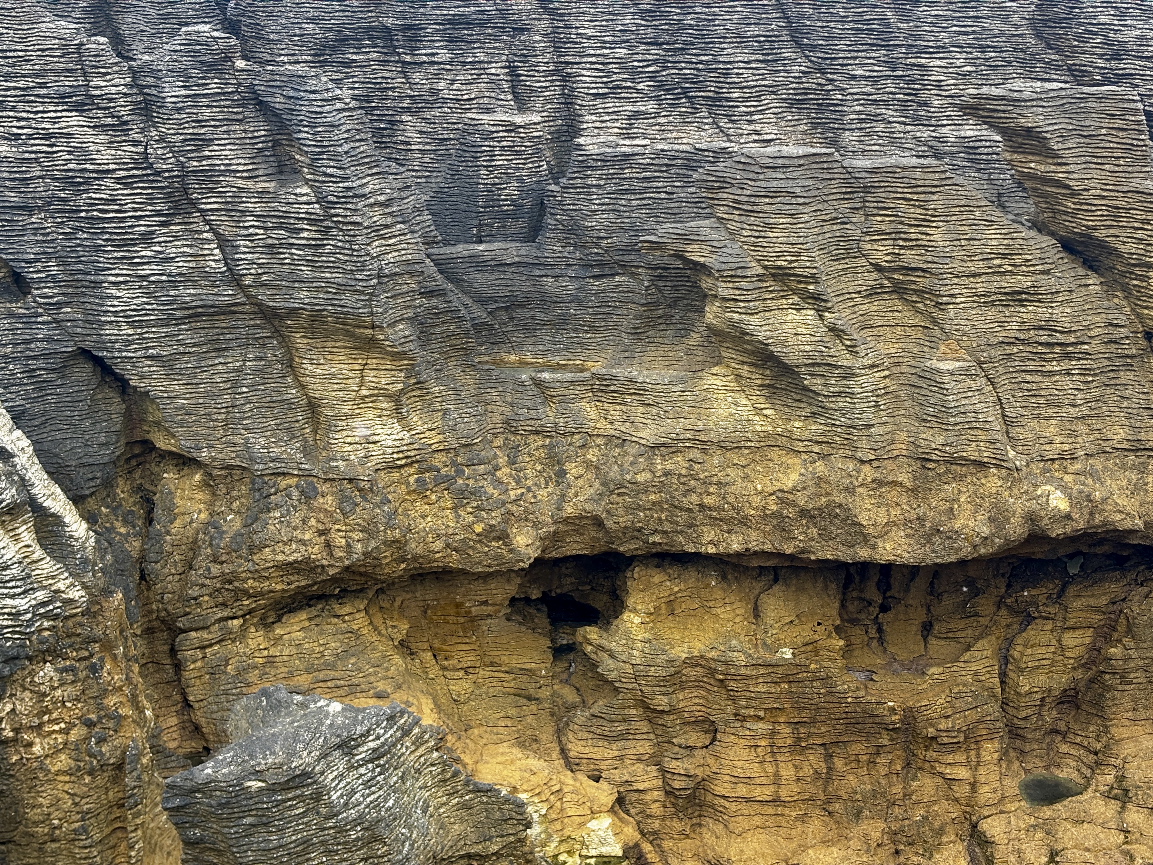 De la côte ouest, longer la mer de Tasman jusqu’à ce qu’elle vienne percuter le Dolomite Site et ce qu’on nomme ici « Pancakes Rock »— comme si l’érosion n’avait donné naissance qu’à de mauvaises plaisanteries pour touristes, quand les Maoris parlaient de Punakaiki, et dans leur mot on entend la bouche de la mer et le battement lent des mondes qui s’effacent — nous n’en verrons pas la fin, même en les regardant patiemment s’effondrer.