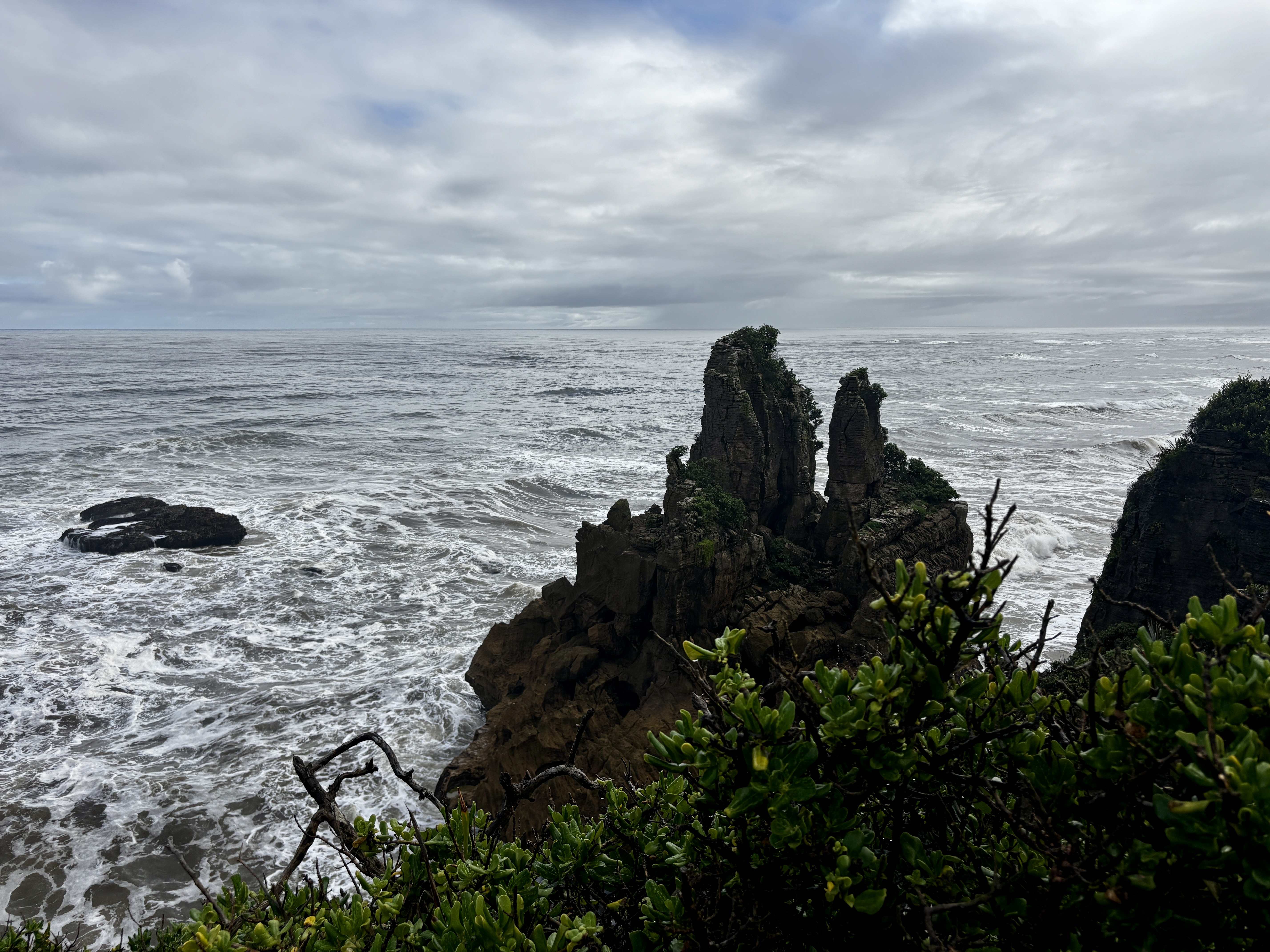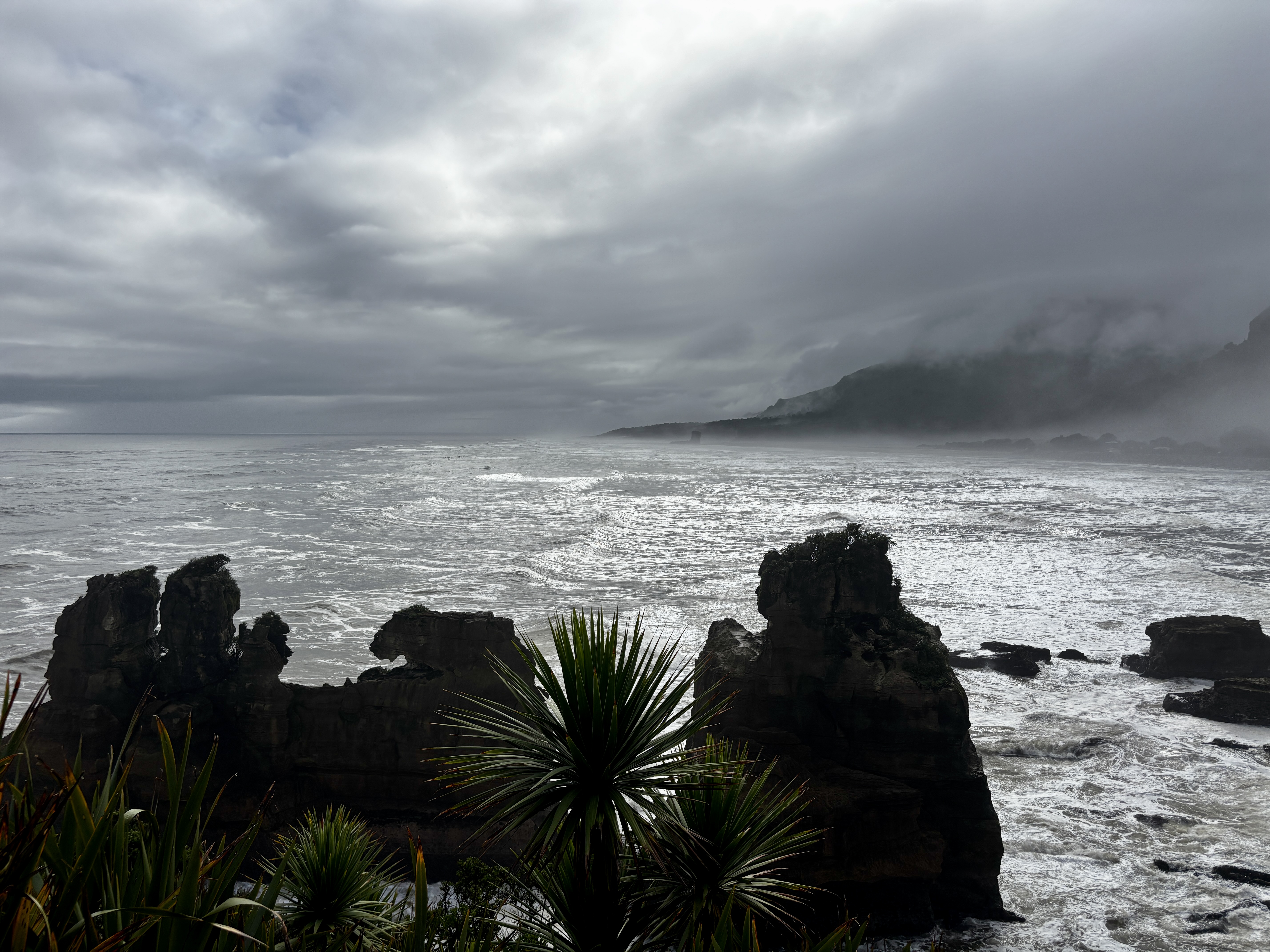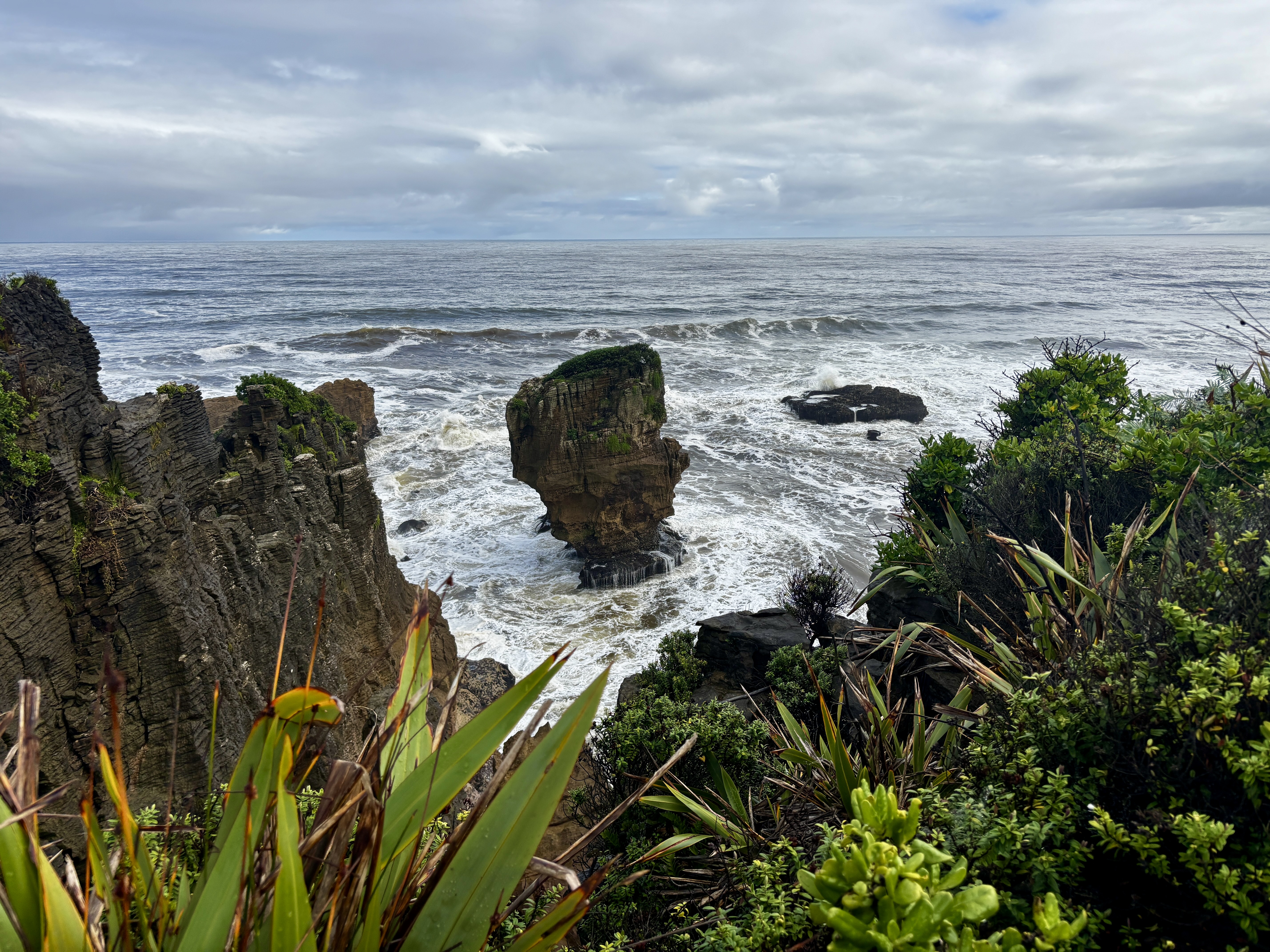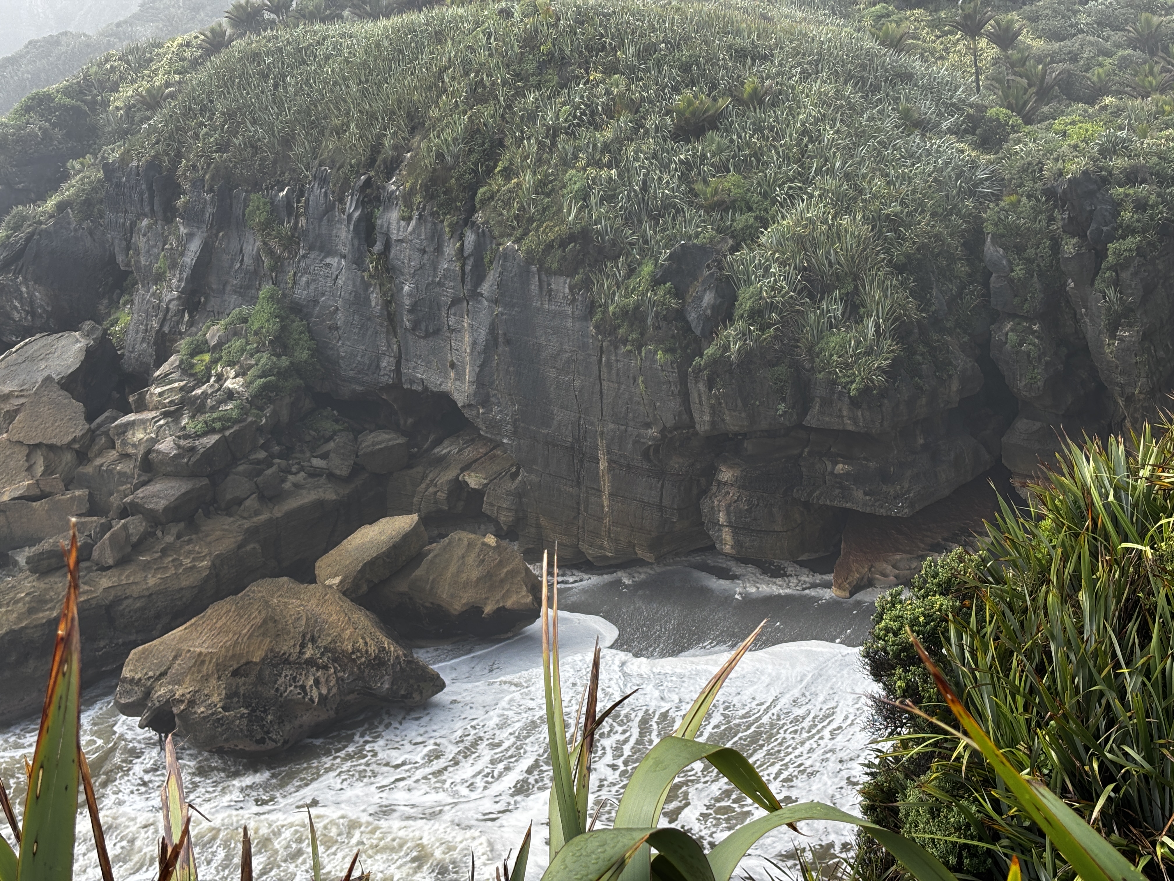 De la côte ouest, longer la mer de Tasman jusqu’à ce qu’elle vienne percuter le Dolomite Site et ce qu’on nomme ici « Pancakes Rock »— comme si l’érosion n’avait donné naissance qu’à de mauvaises plaisanteries pour touristes, quand les Maoris parlaient de Punakaiki, et dans leur mot on entend la bouche de la mer et le battement lent des mondes qui s’effacent — nous n’en verrons pas la fin, même en les regardant patiemment s’effondrer.