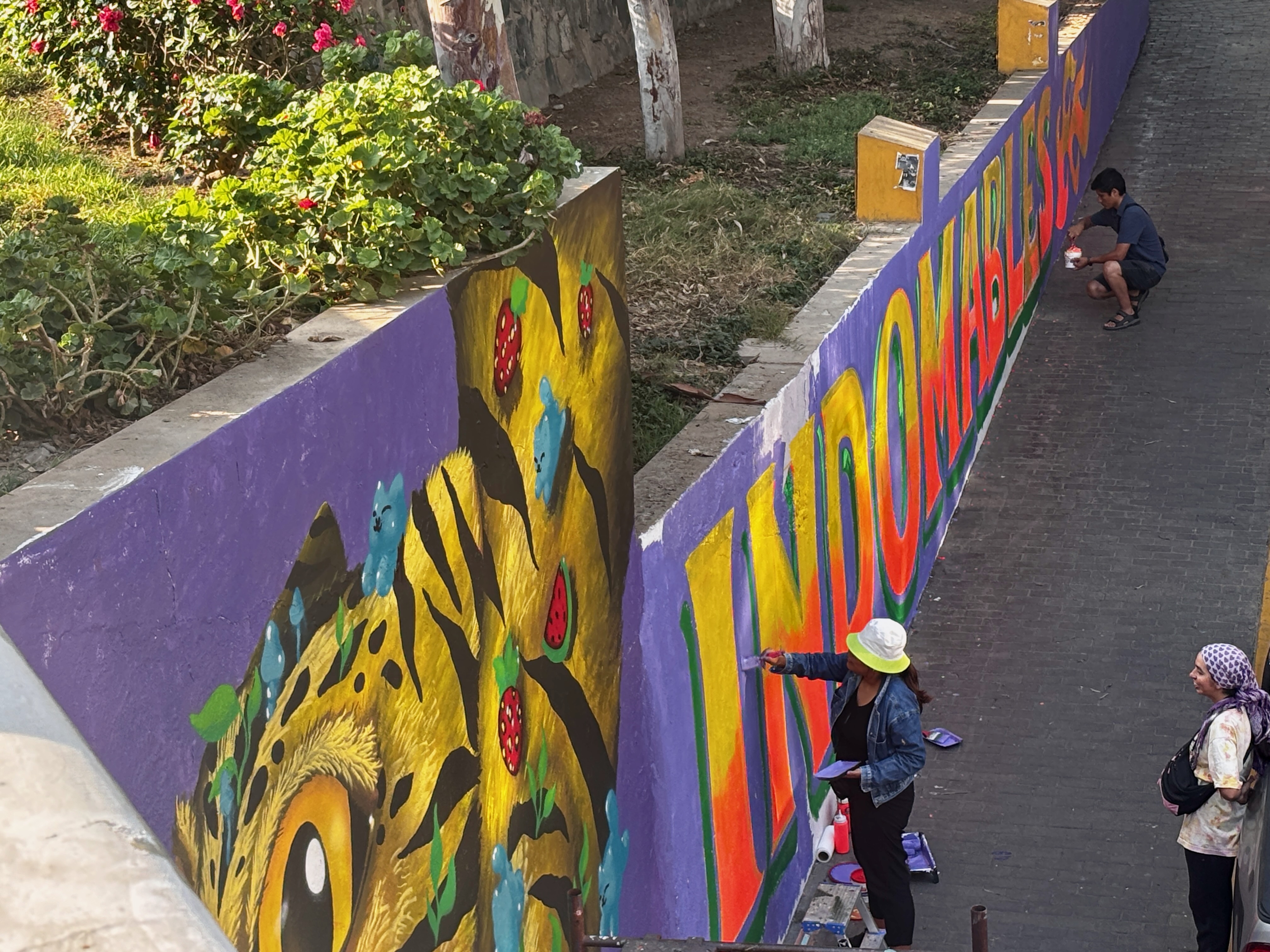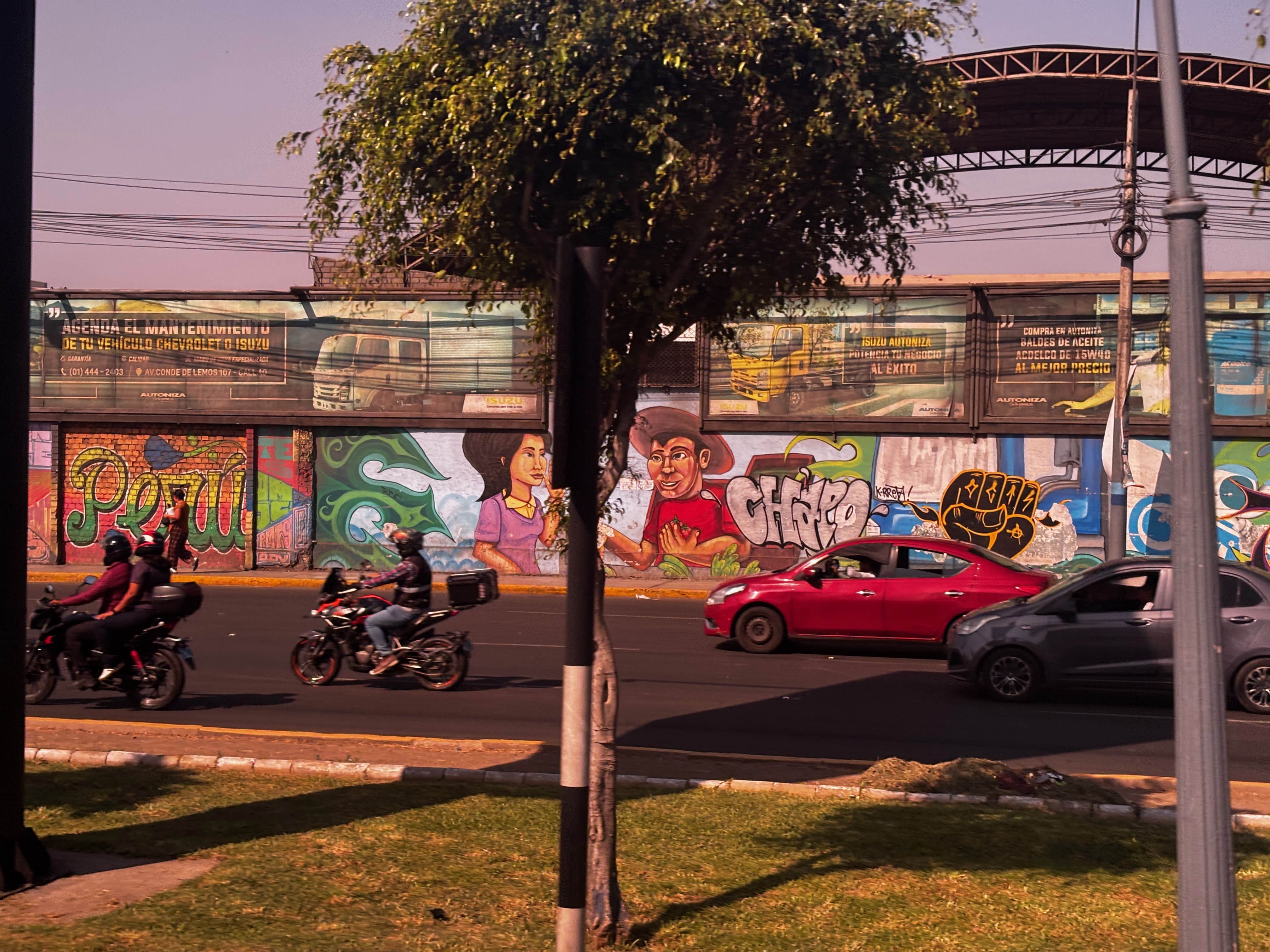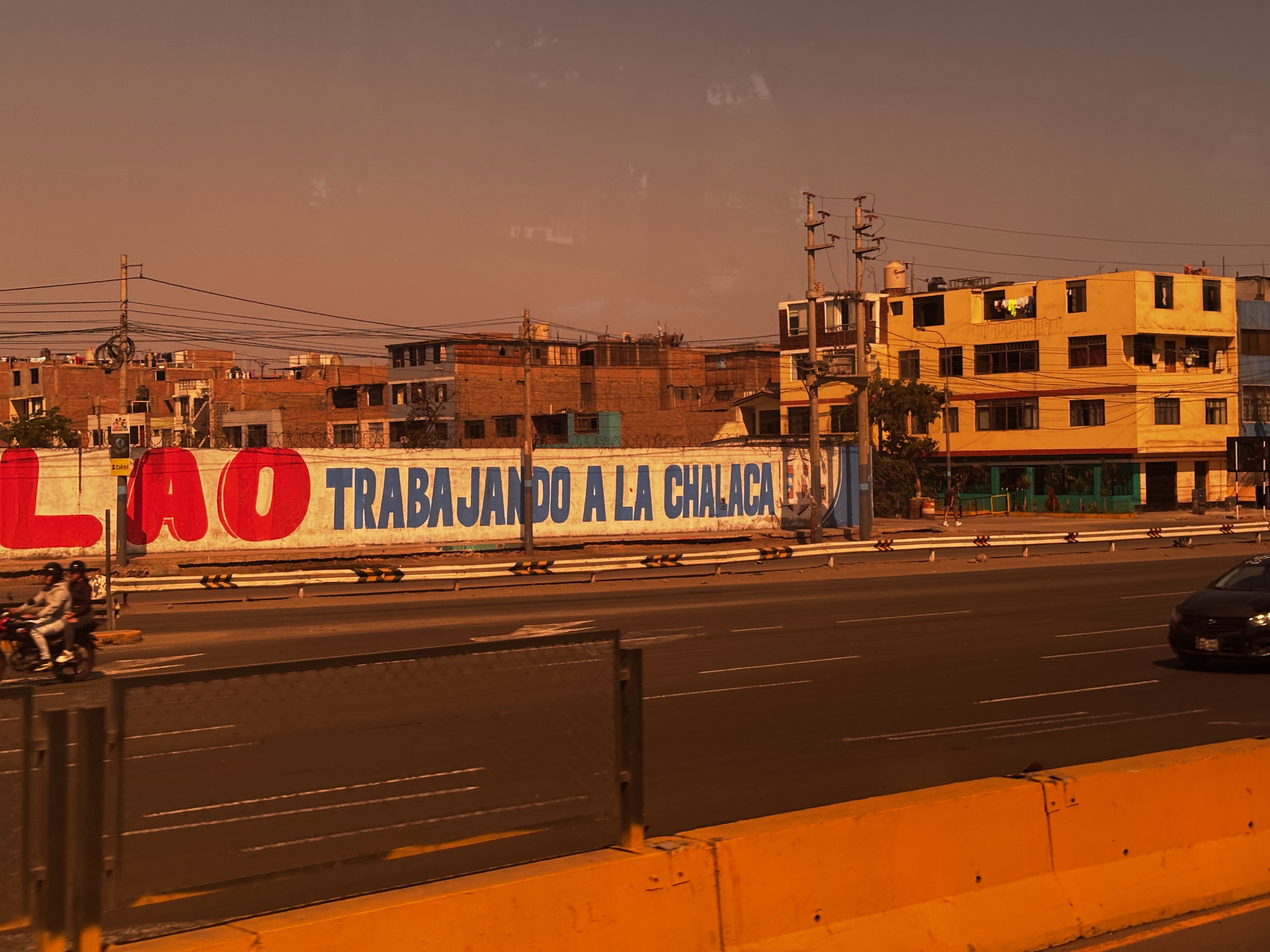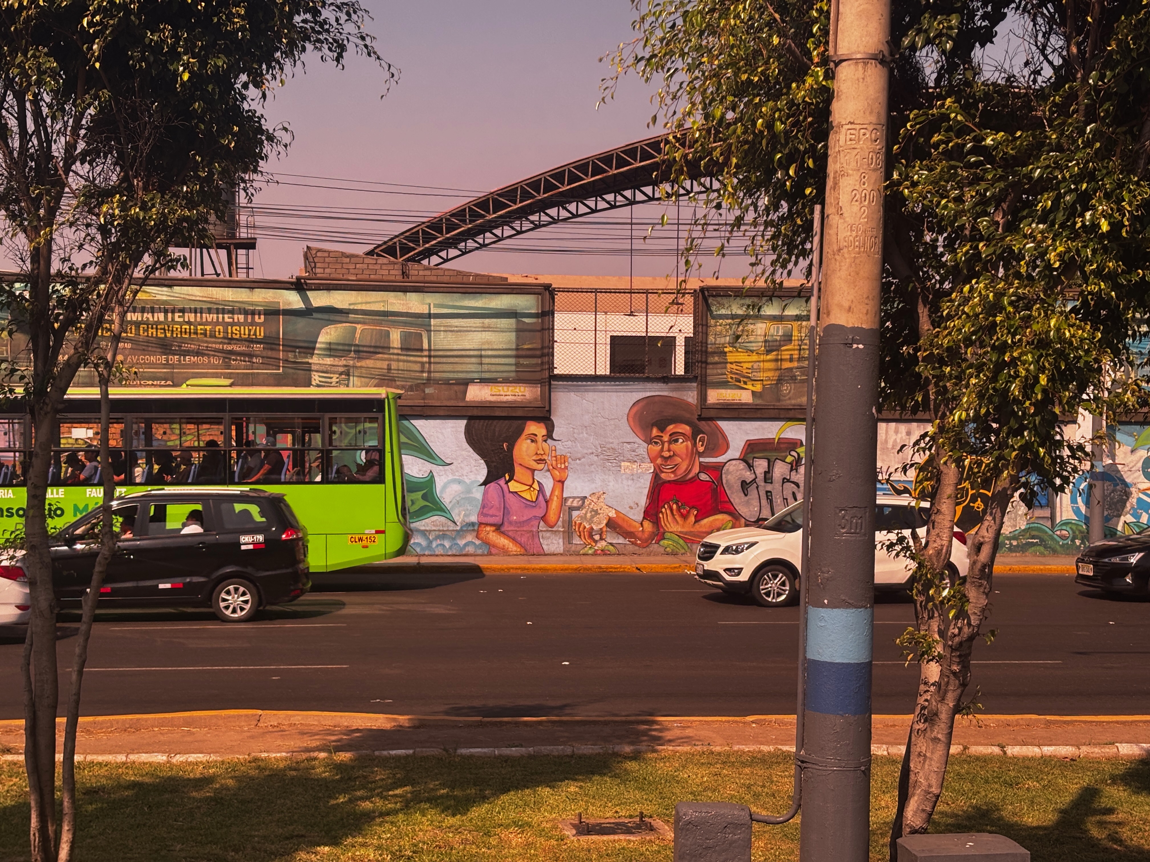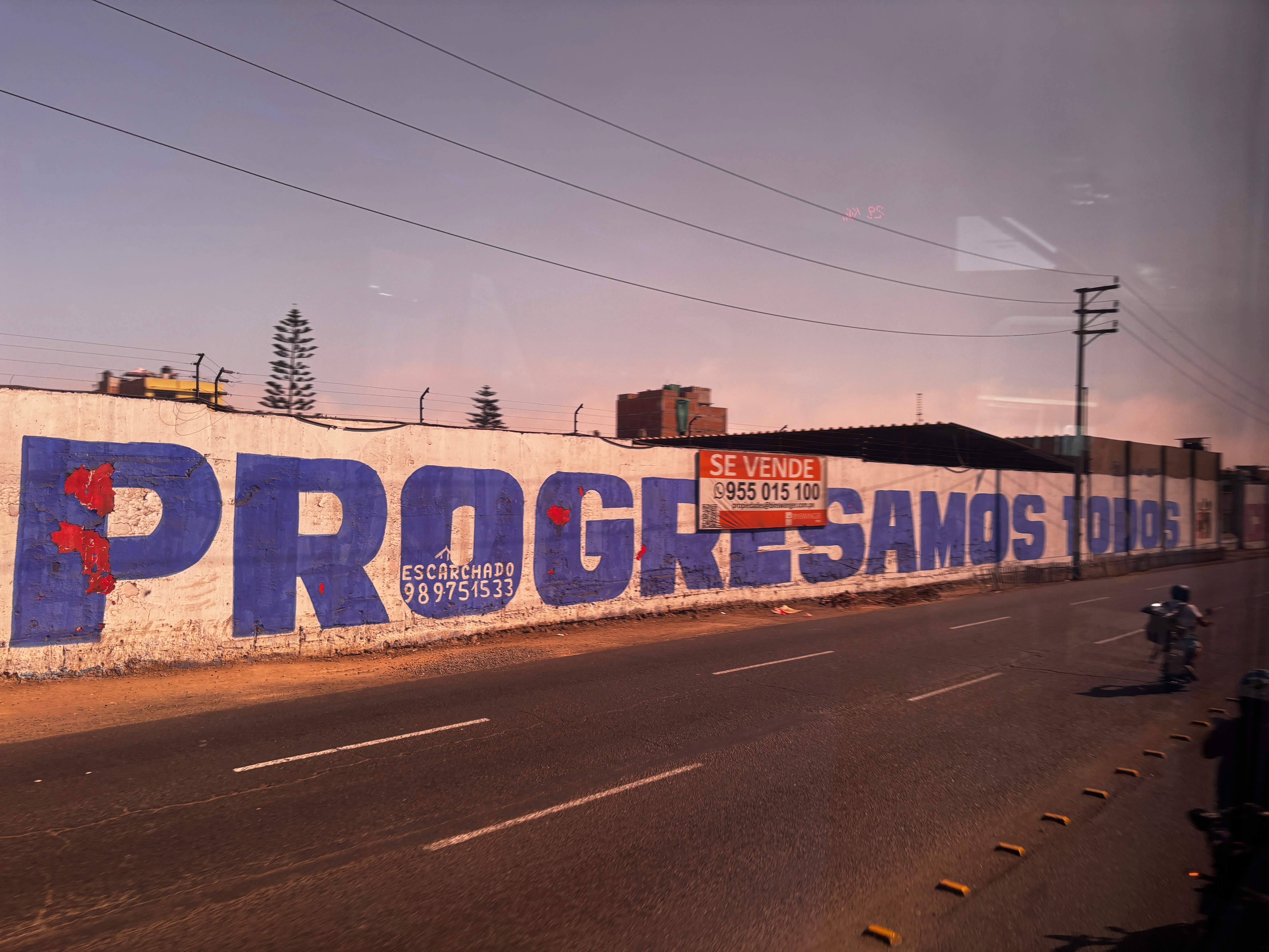 Dans le bus, les noms de quartiers résonnent comme des cartes effrangées : Faucett, Zapallal, Covida. Dans les rues, peinture criarde ou effacée, fresques murales aux couleurs vives, tôle rouillée, béton nu. La statue d’une Vierge semble veiller sur un carrefour qui ne croit plus à rien. Plus loin, sur les murs : PROGRESAMOS TODOS — tous ensemble vers un progrès introuvable, lancé comme une promesse en fuite.