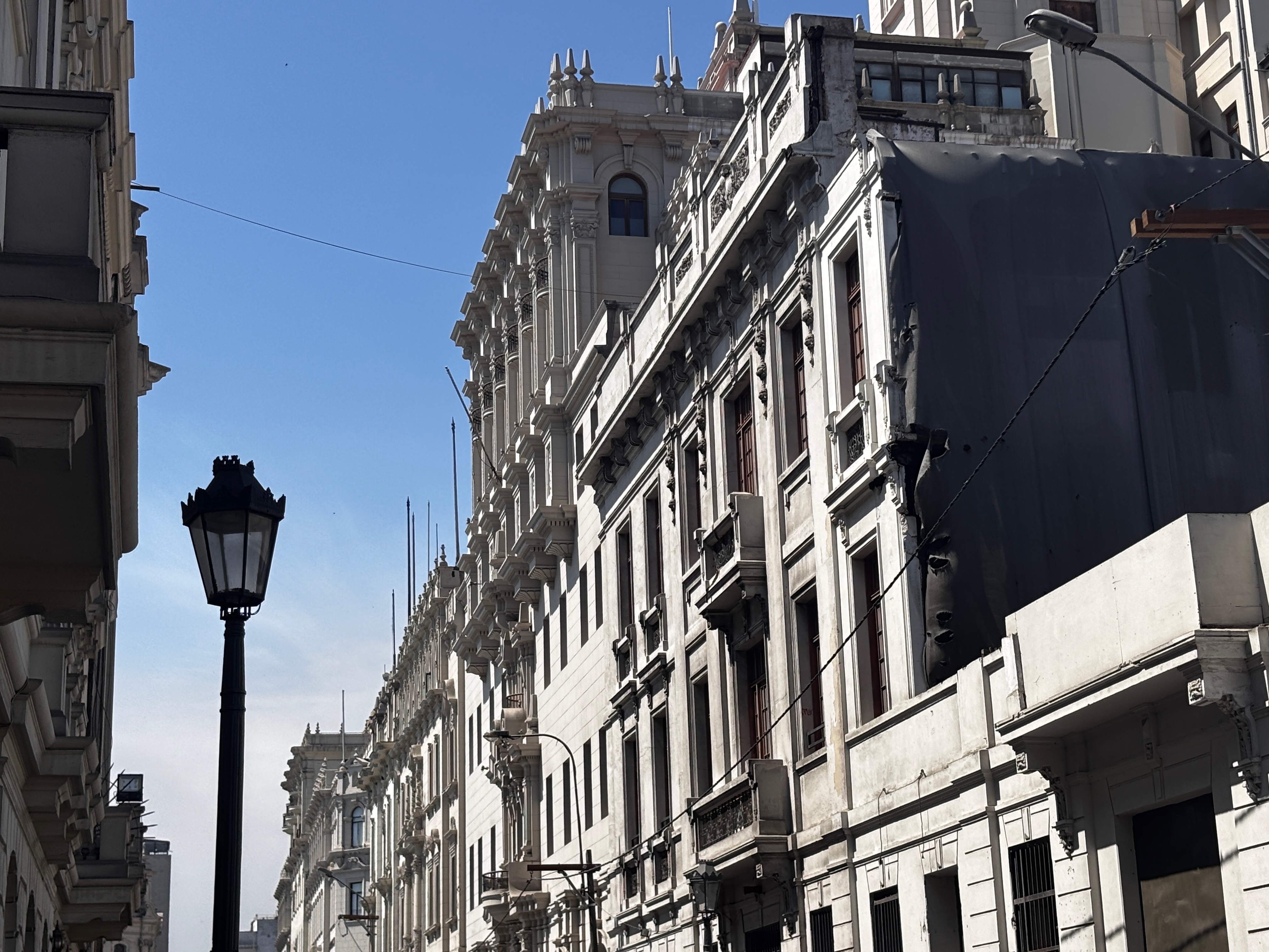 Dans Lima, le Centro aligne ses façades baroques sous le ciel terriblement bleu d’automne — balcons en bois sculptés mangés par les siècles, murs de boue compactés par l’oubli et fissurés comme des souvenirs trop pleins. Les édifices s’alignent, autant de livres fermés dont les titres ne cessent de s’effacer, les chapiteaux crient encore peut-être leur faste, mais dans une langue étrangère à la langue, et le plâtre tombe en silence. Ici, l’histoire debout reste sans mémoire ; elle s’appuie sur elle-même sans savoir qu’elle vacille. Des églises aux coupoles blanches s’élèvent au-dessus des trottoirs pendant que, figés dans leur gloire de bronze noir, les statues des anciens bourreaux trônent, absents à eux-mêmes — figures d’un empire rêvé, fondé dans le sang – oui, on marche bel et bien dans le cauchemar embrumé de Pizarro.