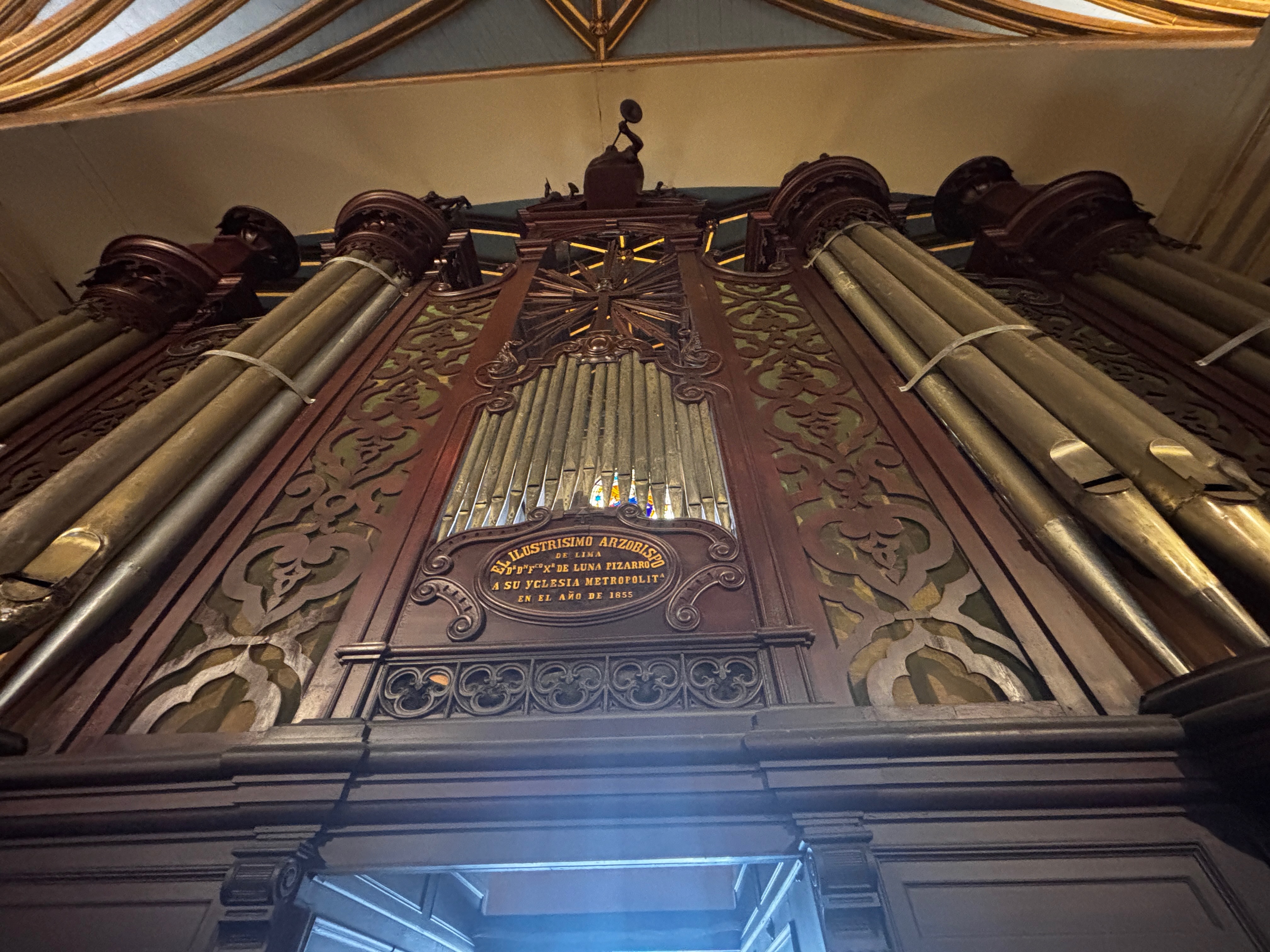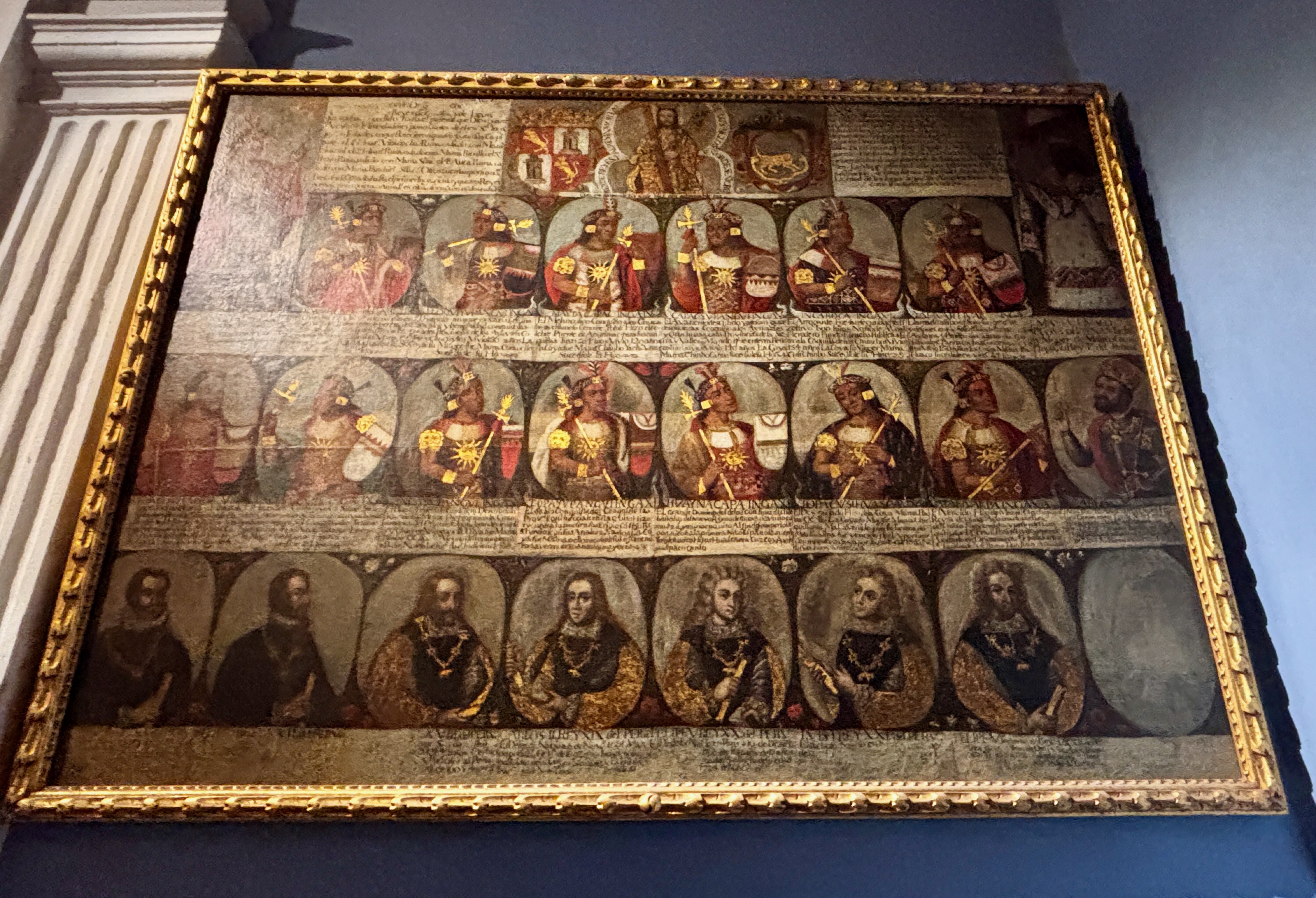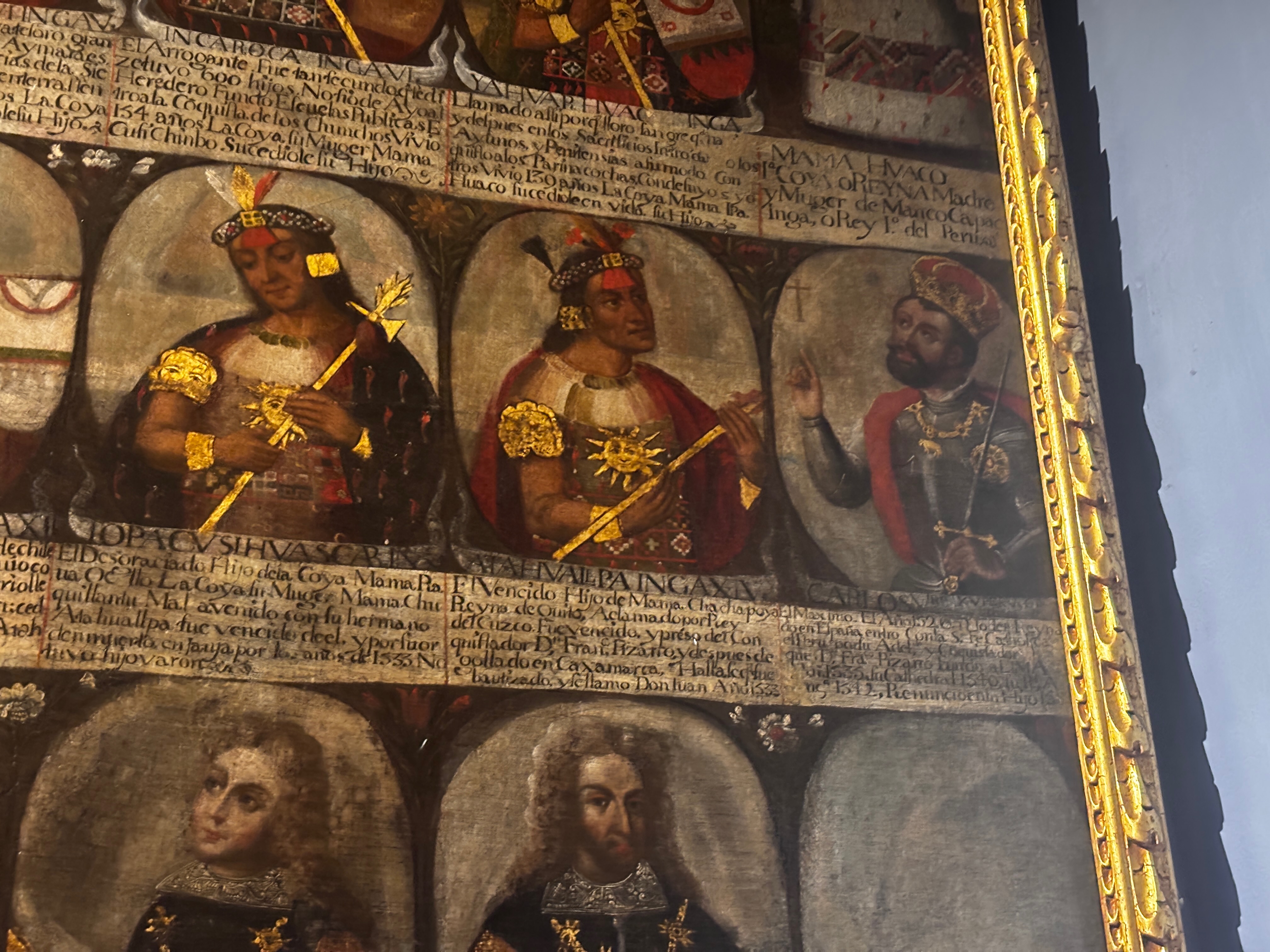 Sous la nef, les rois incas défilent jusqu’aux rois d’Espagne. Galerie d’effigies peinte à l’huile enchaînant les visages comme on égrène une défaite. L’histoire suspendue, alignée, regards tournés vers l’éternité ou l’oubli. Comme si, dans ce cortège, chaque roi déchu cédait la place à l’autre sans bruit — et qu’au fond, tous savaient que leur trône s’était dressé sur la disparition d’un monde.