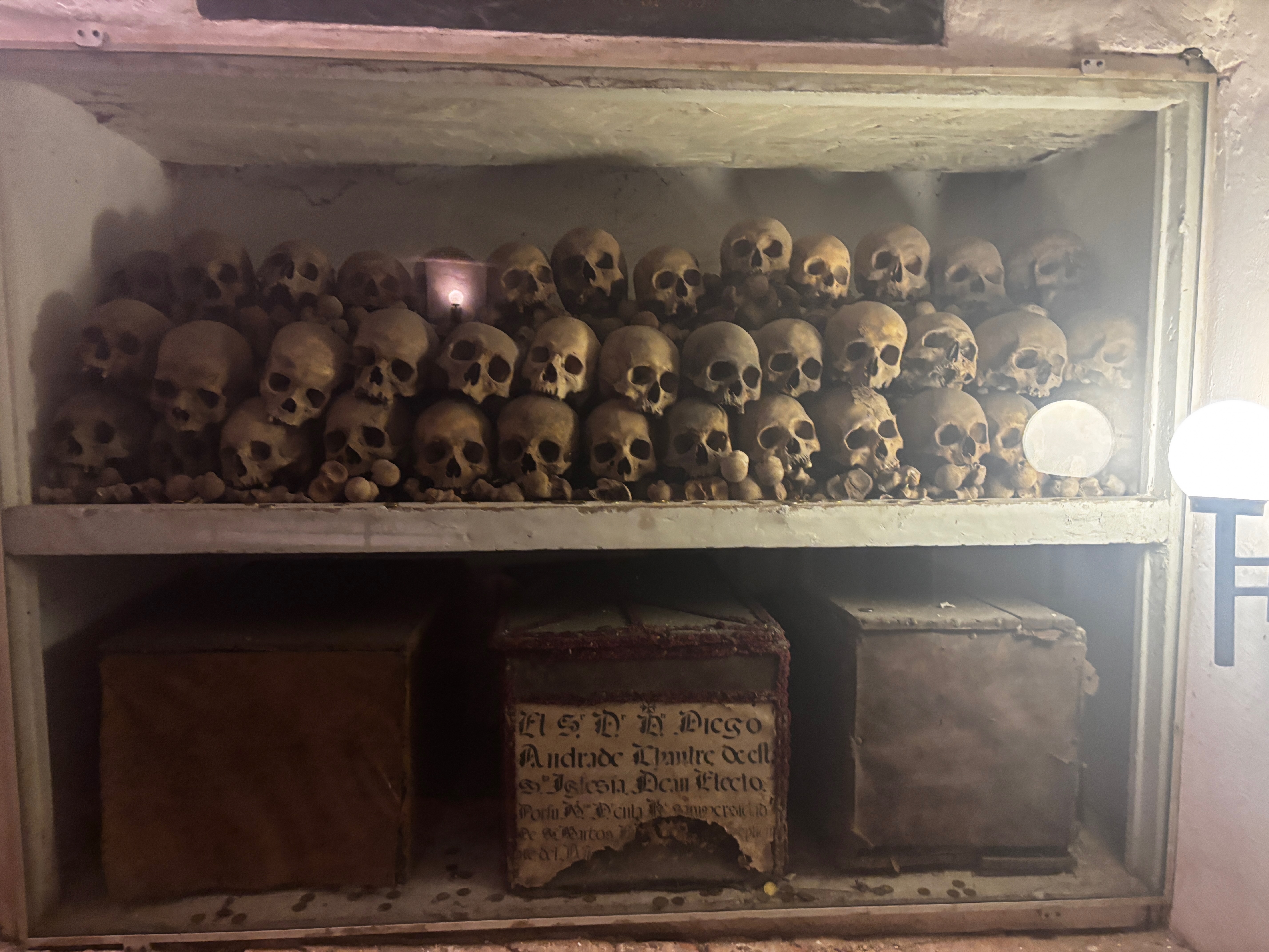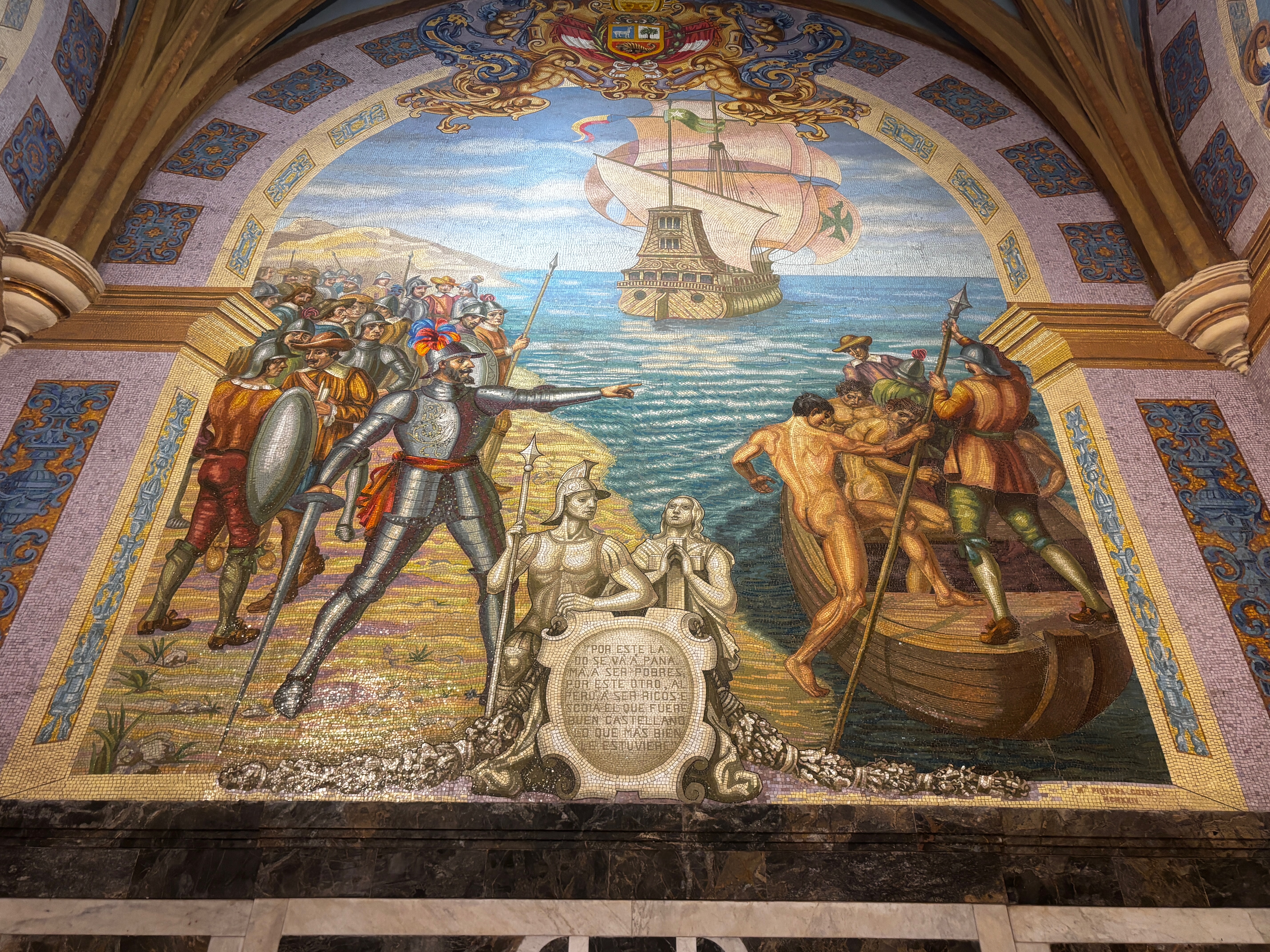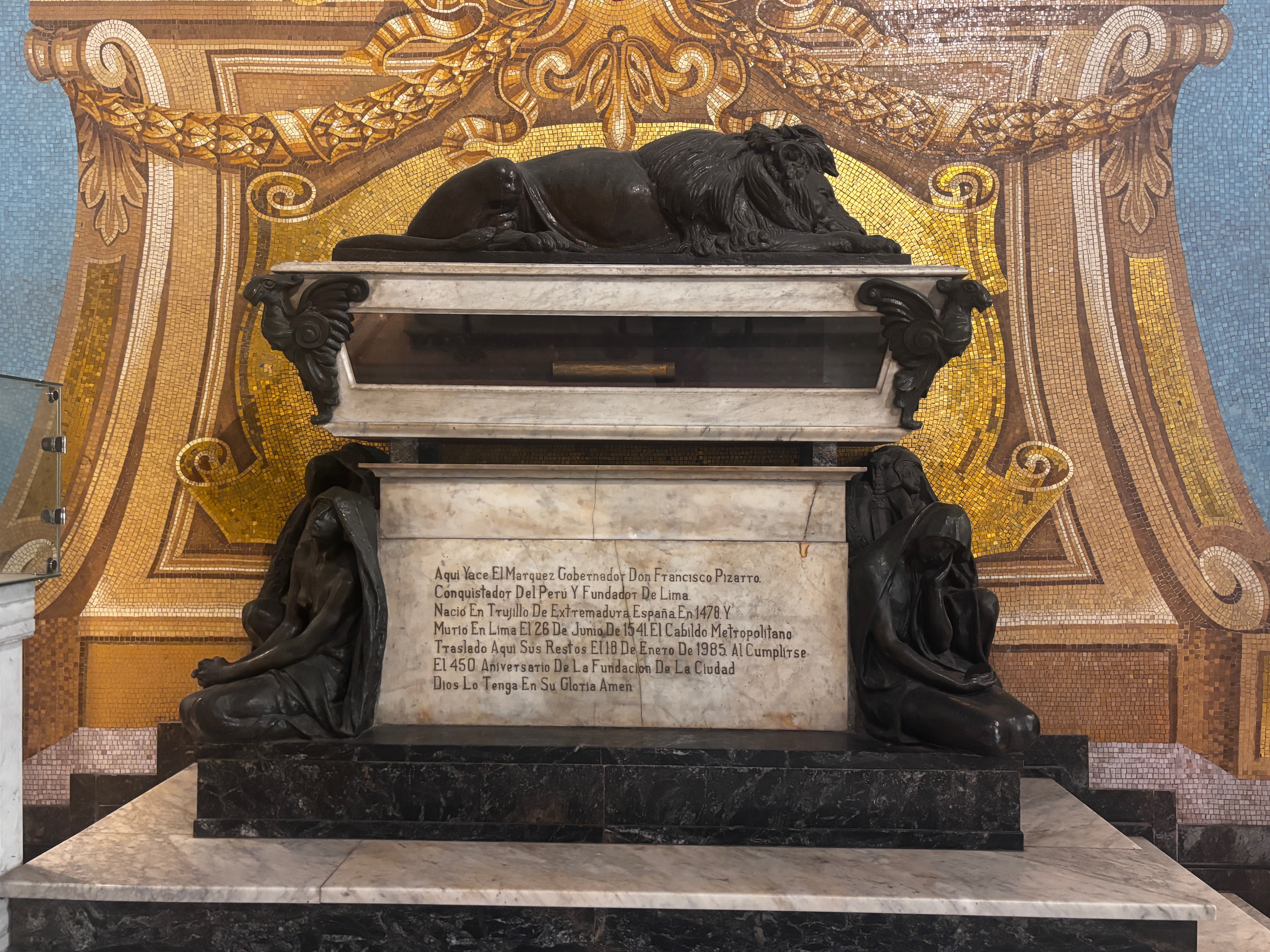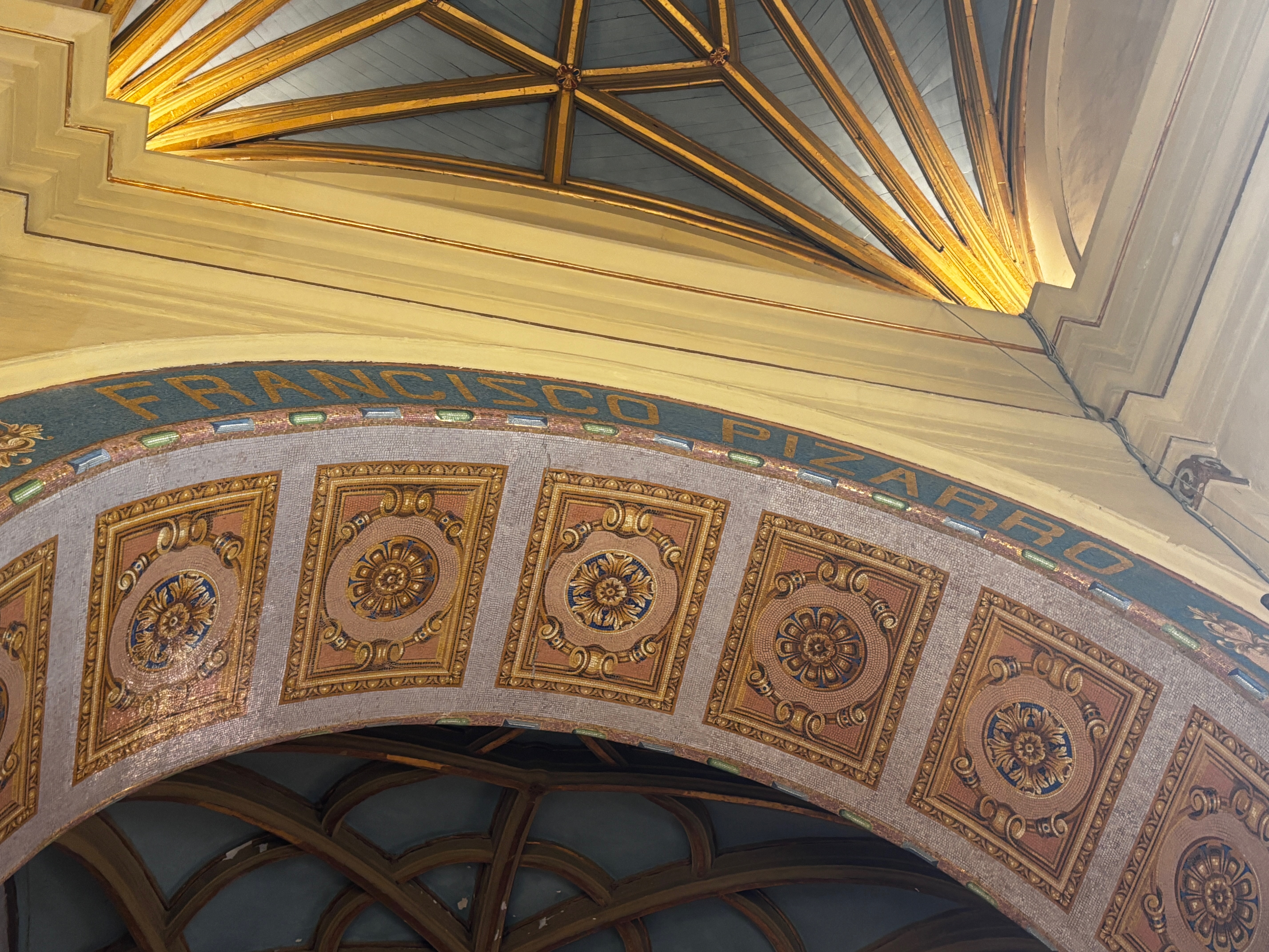 À l’ombre fraîche de la Catedral, Pizarro repose. Ou fait mine. Il y a ce sarcophage, ces ossements sous vitrine, scénographie presque grotesque autour du corps d’un soudard. Est-ce bien lui, le conquistador poignardé par ses pairs, ou un autre squelette exhibé comme une vérité creuse ? Il dort là, entre marbre et mosaïque, comme pour rappeler que la ville a été fondée sur un crime. Les murs racontent son épopée, les fresques rejouent l’arrivée des Espagnols comme une grande aventure — comme si ce n’était pas un massacre de plus. De temples rasés, de langues interdites, de dieux enterrés sous la mitre. Le sang coulé n’a pas disparu : il a simplement changé de vêtement. Et ce corps, dans la lumière dorée, ne pèse plus rien — que le silence d’une conquête mal digérée et ici vomi dans les ors.