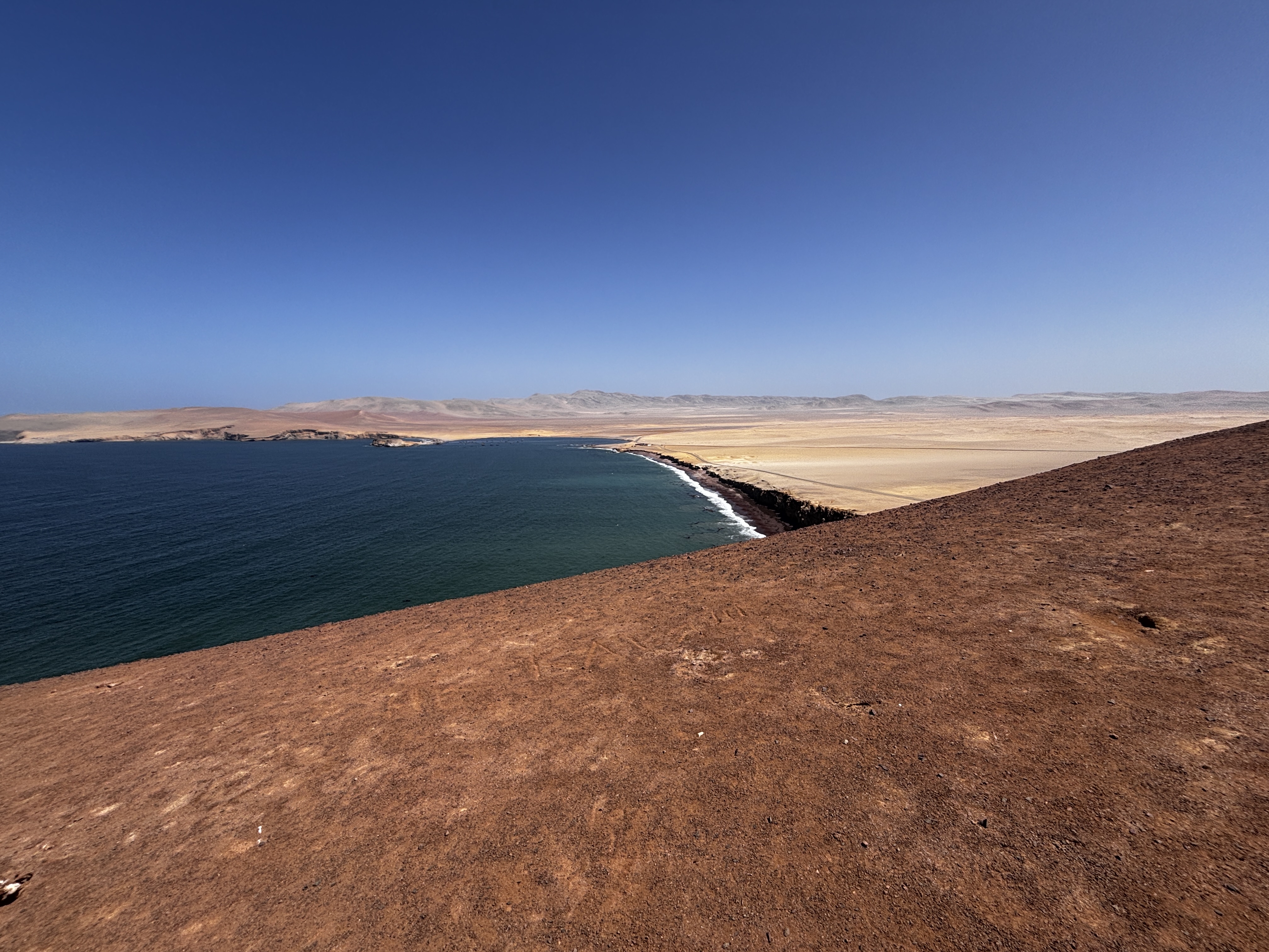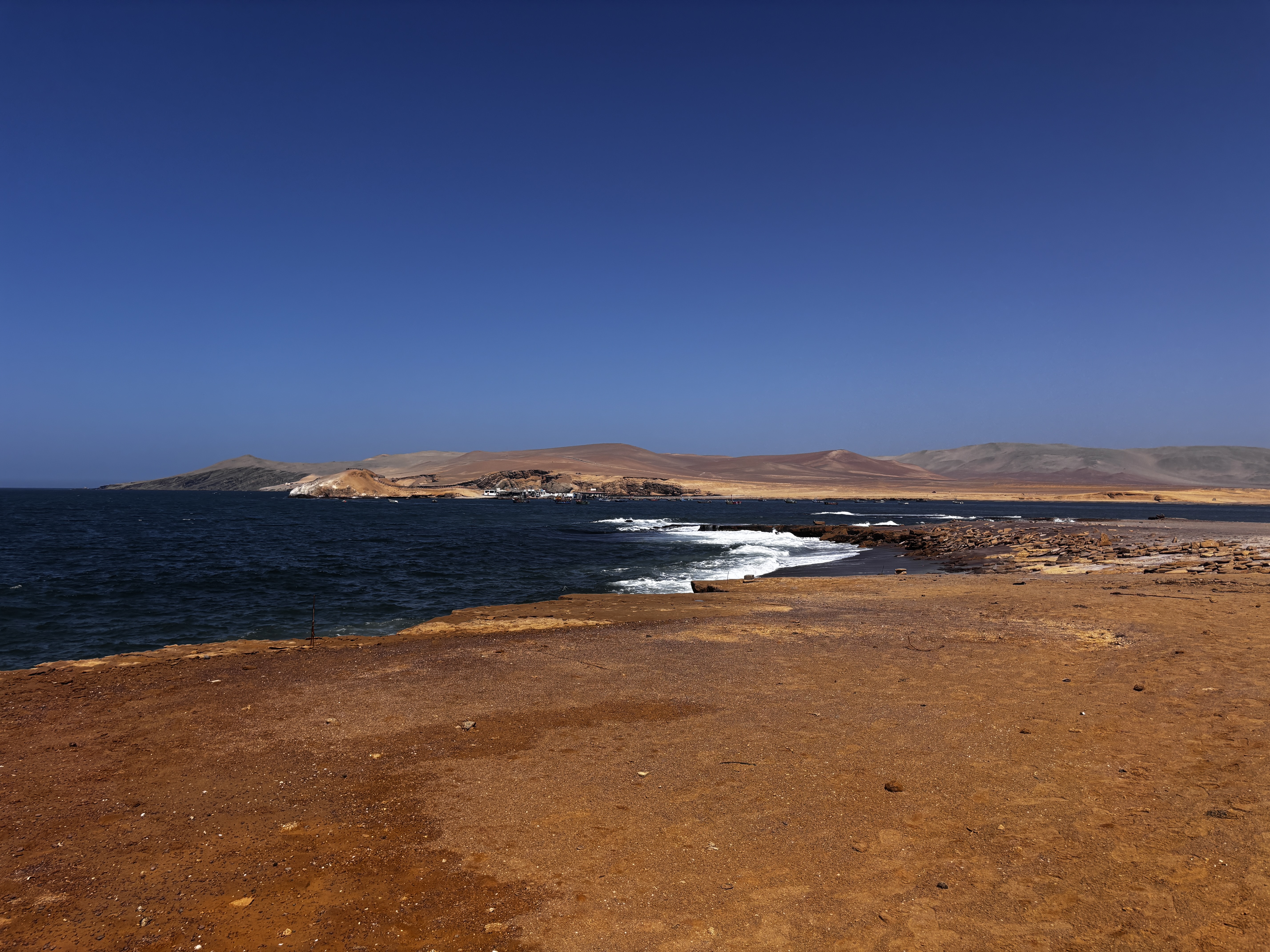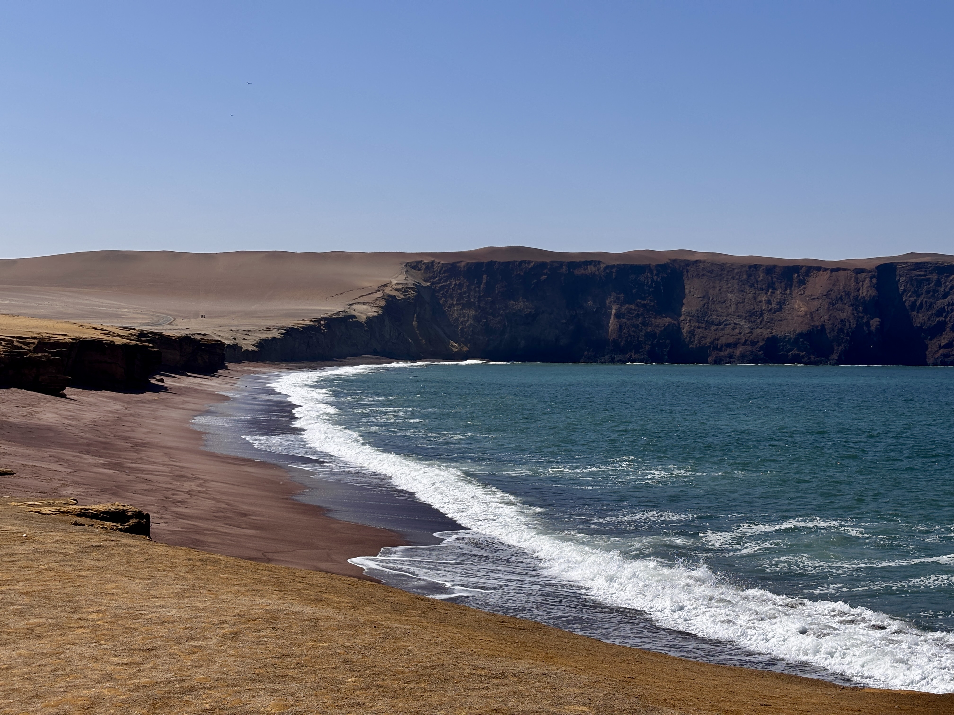 Revient la terre ferme – le désert de silence ocre et brûlé. Entre les falaises pâles et les vents salés de Paracas, surgit Playa Roja, une blessure dans la roche : une plage de sable rouge sang née, dit-on du frottement millénaire entre le granite rose et l’océan éternel, ou dans la coupure de quelques dieux mineurs sans nom. On dirait une terre ensanglantée par des souvenirs.