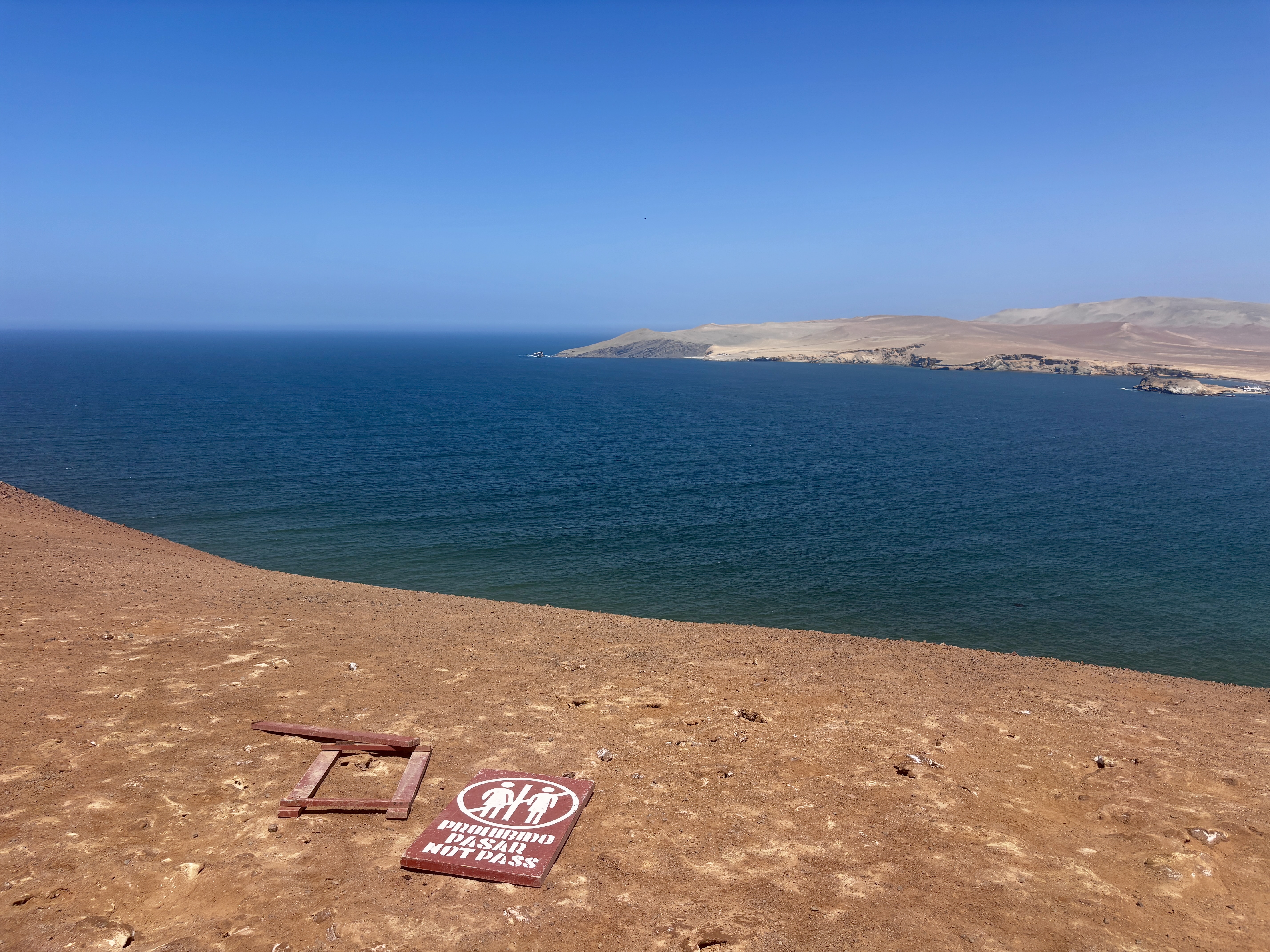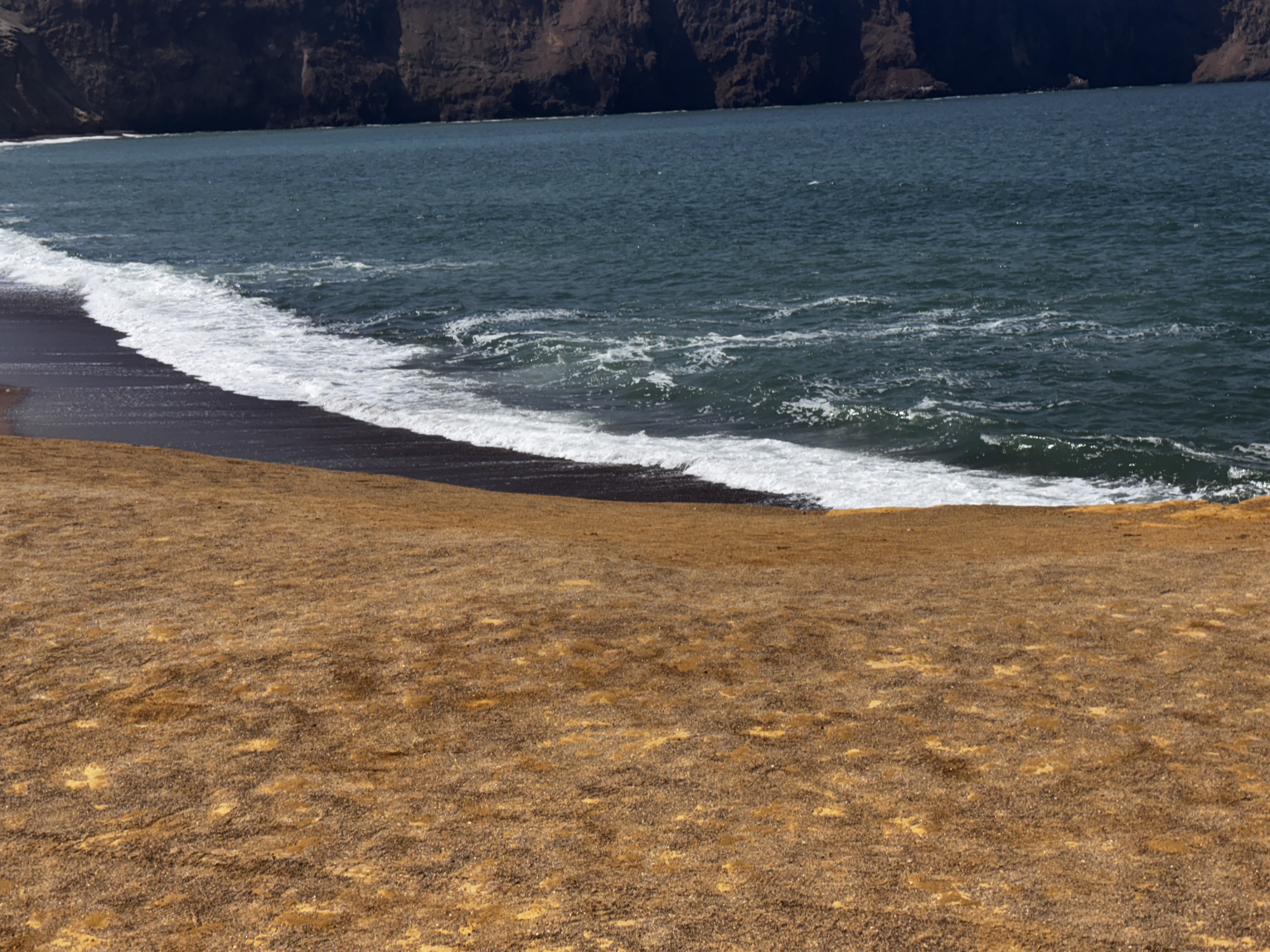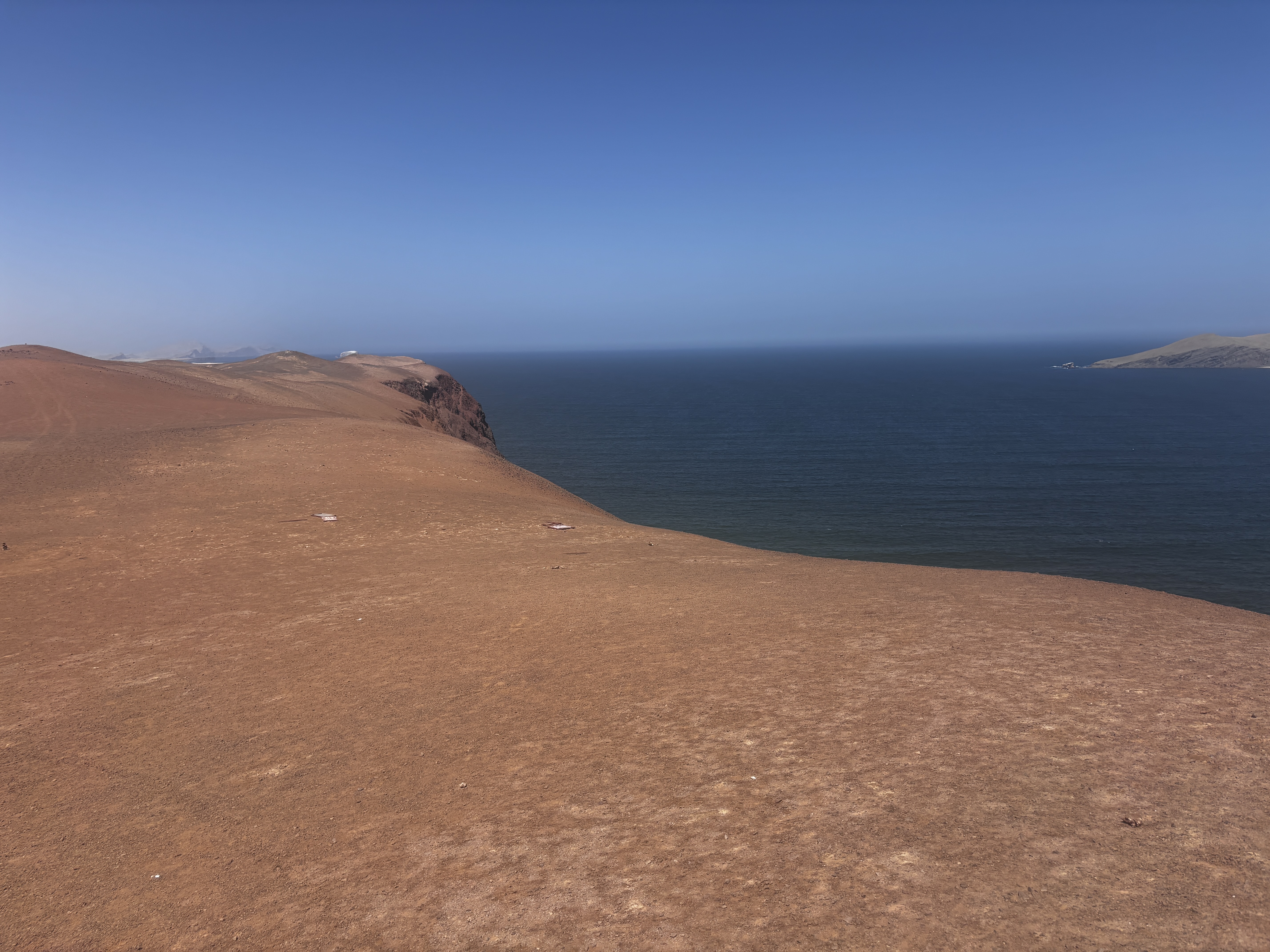 Revient la terre ferme – le désert de silence ocre et brûlé. Entre les falaises pâles et les vents salés de Paracas, surgit Playa Roja, une blessure dans la roche : une plage de sable rouge sang née, dit-on du frottement millénaire entre le granite rose et l’océan éternel, ou dans la coupure de quelques dieux mineurs sans nom. On dirait une terre ensanglantée par des souvenirs.