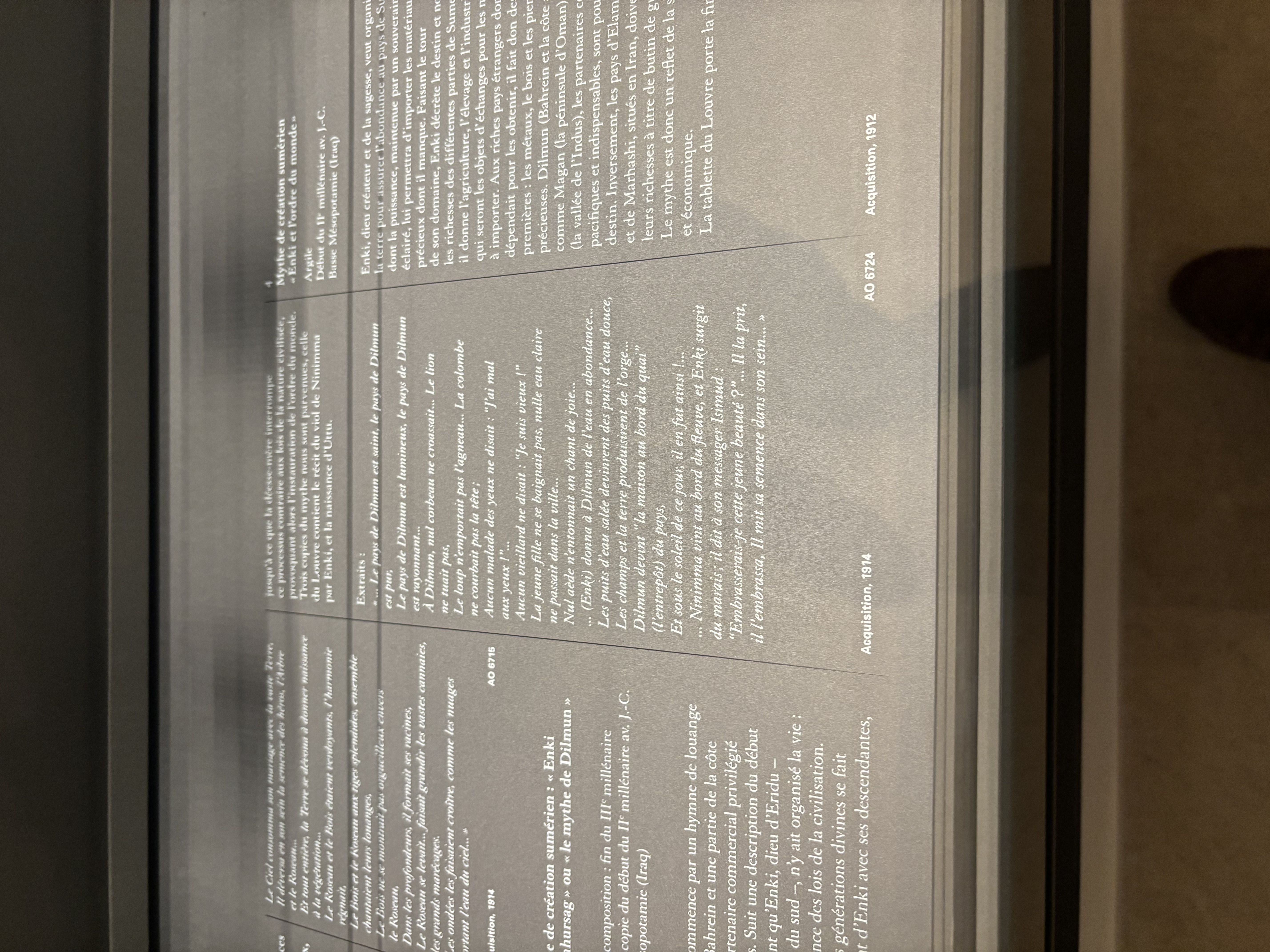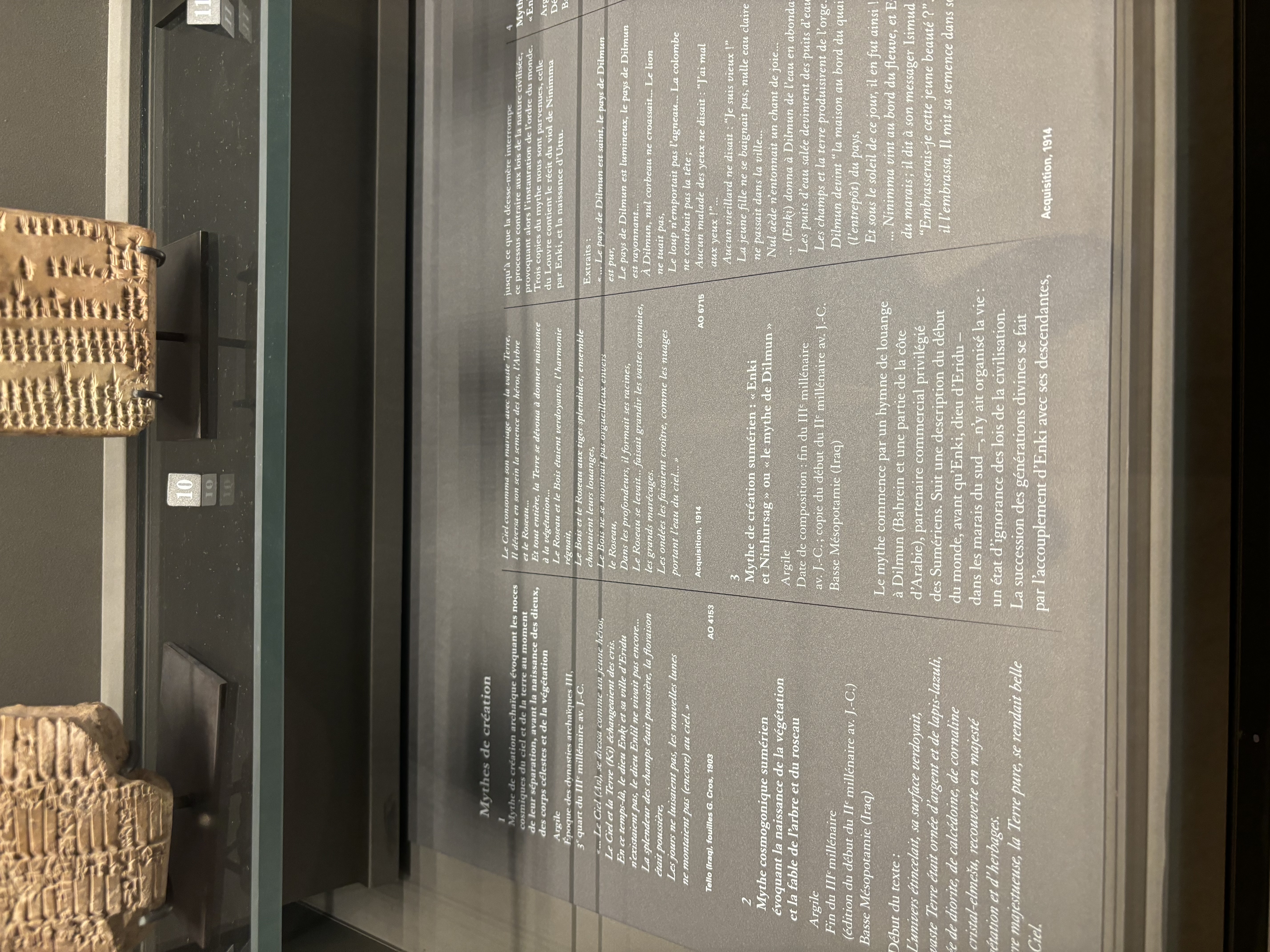 La salle des tablettes. Briques de terre minuscules et fendues qui portent l’immense – tiennent dans la paume d’une main cependant. Annales des règnes, listes sèches, qui bouleversent plus que les colosses. La fragilité du monde inscrite dans la terre. Signes qui disent : année où Hammurabi creusa un canal, année où il prit une ville. Des millénaires réduits à quelques gestes qui résonnent là comme s’ils venaient de s’écrire. Et c’est le cas. Et dans la vitrine d’à côté, d’autres gestes encore, plus anciens et foudroyants : tablettes qui rapportent l’Enūma eliš, récit babylonien des premiers temps – quand le ciel n’était pas encore séparé de la terre, quand l’eau douce et l’eau salée s’entremêlaient dans le chaos premier. Sur des fragments d’argile tachés, le combat de Marduk contre Tiamat s’inscrit, la fin des temps aux premiers mots, la naissance des dieux, et l’arrachement du monde à la nuit — et la nuit qui se dit dans les mots du jour. Premier récit des commencements du récit. Dans ce silence de verre, le frottement du roseau sur l’argile humide. Le monde qui s’invente chaque seconde à nouveau devant soi.
