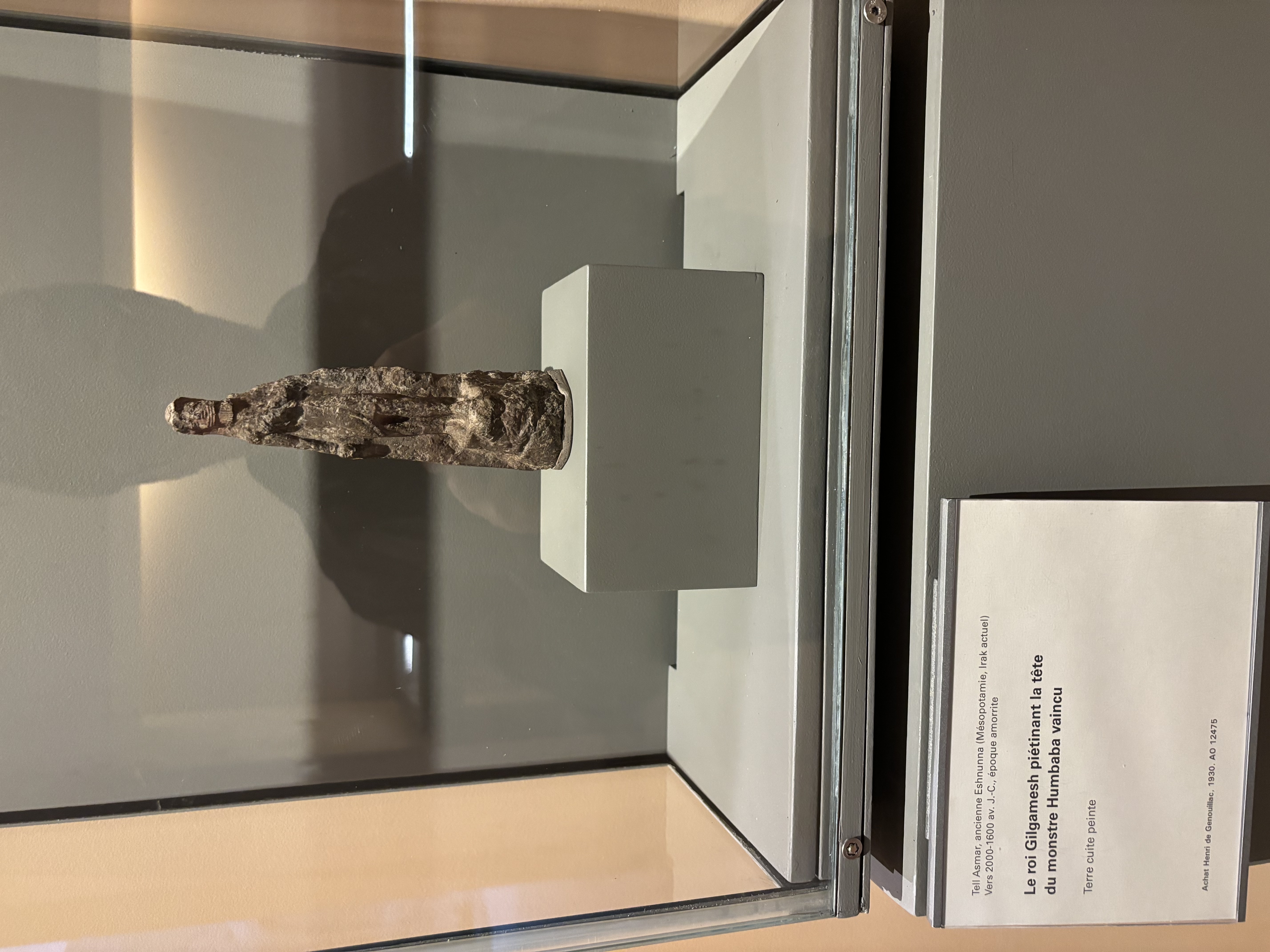 Puis soudain, Gilgamesh. Non l’épopée, non l’infini des tablettes. Mais minuscule statuette : Gilgamesh debout sur la tête de Humbaba. Le héros des songes, le roi surhumain, le voyageur des enfers — réduit à vingt centimètres de terre cuite, là, sous la vitre blindée à l’abri des balles sur quoi mon reflet se dépose. La force sans mesure surgit depuis ce corps fragile, ce geste figé. Grandeur dans sa petitesse même qui porte, en miniature, l’infini de son mythe. Et comme il semble doux, aussi, le héros terrible, le visage gentil, la pitié qu’il inspire — quand c’est peut-être de nous qu’il prend pitié, ce demi-dieu qui sait déjà ce que nous ne savons pas.