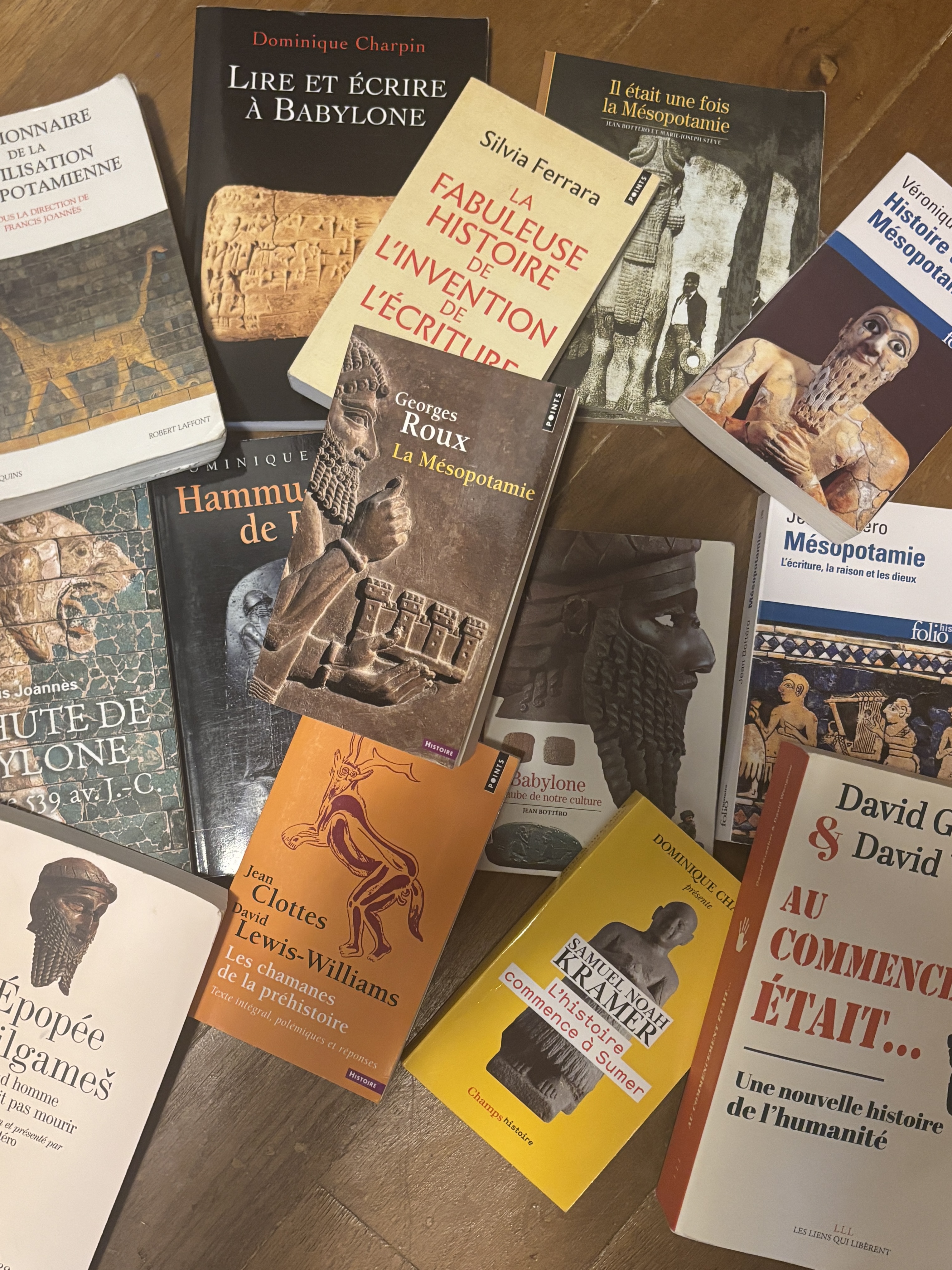Ce qui reste — des livres épars sur le sol comme ils l’ont été, ces années, en moi. Ce qui est le plus précieux après l’écriture d’un livre tient peut-être à ce qui nous a conduits vers lui : en partie, les livres alliés de ces temps dans quoi chercher des forces, ou le chemin du livre. S’agissant de cette « biographie » de Babylone, avoir fait flèche de tout bois : dictionnaires, épopées, traités d’archéologie, essais sur l’invention de l’écriture — ce soir, tout ce qui avait nourri pendant ces années l’écriture de Babylone gît donc là, dans ce désordre qui raconte mieux que je ne pourrai le faire ce trajet.