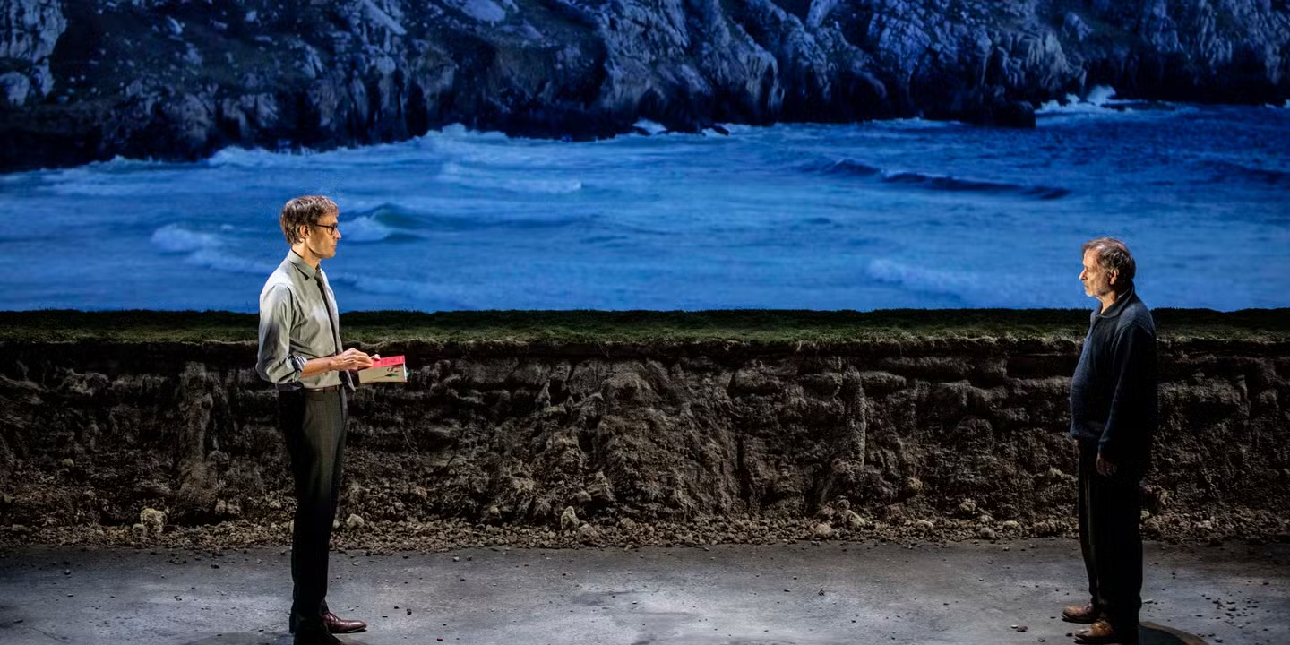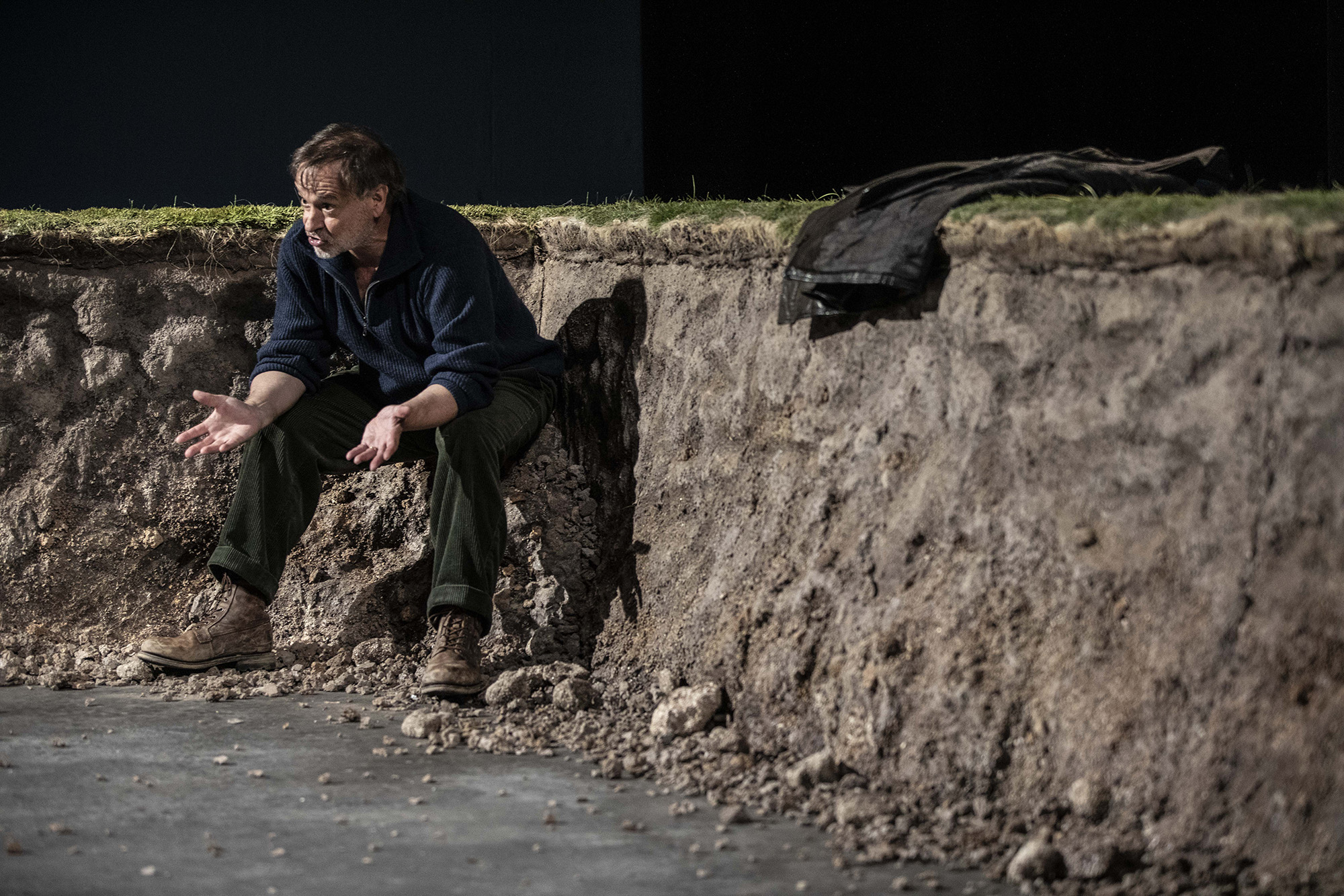 Sur le plateau, le lieu de la représentation — une cellule de commissariat de province, étroite et confinée — se déploie en un lieu représenté déréalisé : un chantier à l’abandon, avec son trou de terre dans l’herbe verte, un tombeau en friche où gisent les espoirs des hommes trop crédules. La situation d’audition de l’accusé devant son juge (interprété par le metteur en scène lui-même, Emmanuel Noblet, sobre et profond) se métamorphose ainsi en espace symbolique, où la contrainte carcérale et l’enfermement psychologique dialoguent avec la dépossession sociale et territoriale qu’incarne ce chantier laissé aux promesses trahies. Ce déplacement d’un lieu clos vers un extérieur apparemment vaste — la rade de Brest, la presqu’île transformée par les promoteurs et vite abandonnée — installe une tension entre enfermement et liberté illusoire, entre contrainte individuelle et dépossession collective. L’écran, qui diffuse de temps à autres des plans de la mer, accentue cette sensation d’espace ouvert, de respiration et de fuite possibles, mais toujours sous l’ombre du système qui broie. Emmanuel Noblet choisit ainsi la sobriété : dépouillé, le plateau est réduit à son ossature et renvoyé à l’énigme de son allégorie, scénographie faite silence pour que résonne la langue de Tanguy Viel — langue sans ornement qui épouse les contours d’une parole ordinaire et qui, par là même, rend visible ce qui trop souvent demeure hors-champ. C’est là que réside l’élégance de ce geste théâtral : refuser l’illusion spectaculaire pour laisser toute la place à cette langue patiente et latente, qui dit la misère sociale, les humiliations communes, la mécanique implacable par laquelle un homme est conduit jusqu’au meurtre. Le théâtre devient ainsi cette chambre d’audience où se rejoue, sous nos yeux, la tension entre la loi et la justice.