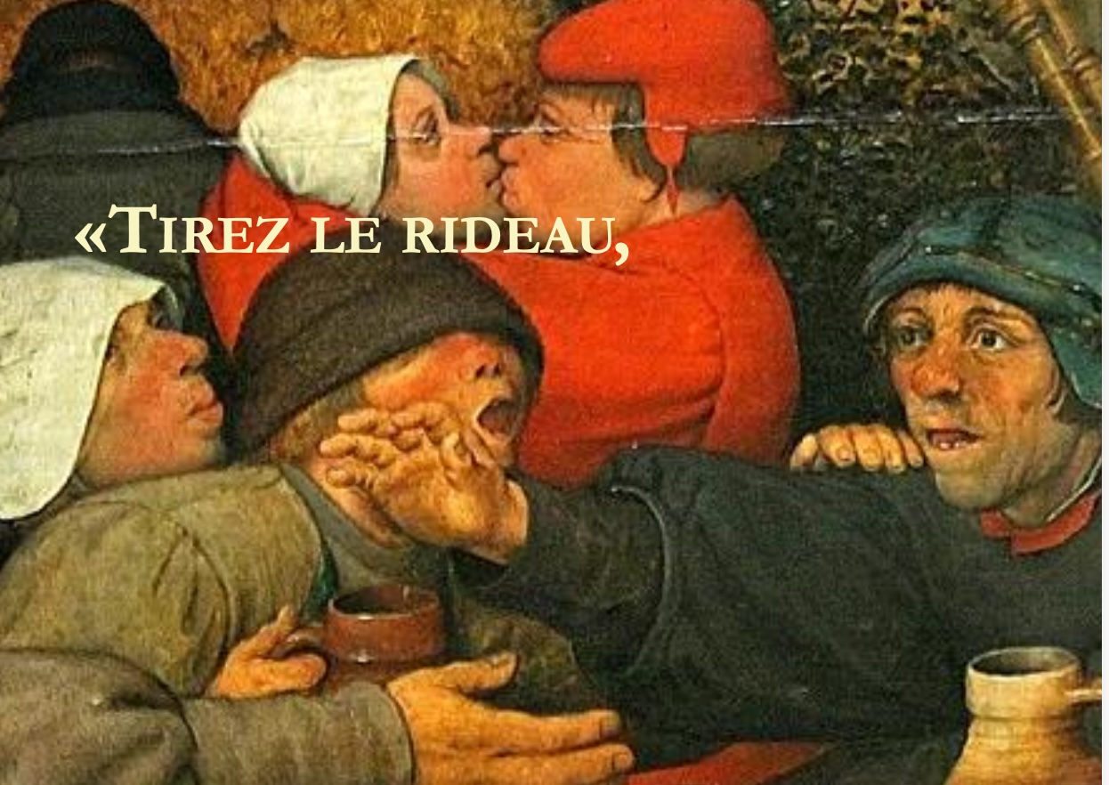 Le spectacle s’ouvre sur un paradoxe spectaculaire qui se donne aussitôt comme sa règle : en montrant sa fabrique, il affirme sa loi. Ce qui saisit d’emblée relève d’un certain dénuement exposé, celui d’un atelier qui tient lieu de théâtre, où l’œuvre et l’instrument qui la produit se confondent, tenus dans la même main et laissés visibles. Le spectaculaire ne tient pas ici à l’effet, mais au fait même que se donne en spectacle sa matière, à nu. En exhibant ce peu, il se tient à sa propre mesure, élaborant à vue des moyens ajustés à son désir. Au centre du plateau, un panneau court sur une grande partie de la largeur de la scène sur lequel s’affichent les images du monde, puisque le monde nous parvient comme image, qu’il ne se saisit d’abord que comme image de lui : cartes, tableaux renaissants de portraits d’humanistes que recouvrent les portraits de puissants de ce monde eux-mêmes recouverts de paysages qui tâchent de les renverser. Surimpression, vertige fixé. Ailleurs, ce sont les emblèmes de ce temps qui s’ouvre alors comme un cadavre qu’on dissèque en public, image par quoi s’autorise un autre savoir que celui des autorités religieuses. Car c’est par les images qu’on peut le voir aussi, le saisir et le défier. Sur la table devant le panneau sont déposés les livres, à côté de quoi se poseront les assiettes et les couverts, les verres, quand la table de travail se changera en table à manger : mais se change-t-elle ? Ou s’opère-t-il une sorte de métaphorisation à vue de ce que la pensée est la chair de l’esprit — image devenue lieu commun de la Renaissant que la scène ici immédiatement assemble et traverse avec désinvolture. Il y aurait ainsi là quelque chose qui relèverait d’emblée de l’atelier, comme d’un laboratoire humaniste : les instruments pour penser, et qui ordonnent le chaos du réel en signes lisibles. Parmi ces images, discrètement, on reconnaît le cadavre du Christ exécuté par Holbein – rappel muet que ce monde est dressé sur les charniers des hommes et des dieux. Accolé à ce panneau, autre surface : un large rideau blanc qui sépare et joint, cache en laissant deviner tout un théâtre de l’autre côté d’où va surgir le théâtre. Rideau qu’on va tirer — non lever, mais tirer : rideau de la farce qui dit aussi d’emblée ce dont il s’agit et d’où l’on relève.