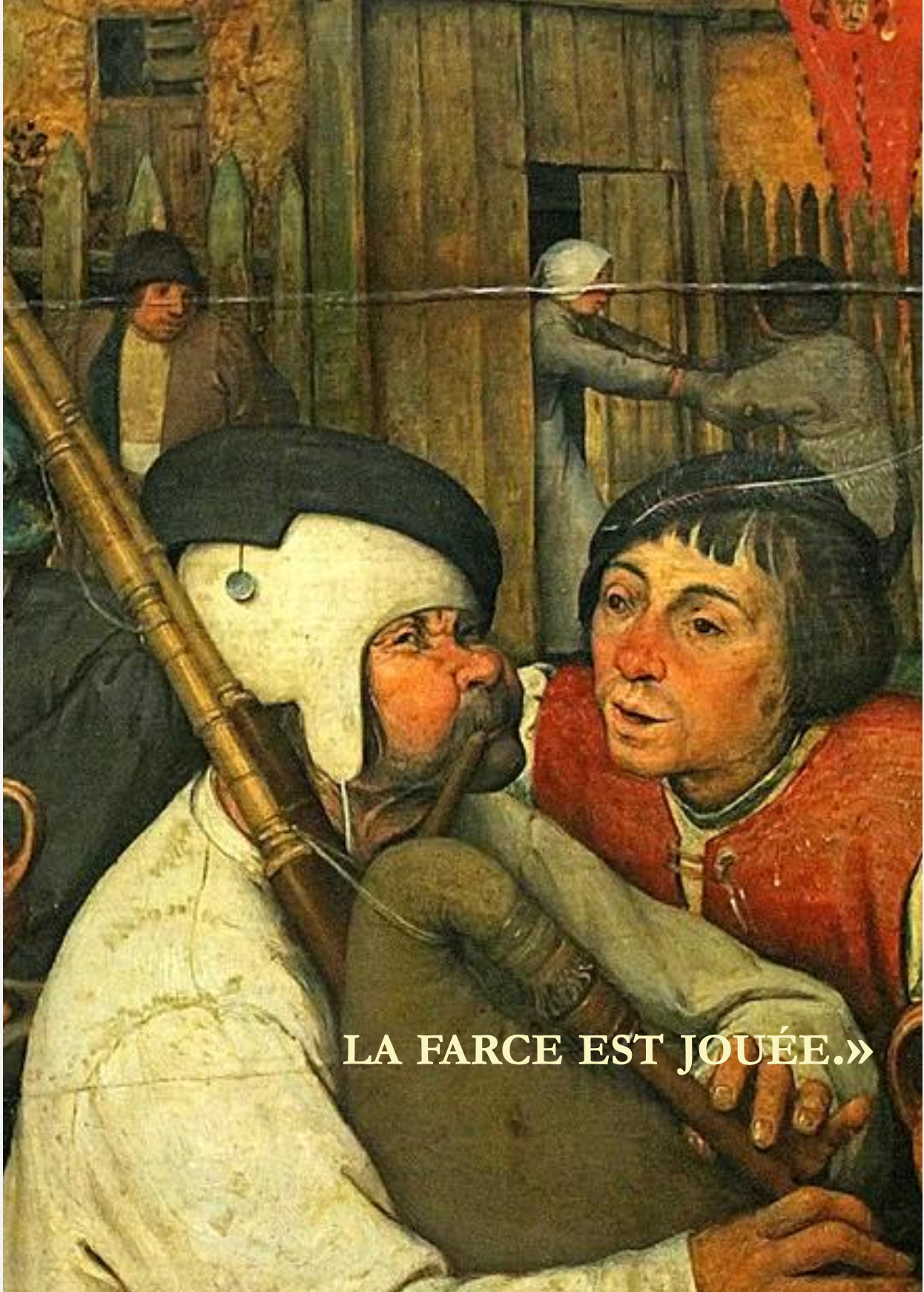 C’est au pied du bûcher, dans l’air vicié du temps, que s’adosse le grand rire de Rabelais, tant il puise sa force dans ce qu’il affronte et cherche à conjurer. Dès l’ouverture du spectacle, après l’accueil et les gestes d’amitié par lesquels les acteurs-personnages s’avancent vers la communauté du public, une évocation du tonneau de Diogène installe la scène sous le signe d’une fraternité précaire, bientôt traversée par des images de guerre que l’on vient placarder sur les murs formant l’horizon du plateau — comme si cet horizon scénique rejoignait l’horizon historique qui nous encercle comme il ceignait déjà Rabelais, et peut-être est-ce le même horizon de menaces. Les images surgissent à la dictée des mots qui les appellent, et le spectacle de s’ouvrir, comme un ventre sous le poignard, sur une litanie saisissante des armes de la Renaissance, dont l’inventivité meurtrière rivalise avec celle qui fit naître la peinture et l’écriture, tandis que la langue, en les nommant, invente elle aussi son propre métal. Arquebuses, coulevrines, serpentines, bombardes : les syllabes résonnent en chocs d’acier, et la nomenclature prend la forme d’un poème sonore dont la beauté tremble d’une terreur sous-jacente, car, l’écrivait Rilke, « le beau commence comme le Terrible, à peine soutenable, et nous l’admirons tant parce qu’il dédaigne, serein, de nous détruire. »