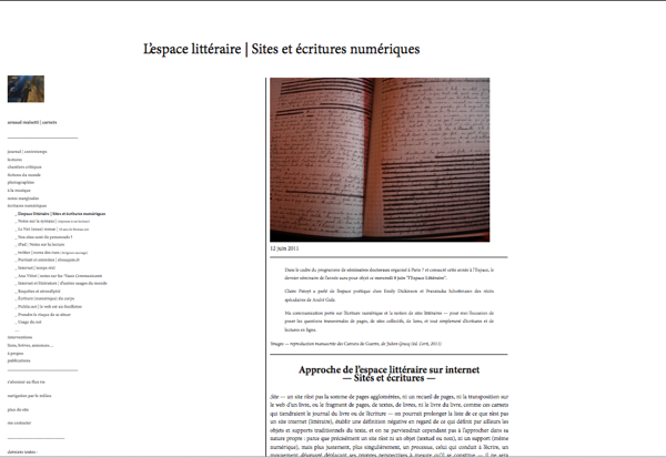 Ma communication porte sur l’écriture numérique et la notion de sites littéraires — pour moi l’occasion de revenir plus systématiquement (et via Blanchot) sur des questions déjà abordées dans mes carnets : les enjeux transversaux de pages, de sites collectifs, de liens, et tout simplement d’écritures et de lectures en ligne.