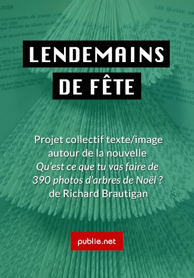 Gaétane Laurent-Darbon a lancé l’année dernière une série photographique autour des sapins de Noël abandonnés dans la rue, Our 390 Christmas Trees , publiée sous forme d’album sur Facebook à laquelle une quarantaine de personnes ont participé en envoyant leurs clichés, série qui faisait référence à la nouvelle Qu’est ce que tu vas faire de 390 photos d’arbres de Noël ? écrite en 1964 par Richard Brautigan, dans son recueil Tokyo Montana Express . Nous avons décidé de lancer cette année un projet éditorial avec un collectif d’auteurs (François Bon, Mathieu Brosseau, Mitch Cullin, Jean-Marc Flahaut, Arnaud Maïsetti, Pierre Ménard, Eric Pessan, Thomas B. Reverdy, Joachim Séné, Pascal Simon, Lucien Suel, et Thomas Vinau) sous la forme d’un recueil de textes et de photographies, Lendemains de fête, diffusé sur Publie.net autour du texte et du thème de la nouvelle de Richard Brautigan. Un site, sur lequel de nombreux photographes ont envoyé leurs photographies de sapins trouvés dans la rue, accompagne ce projet : http://sapins.tumblr.com.