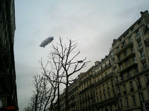En sortant du café où prendre des forces aux énergies vives, celles qui justifient la solitude et son partage surtout, croiser une petite foule regard levé au-dessus des toits. Là, dans le ciel, cette masse qui avançait sans bruit. Un Zeppelin. Plus tard, j’apprendrai les raisons, les mesures, le reste. Peu importe. Mais dans le signe, l’arbitraire, l’anachronisme moderne de la scène, tous ces visages tournés, inquiets, curieux, intrigués, qui repartiront en haussant les épaules ou jurant — et moi seul, là, mais comprenant le signe, et à distance, saluant l’étrangeté et la justesse, me sachant présent à lui accordé ; un dernier regard au Zeppelin avant de m’engouffrer dans le métro, c’est fini : je ne saurai pas avant de l’écrire que l’image serait suffisamment grande pour contenir tout cette journée.
