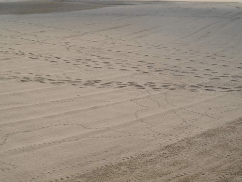 La plage est couverte de traces qui disent les directions qu’ont prises les chiens perdus et les types comme moi qui ont attendu les chiens qui ne sont jamais venus. Quand je lève la tête, j’ai l’impression que le ciel a pris le reflet de ce terrain neutre : et que s’y rencontrent de tels rêves idiots, étranges, où des chiens discutent aux chats l’accès au monde — dans une langue à laquelle il manquerait un mot, ce rêve là est possible. J’ai trouvé le terrain où il a lieu. Et les chiens viendront sans doute dévorer ses restes.