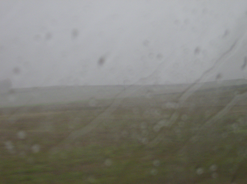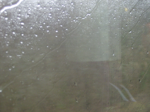 sur la cadre, le décor change mais tout reste en place : les horizons qui s’enfilent les uns aux autres et le train qui se déplace le long, ou qui l’entoure, pour atteindre finalement la ville ; sur le cadre, la pluie qui se dépose ne fait que cerner le train, mais ne le traverse jamais.