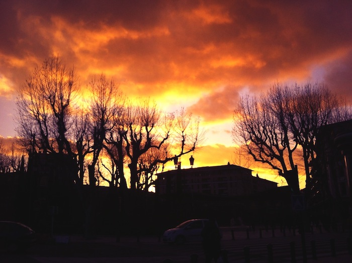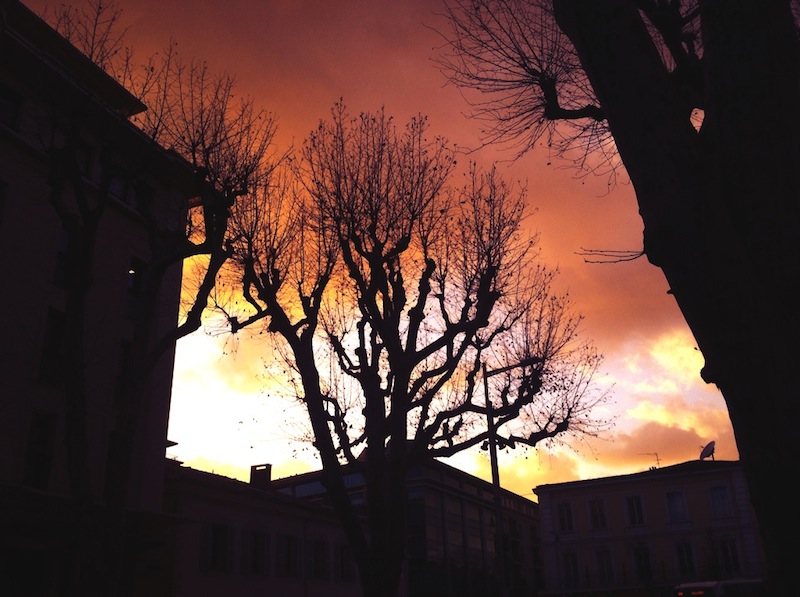 Je pense à ces cris, pensant à la phrase de Rim. sans quitter le ciel des yeux et le prenant à la volée, à mon passage — ce soir, j’écrirai un peu contre lui, et ses pensées ; mais avant, je passe, traversant les cris, et regardant, dans les moments de silence d’où ils surgissent, et pourquoi.