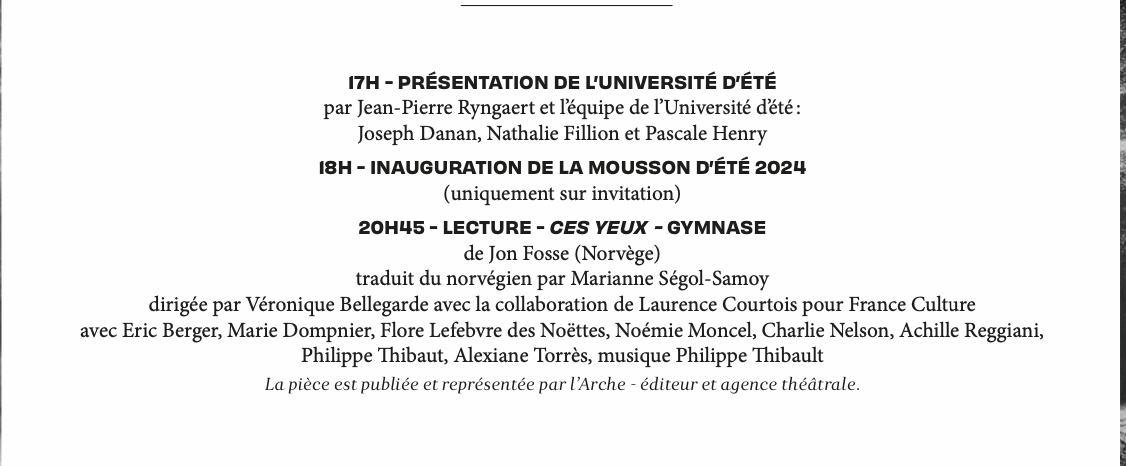 En quels temps sommes-nous ? C’est avec cette question que nous venons au théâtre, avec elle que nous prenons la route qui mène à l’ombre de l’Abbaye des Prémontrés vers les ombres des marronniers au pied desquels se jettent, outre la Moselle, les ombres des corps, des voix, quelques silences : c’est muni de cette question qu’on se tient devant l’ombre portée des mots levés devant nous, et avec cette même question qu’écrivent ceux et celles qui nous les adressent. Nous ne cherchons pas tant des réponses que d’autres façons de la formuler ; alors, en quels temps ? Il suffit de lever les yeux, de regarder autour de nous ce qui s’amasse et semble davantage des menaces que des promesses — oui, les temps sont lourds. Aux portes de Kiev ou au cœur de Gaza, au Soudan et au Yémen, on tue, on massacre ; la terre brûle, sèche, et disparaît, s’enfonce en elle-même sans bruit dans les eaux qui se retirent ; des bêtes s’effacent — nous avons appris à prononcer des termes comme sixième extinction de masse, ou capitalocène, collapsologie et eco-anxiété. Nous évoluons désormais en leur compagnie à moins que nous ne soyons déjà leur proie. Nous savons que la catastrophe n’est pas devant nous, mais qu’elle est en cours, qu’elle a déjà eu lieu : que nous vivons en elle. En quels temps ? Non, décidément, il ne s’agit plus de faire comme si, ou de faire malgré tout : mais avec, et en en tenant compte. Dès lors, nous ne pouvons plus nous offrir le luxe de nous complaire aux beautés lancinantes des fins du monde et de jouir lâchement du spectacle des ruines — c’est que nous sommes, face aux désastres, aussi responsables de notre propre regard sur eux. Car nous ne sommes pas impuissants quand d’autres désastres nous guettent qui se nourrissent de nos lâchetés. Pas impuissants, non, quand nous sommes renvoyés aussi à l’efficace de nos actions, de nos choix, de nos paroles. Ainsi quand le pouvoir joue aux apprentis sorciers pour conjurer le sort et qu’il ne fait que le précipiter, et qu’à vouloir dissoudre une assemblée il a plutôt rendu possible le pire, on mesure à quoi ces choix renvoient. Oui, ce n’était pas faute de répéter ces dernières années comme un mantra la phrase de Gramsci dont le seul envoûtement aurait dû, le pensait-on, faire reculer la menace. « Le vieux monde se meurt, le nouveau monde tarde à apparaître et dans cet interrègne surgissent les monstres ». Nous savions bien sûr le visage des monstres, et ce qu’ils nous préparent, et comme ils savent prendre le masque des mondes d’après, qui ne sont que la répétition des mondes d’avant. À l’issue du second tour, nous pressentions pourtant déjà que le sursaut n’est plutôt qu’un sursis. Que la catastrophe ne perd rien pour attendre — il est ainsi suicidaire d’attendre deux ans pour voir de quel côté la pièce retombera. Par gros temps, nous nous rendons donc au théâtre et nous cherchons à nous situer dans l’ordre des choses et le désordre de l’époque : nous cherchons des armes et nous trouvons des mots capables de les aiguiser en nous. Nous sommes avant, nous sommes après, et nous sommes pendant — Jon Fosse, dont Ces Yeux ouvre cette année la Mousson, situe là l’un des pouvoirs du théâtre — nous sommes dans le temps insaisissable qui flotte autour de nous comme si c’était des feuilles mortes brûlées au soleil d’août et qui attendent qu’on s’empare, mais pour en faire quoi ? De la cendre ou une page sur quoi dater nos colères, nos désirs et l’irrépressible joie d’être sur la pointe la plus avancée du temps capable de déjouer ses fatalités et d’inventer d’autres façons de lui survivre : cette année encore, treize Lectures, trois Spectacles hors-les-murs, dont une Mise en espace avec des amateurs, un Spectacle-conférence itinérant et un Spectacle danse-théâtre, trois Cabarets, trois DJ set, mais aussi deux Rencontres (autour de la traduction, et avec des autrices scandinaves), une Conférence (sur « intimités et technologies ») et une Conversation (à partir des trente ans de la Mousson sous le prisme du journal Temporairement Contemporain) : dix-huit auteurs et autrices, quatre traducteurs et traductrices, treize directeurs et directrices de lectures, une dizaine d’acteurs et d’actrices, une centaine de stagiaires, quatre maîtres et maîtresses d’ateliers de l’Université d’Été, des régisseurs et régisseuses, des musiciens et musiciennes, deux rédacteurs·trices du journal, et toute l’équipe de la Mousson. Nous aurons au moins besoin de cela. Par le théâtre et à l’écoute de ce que nous adressent les auteurs et autrices d’aujourd’hui, nous affirmons plus que jamais qu’une autre fin du monde du possible.