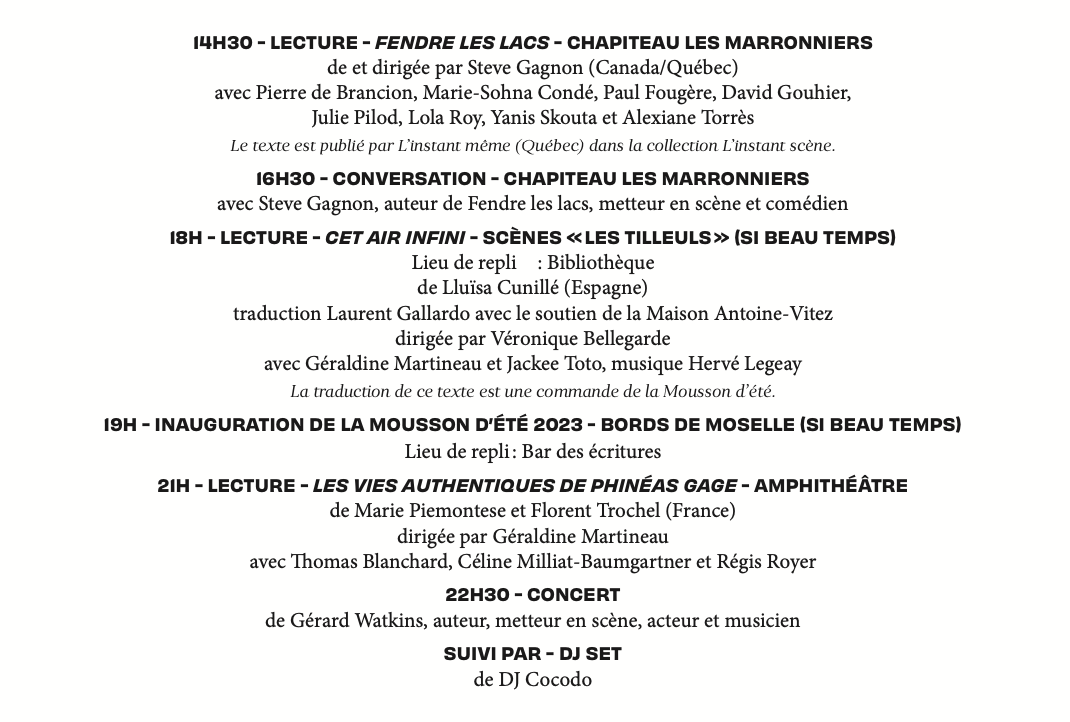 Emprunt par l’intermédiaire du néerlandais monssoen au portugais monçɑão dès le début du XVIe s, lui-même emprunté à l’arabe mawsim qui signifiait d’abord « les vents qui tournent », puis la saison des vents et par extension la fête qui avait lieu à époque fixe et marquait la période du pèlerinage à la Mecque – avant de désigner, chez les marins arabes, la saison des vents favorables à la navigation vers les Indes — le mot Mousson s’impose sous la forme Mouçon attesté en 1598, avant de devenir pleinement Mousson au cours du XVIIe s. « L’arrivée de la Mousson est le seul événement aussi certain et imprévisible que la mort », dit l’adage indien. Elle donne lieu aussi à une célébration de l’esprit dans lequel tous se rassemblent avec joie et espoir. Adityat jayate vrishti – « que le soleil donne naissance à la pluie », avait écrit l’astrologue Varahamihira, au VIe s. Ce n’était pas tout à fait la mousson, mais ça y ressemblait : un ciel qui se charge de nuages de plus en plus lourds et sombres, la pluie qui tombe d’abord silencieusement, puis à gros torrents... et l’orage toute la nuit. Ce jeudi 24 août voulait de cette façon baptiser la Mousson et la nouvelle université d’été européenne. Les stagiaires sont de même venu·es au compte-goute au fil de l’après-midi durant laquelle chacun·e a pris ses quartiers à l’internat, avant de rejoindre à grand flot le bar des écritures pour quelques mots d’accueil de Jean-Pierre Ryngaert qui dirige les ateliers, accompagné des auteurs et dramaturges qui les conduiront : Joseph Danan, Nathalie Fillion et Pascale Henry. Pour l’inauguration officielle de ce soir, on espère que la pluie donnera naissance au soleil.