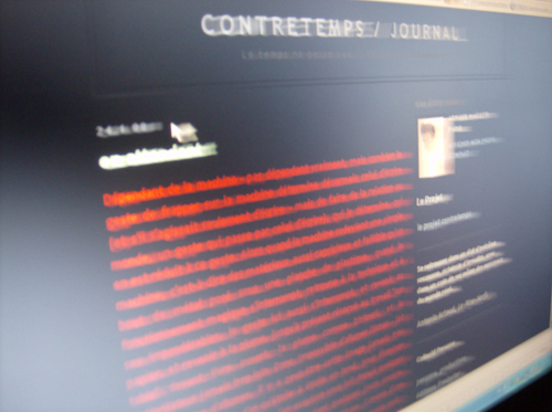 À chaque f o i s, cette impression de vide tout de suite après la lecture, cette impression d’immense fatigue physique alors que c’est immobile et le micro tout près des mots qu’on a juste eu le sentiment de frôler. Mais enfin. Sans doute que ce qu’on joue là, ce n’est pas seulement sa vie puisée en soi, qui ne contient assurément pas tant de vide. C’est peut-être pour cela que j’avais choisi de lire dans le noir, avec seulement dans le dos les images qui défilent. Ce qu’on place au-devant de soi quand on lit, c’est la part de soi qu’on ignore, et c’est uniquement dans le noir qu’on peut la nommer.
