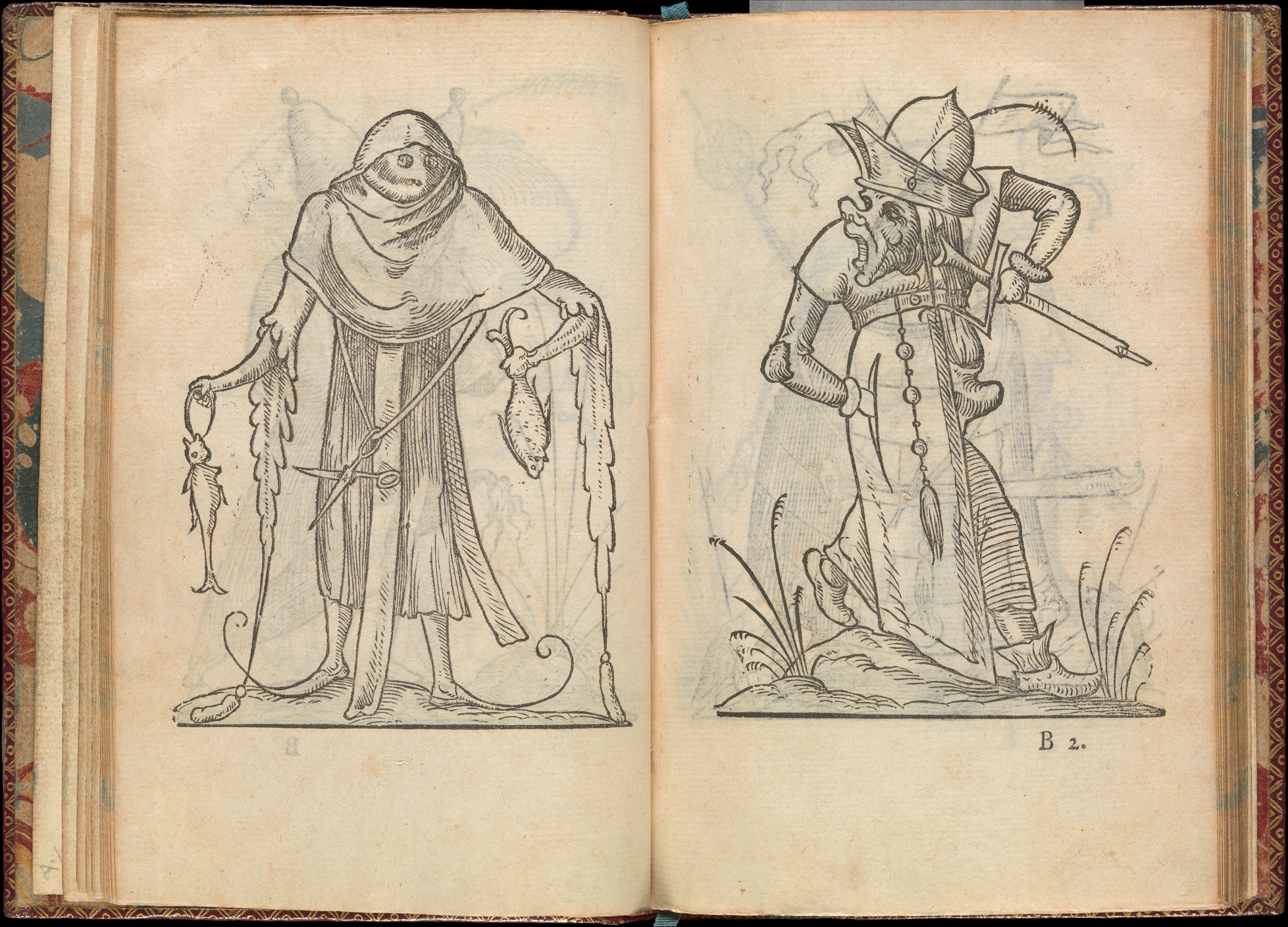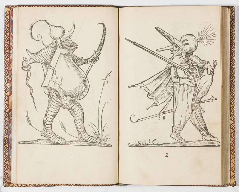 Panurge en philosophe. Print quatre aulnes de bureau : s’en acoustra comme d’une robbe longue à simple cousture : desista porter le hault de ses chausses : & attacha des lunettes à son bonnet. En tel estat se presenta davant Pantagruel : lequel trouva le desguisement estrange, mesmement ne voyant plus la belle & magnificque braguette, en laquelle il souloit comme en l’ancre sacre constituer son dernier refuge contre to’ naufraiges d’adversité.