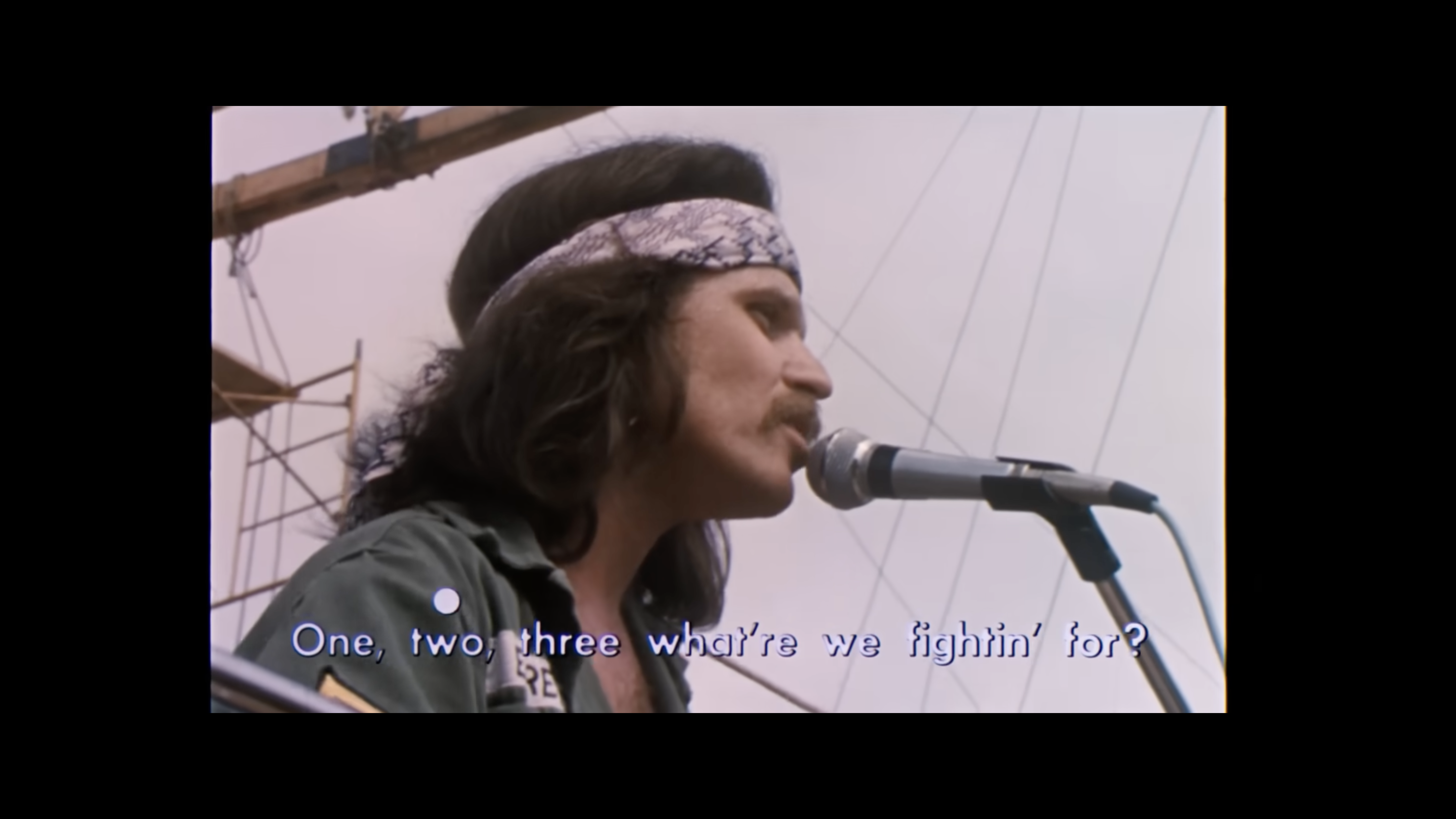 Il n’aurait même pas dû être là. On lui avait demandé de meubler le temps pendant qu’on installait le matériel de Santana. Personne ne l’écoutait. Son manager lui aurait dit quelque chose comme : de toute façon, personne ne fait attention à toi, quelle importance. Il a donc fait la seule chose qu’il savait faire : il est revenu au commencement, au Fish Cheer originel – il faisait alors crier le mot FISH à sa maigre audience des bars de San Francisco. Ce jour-là, à Woodstock, les lettres ont changé. Puis, il a enchaîné avec l’hymne — I-Feel-Like-I’m-Fixin’-to-Die Rag : One, two, three, what are we fighting for ?