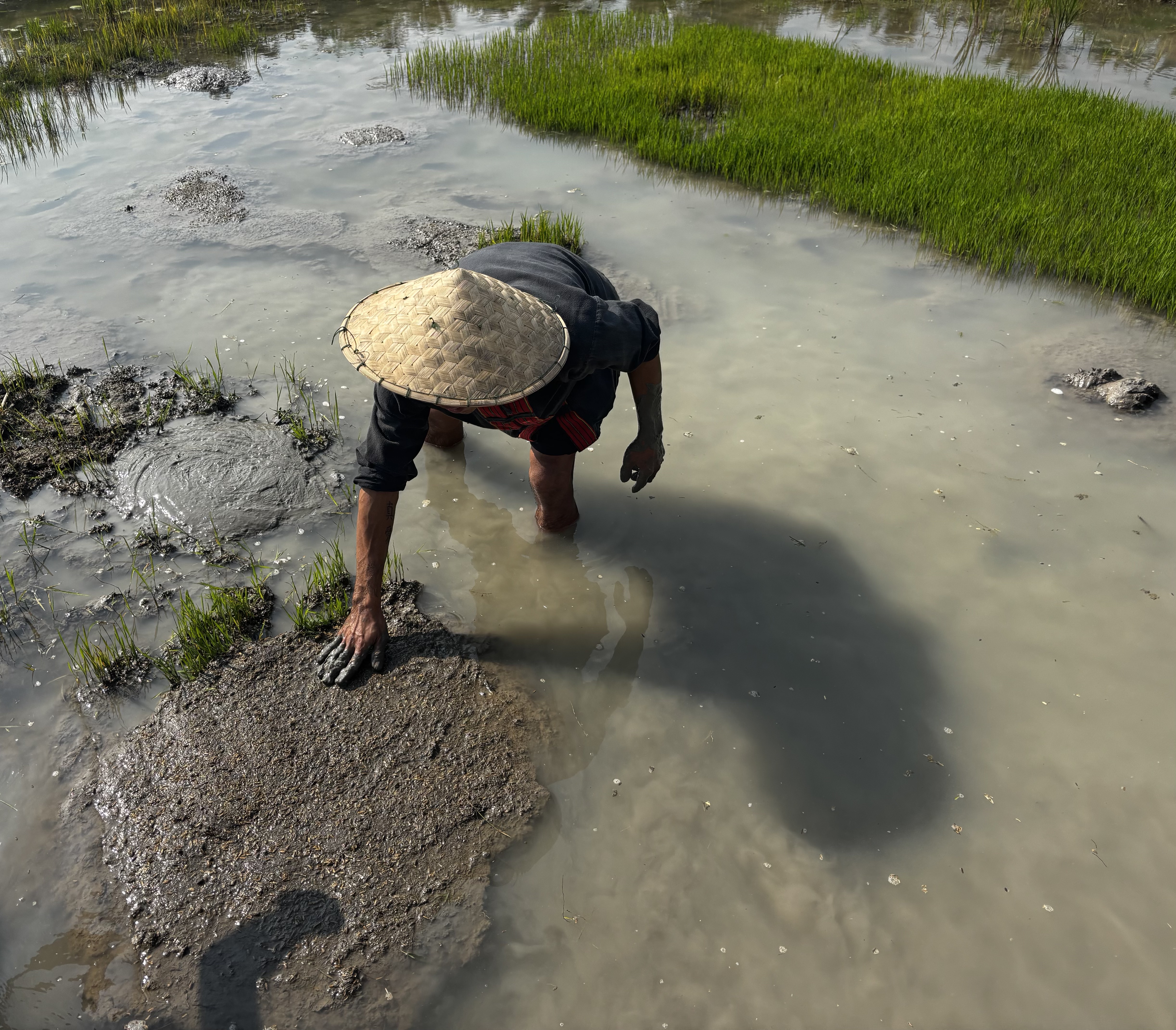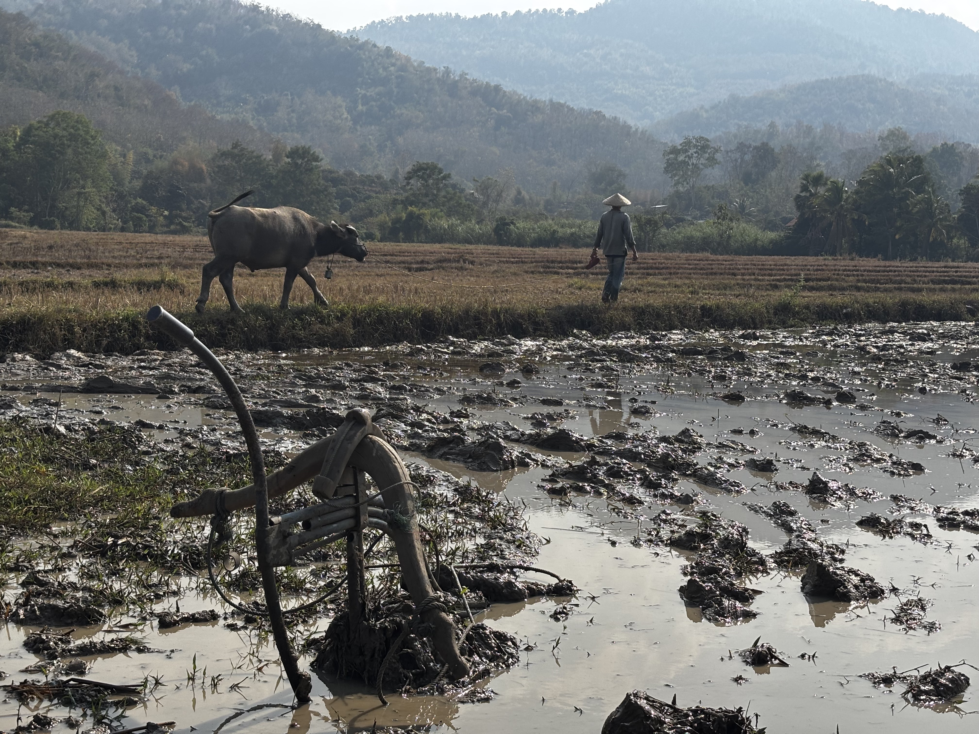 Rizières à perte de vue, courbes vertes sous le ciel lourd. Ban Phong Van, banlieue nord de Luang Prabang sous les montagnes parmi les peuples entremêlés dans la brume ce matin-là. Sentiers de terre cendrée entre les terrasses. Pieds nus dans la boue, dos courbés sur l’horizon : quelques gestes répétés depuis mille ans au moins. L’or blanc des montagnes noue ensemble, fragile, plaines et sommets, villes et terres débordées par le fleuve, les corps, les ventres et les pensées. Quelques voix, la ville si proche nourrie par la sueur des montagnards. Patience d’arracher la terre à la terre de ceux qui savent que c’est davantage que leur vie qui en dépend. Le khao nièo prend racine dans la terre gorgée d’eau, on l’arrache avec dévotion. Dans les villages, les femmes justement préparent les offrandes. Des boulettes de riz sur les autels des pagodes. Les buffles d’eau labourent la terre si lentement, mêlent leur souffle à la brume des rizières pour lever tout ce brouillard où tout se confond.