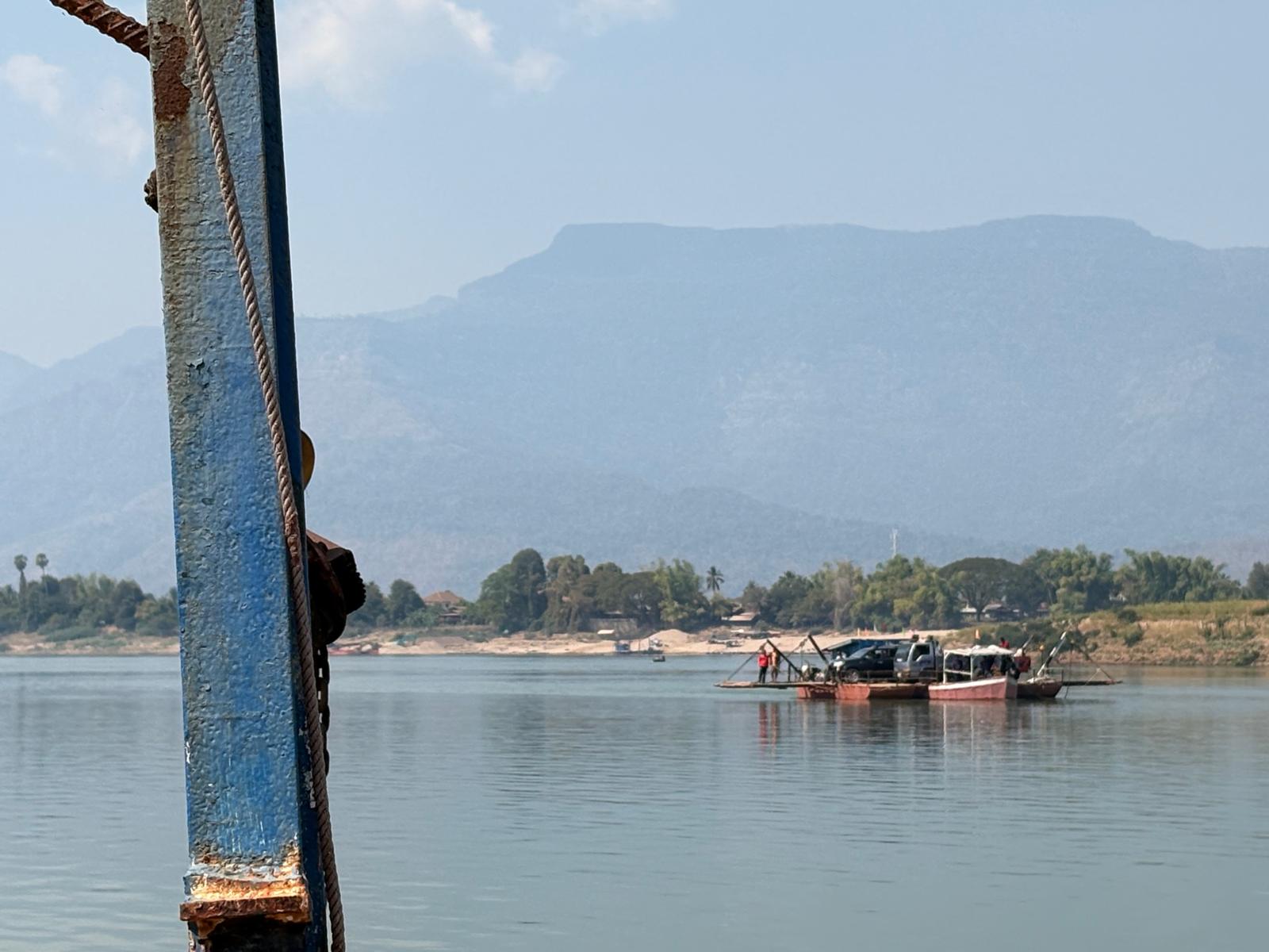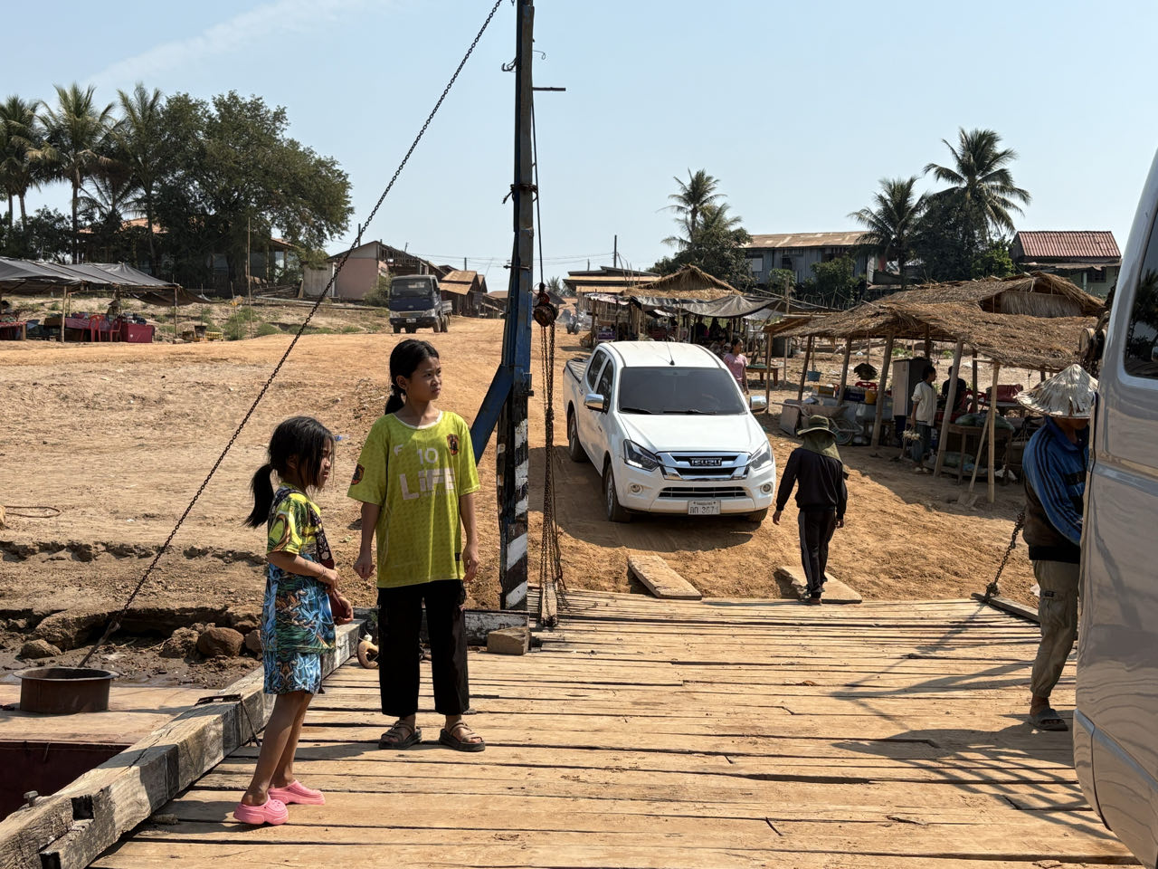 Une dernière fois, le franchir depuis la mauvaise route venant des Quatre Mille Îles. On atteint une sorte de rive boueuse — c’est le quai. Une barge flottante dont on ne sait comment elle tient debout s’approche en tanguant, sans prévenir. On y pose la voiture par miracle, mais un autre truck viendra se garer aussi, rempli d’enfants qui prendront des selfies devant l’horizon comme on capture un mirage.