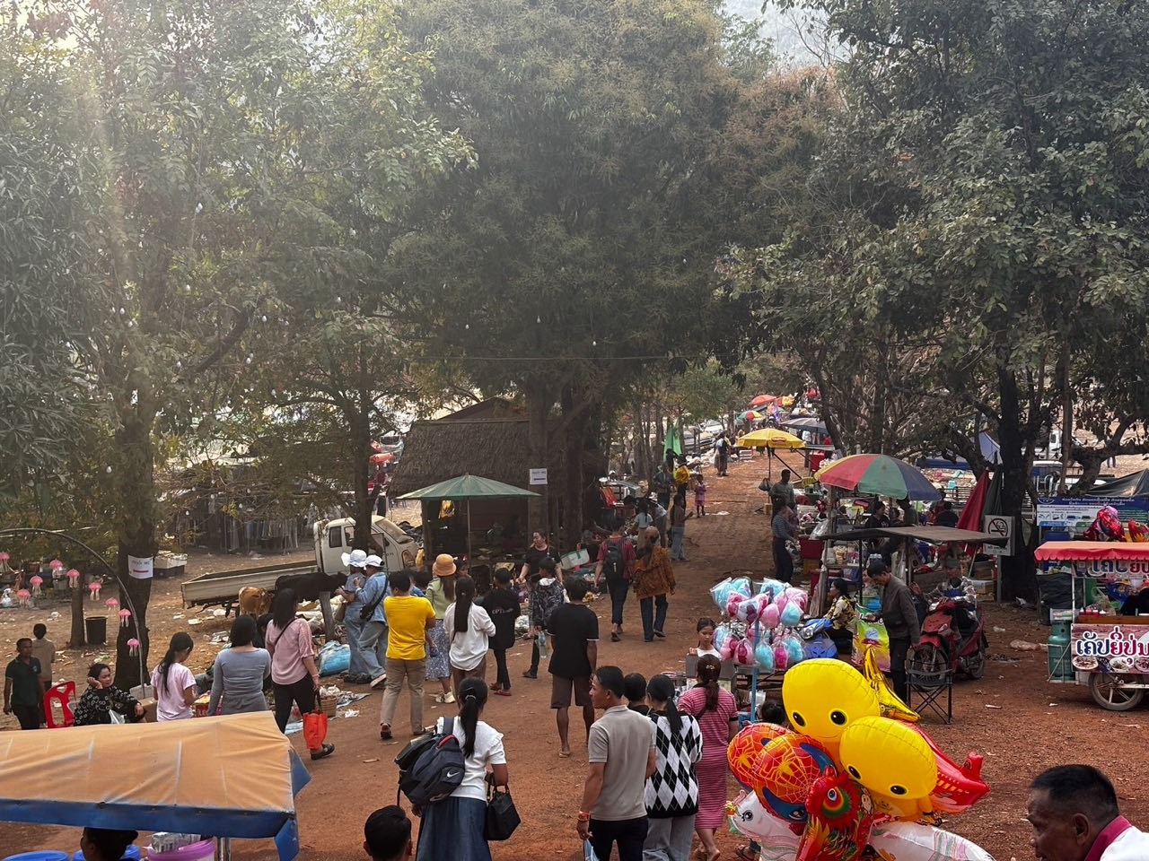 La fête est à son dernier jour — on le devine partout à cette espèce d’épuisement qui s’est posé sur les corps, la terre, les arbres. Le sol est un tapis de déchets. Certains étals sont démontés. Le jour s’effondre aussi sur tout cela.