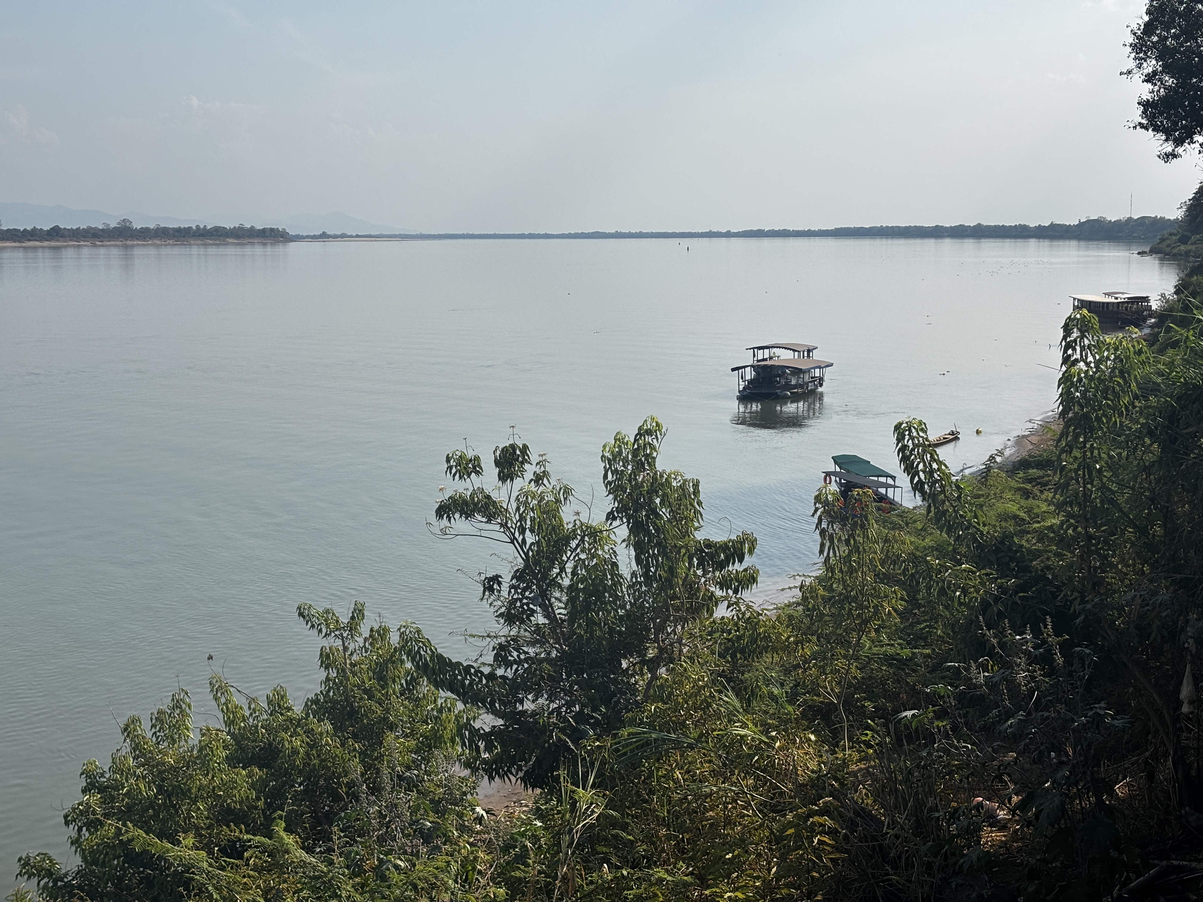 Le fleuve est plus large que jamais, lourd ; il fait semblant de couler sans hâte, et pourtant, à peine a-t-on le temps de s’accorder aux remous bruns que nous sommes sur l’autre rive. Champassak s’avance — ou recule — ville étalée, silencieuse, en attente de quelque chose qui déjà a eu lieu, avant même ce dont on se souvient. Au loin, les montagnes dont on devine les contours sacrés par toutes les religions.