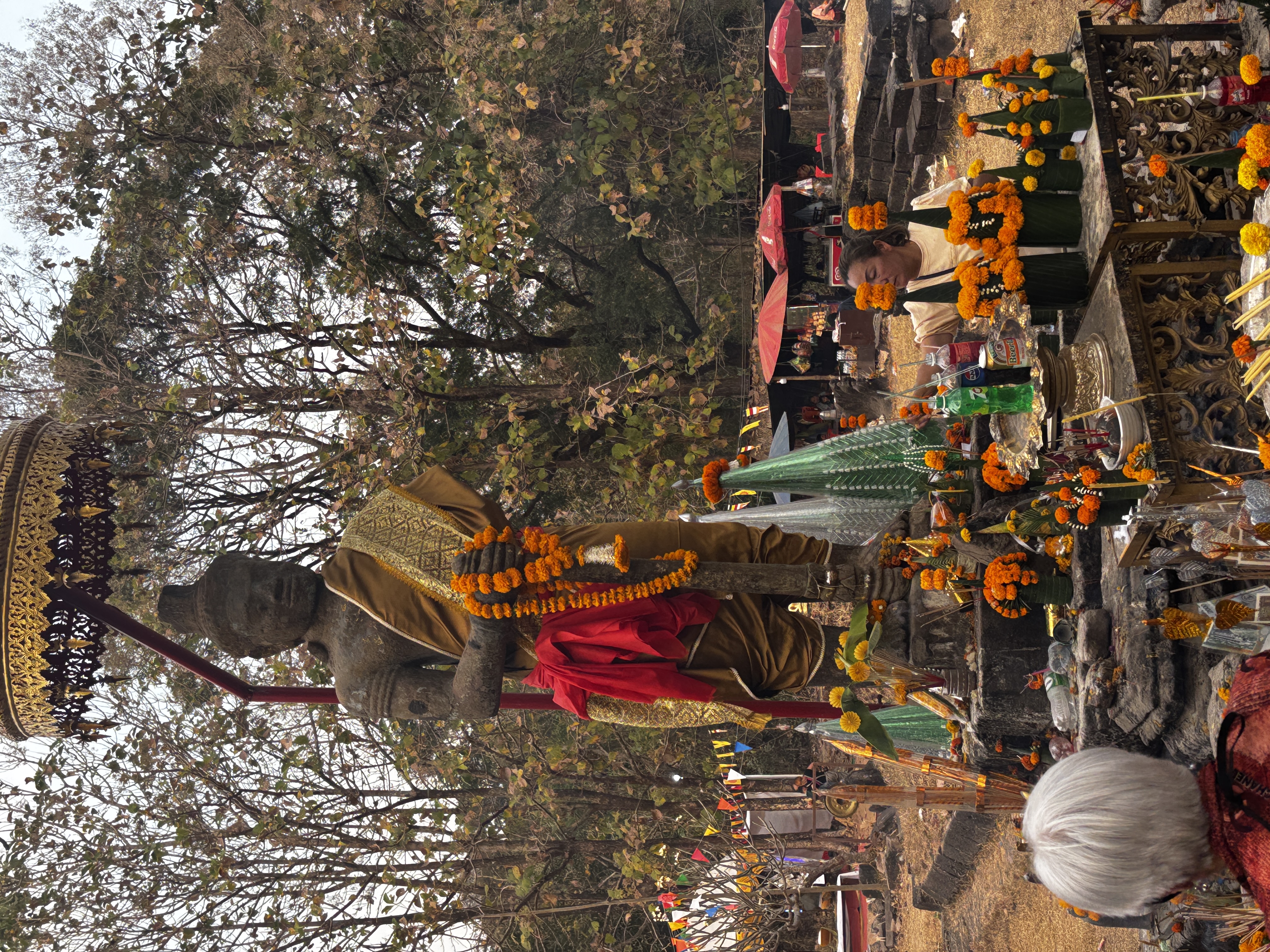 Des bhikkhunīs assises derrière des tables branlantes fabriquent des amulettes, tissent les fils rouges qu’elles nouent autour des poignets. Les visages des fidèles s’ouvrent, se ferment, se penchent vers d’autres visages. La foule remplit chaque seconde.