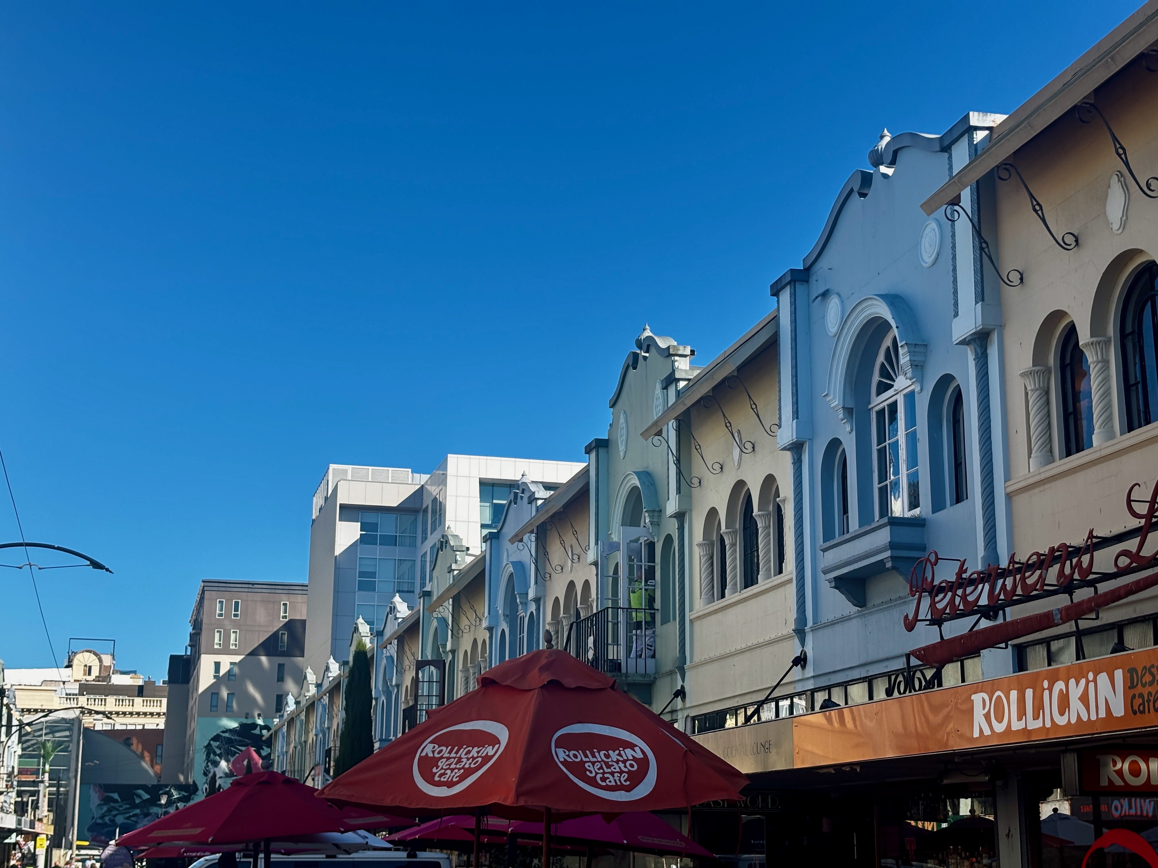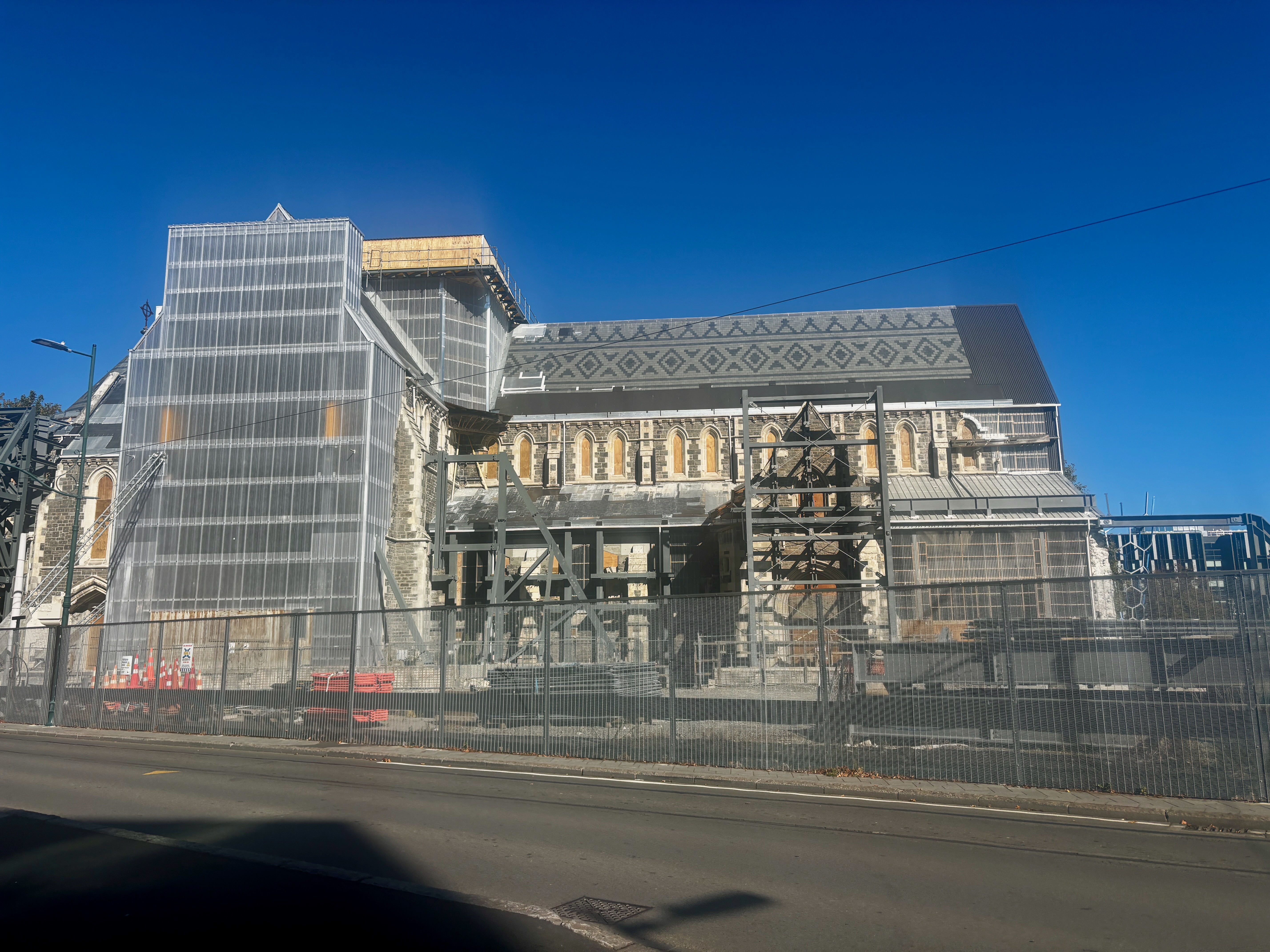 Et plus loin, le chantier figé de la cathédrale tendue de bâches et de poutres — squelette provisoire pour édifice en attente de lui-même. On ne rebâtit pas une ville : on vit avec ce qu’elle est devenue. Christchurch a renoncé à reconstruire, invente dans les brèches.