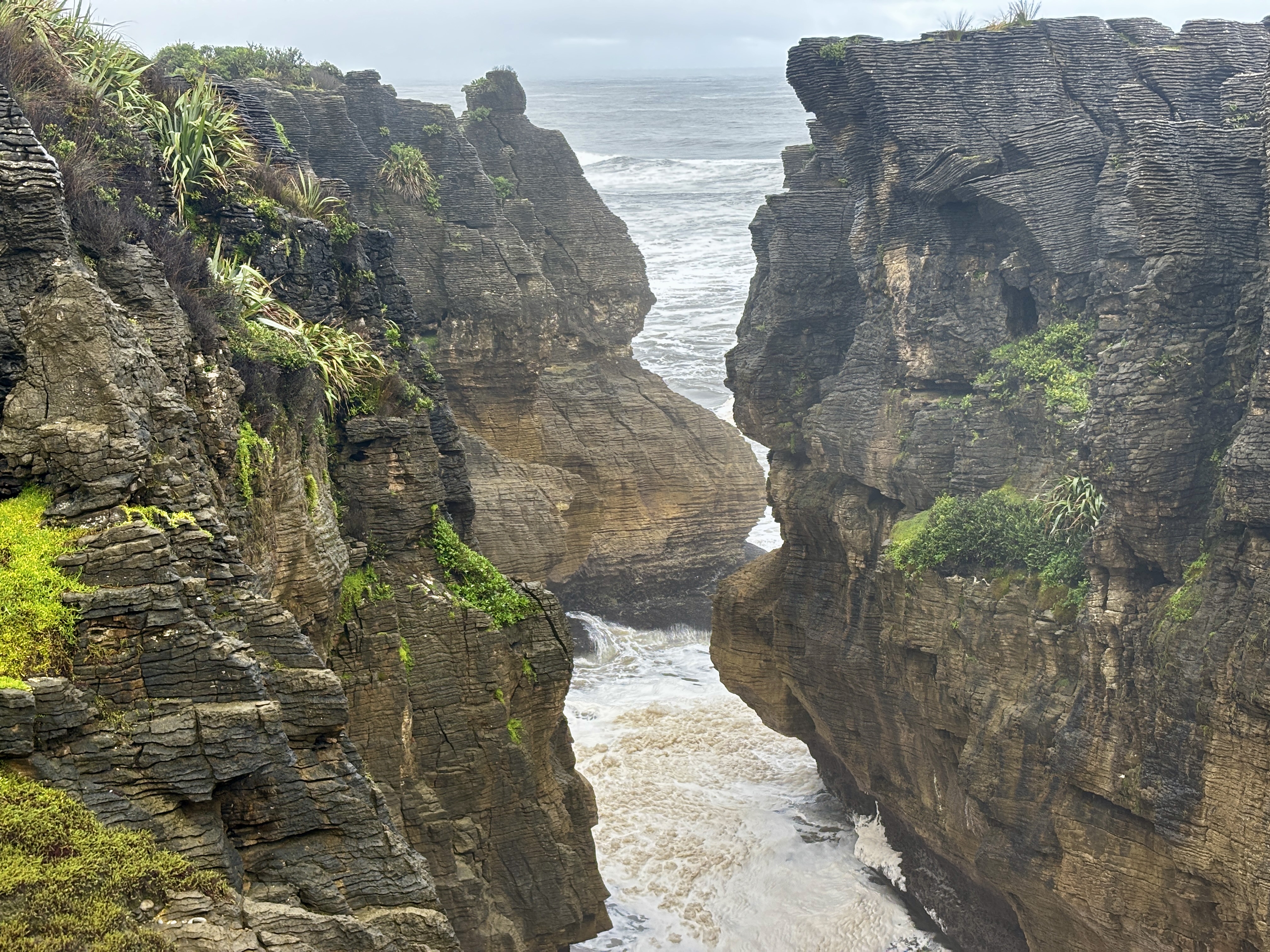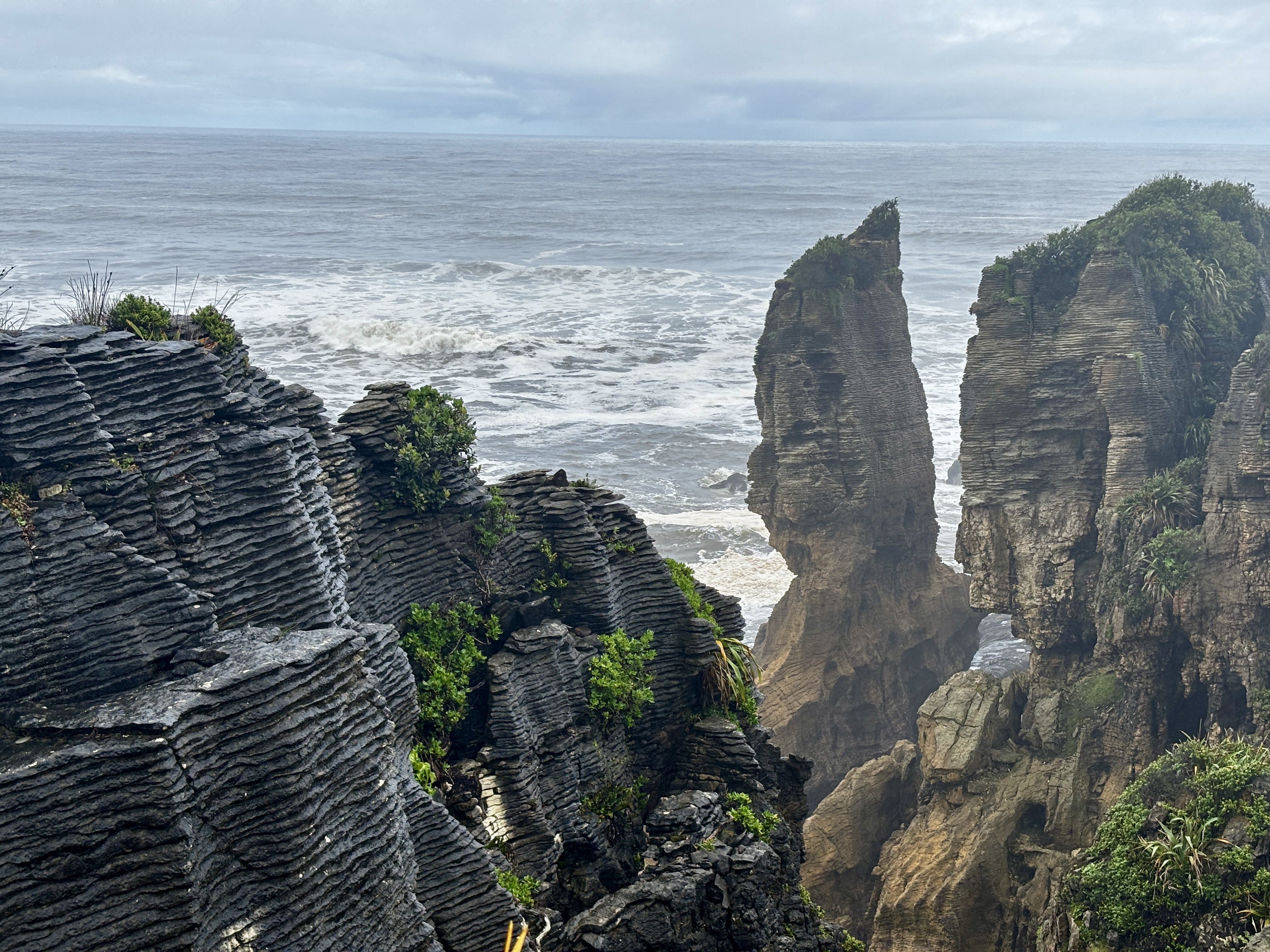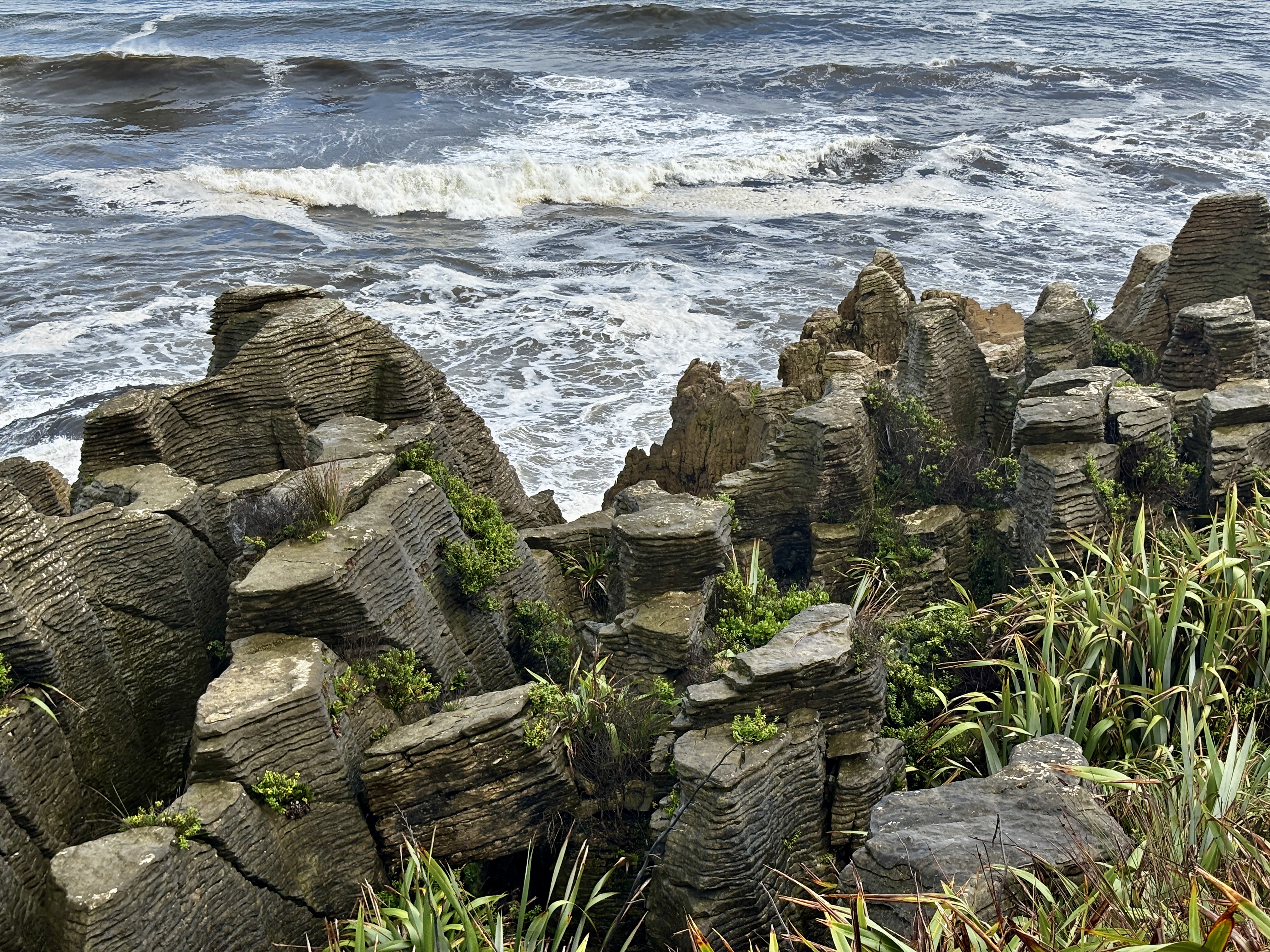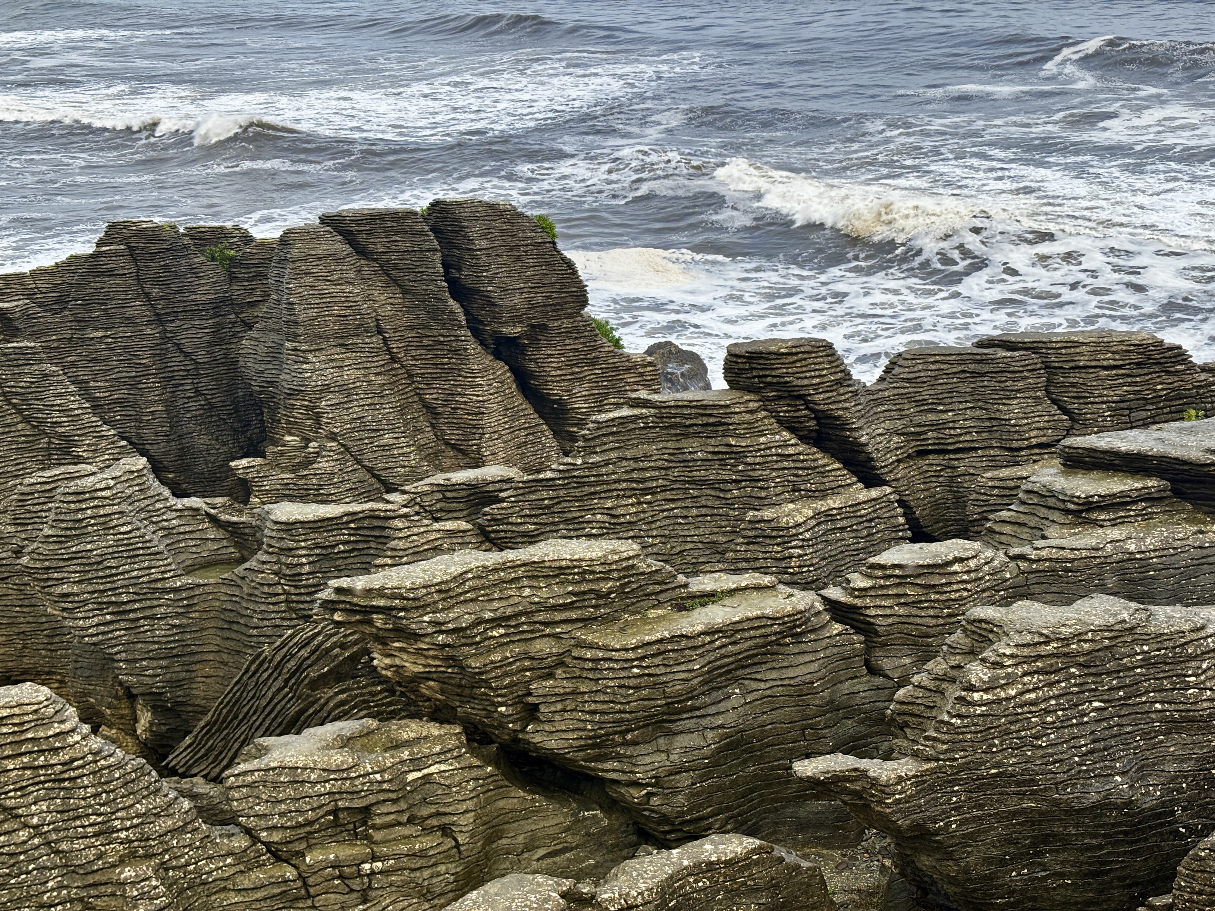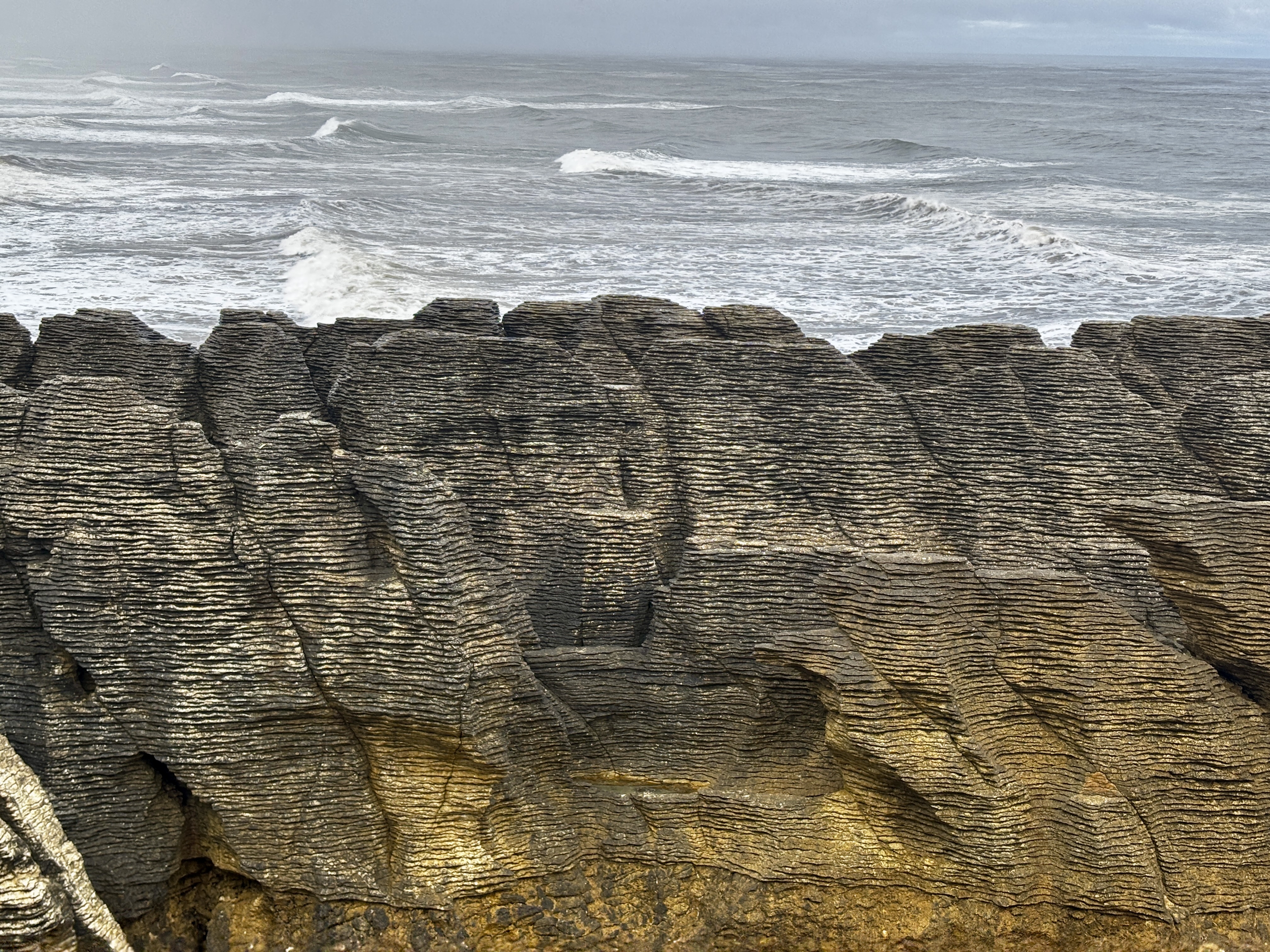 De la côte ouest, longer la mer de Tasman jusqu’à ce qu’elle vienne percuter le Dolomite Site et ce qu’on nomme ici « Pancakes Rock »— comme si l’érosion n’avait donné naissance qu’à de mauvaises plaisanteries pour touristes, quand les Maoris parlaient de Punakaiki, et dans leur mot on entend la bouche de la mer et le battement lent des mondes qui s’effacent — nous n’en verrons pas la fin, même en les regardant patiemment s’effondrer.