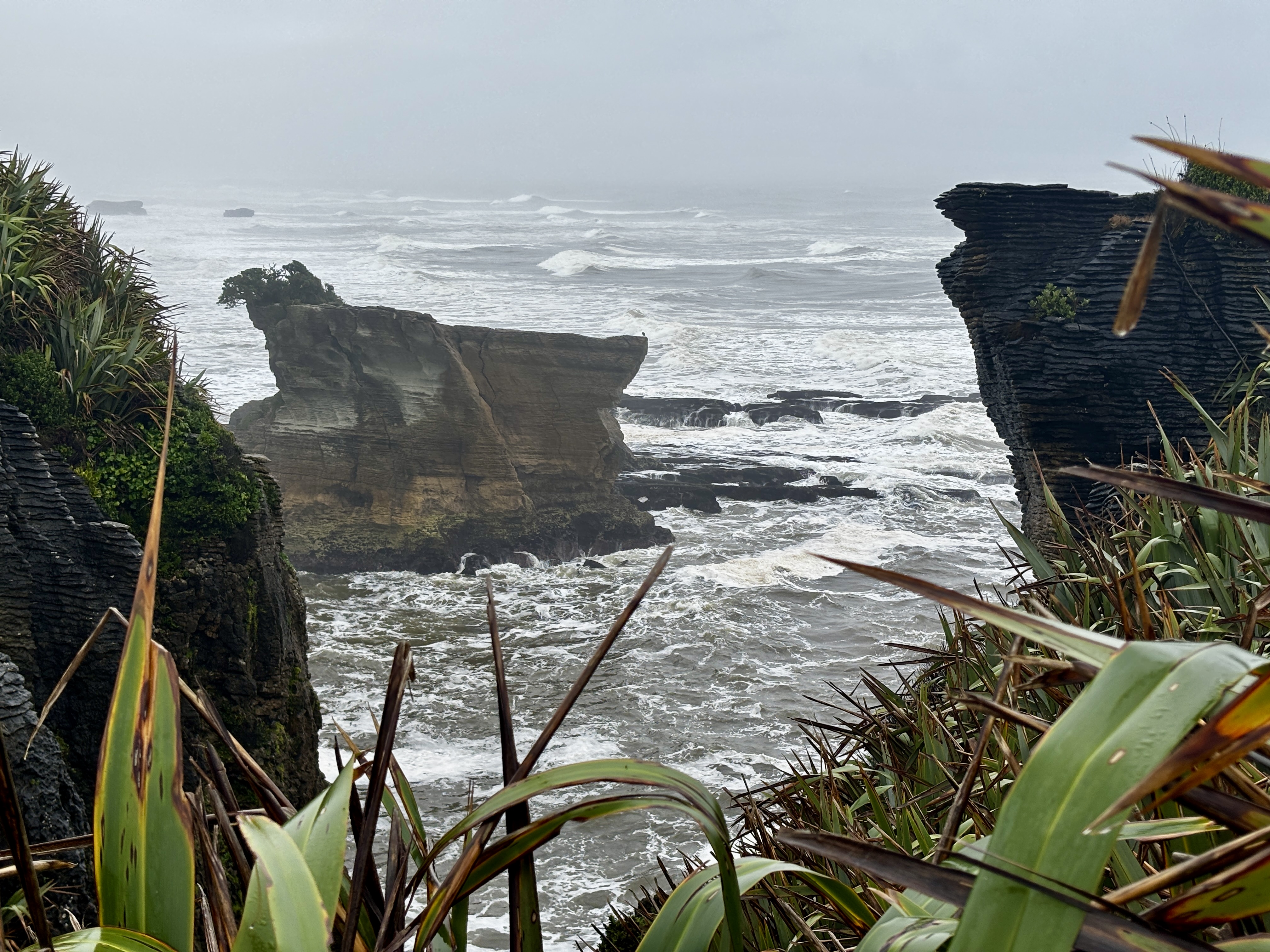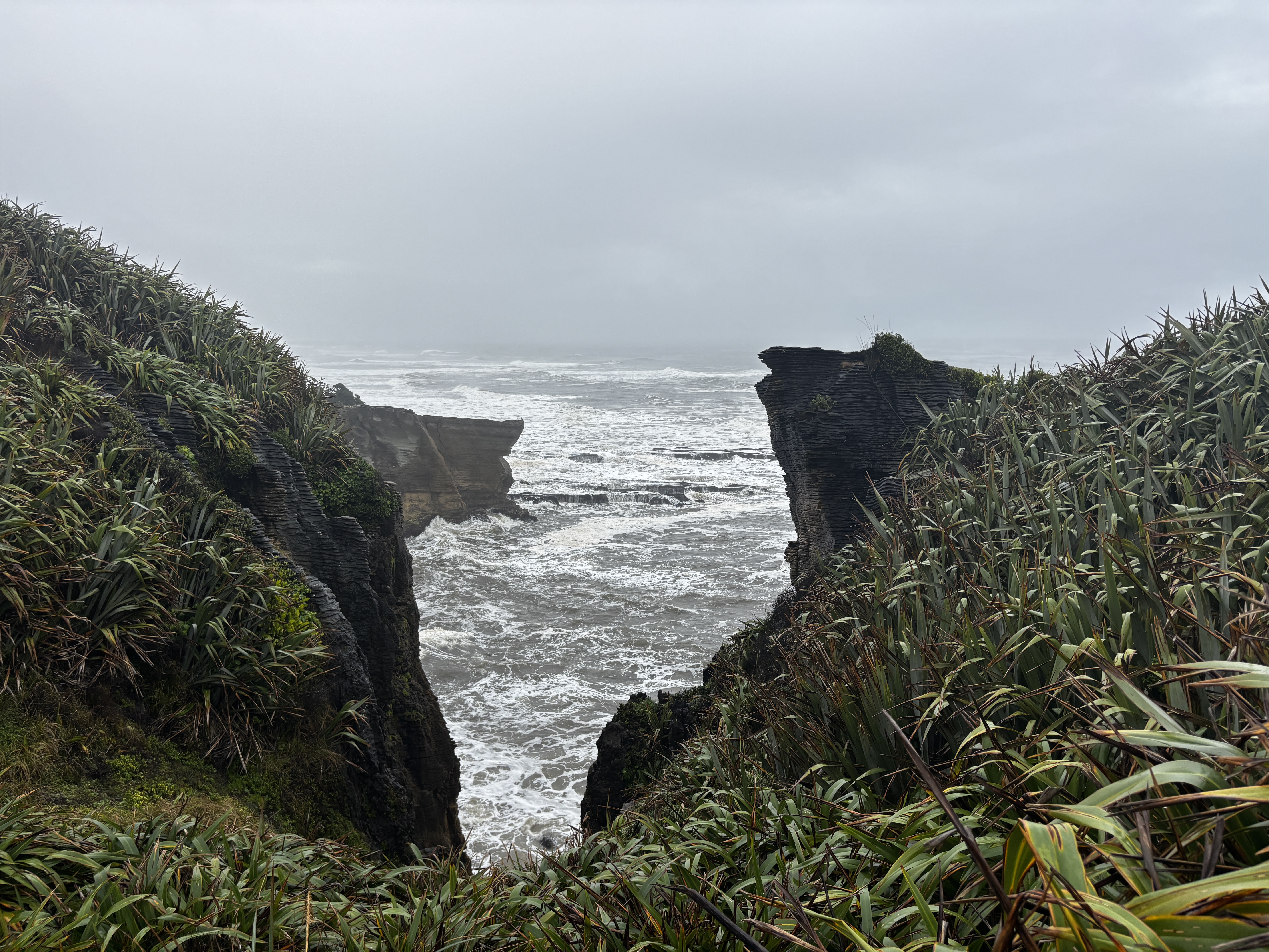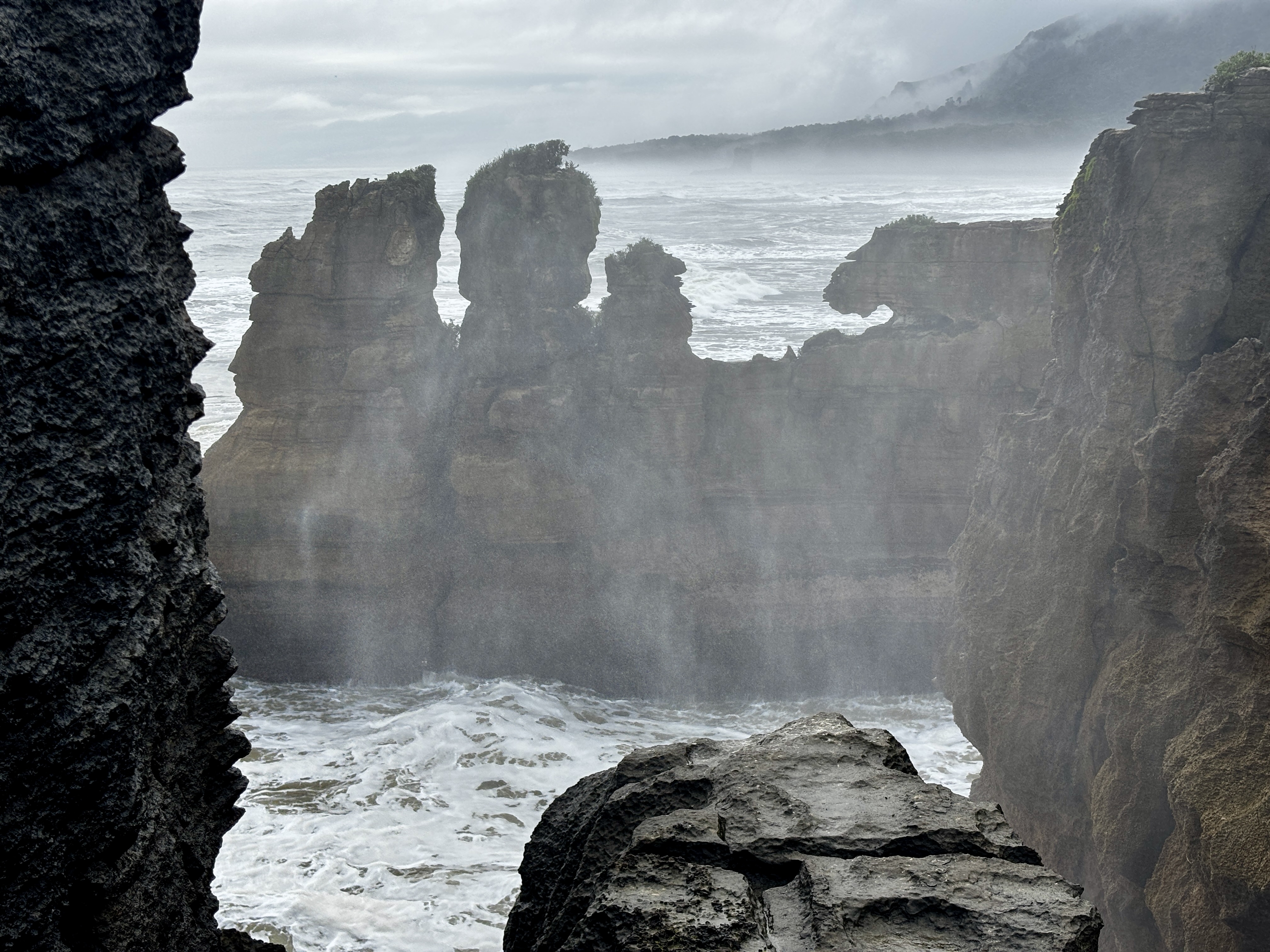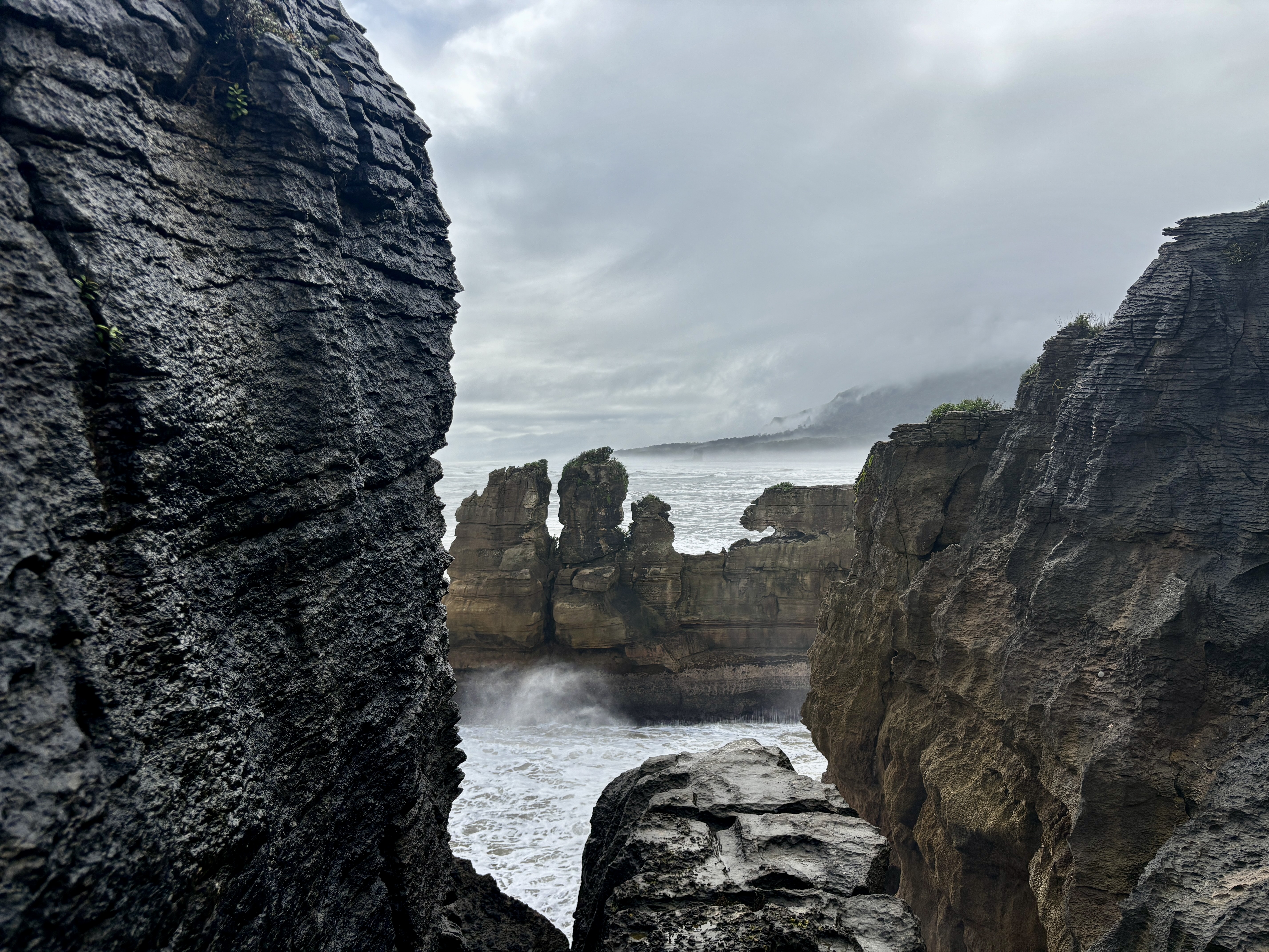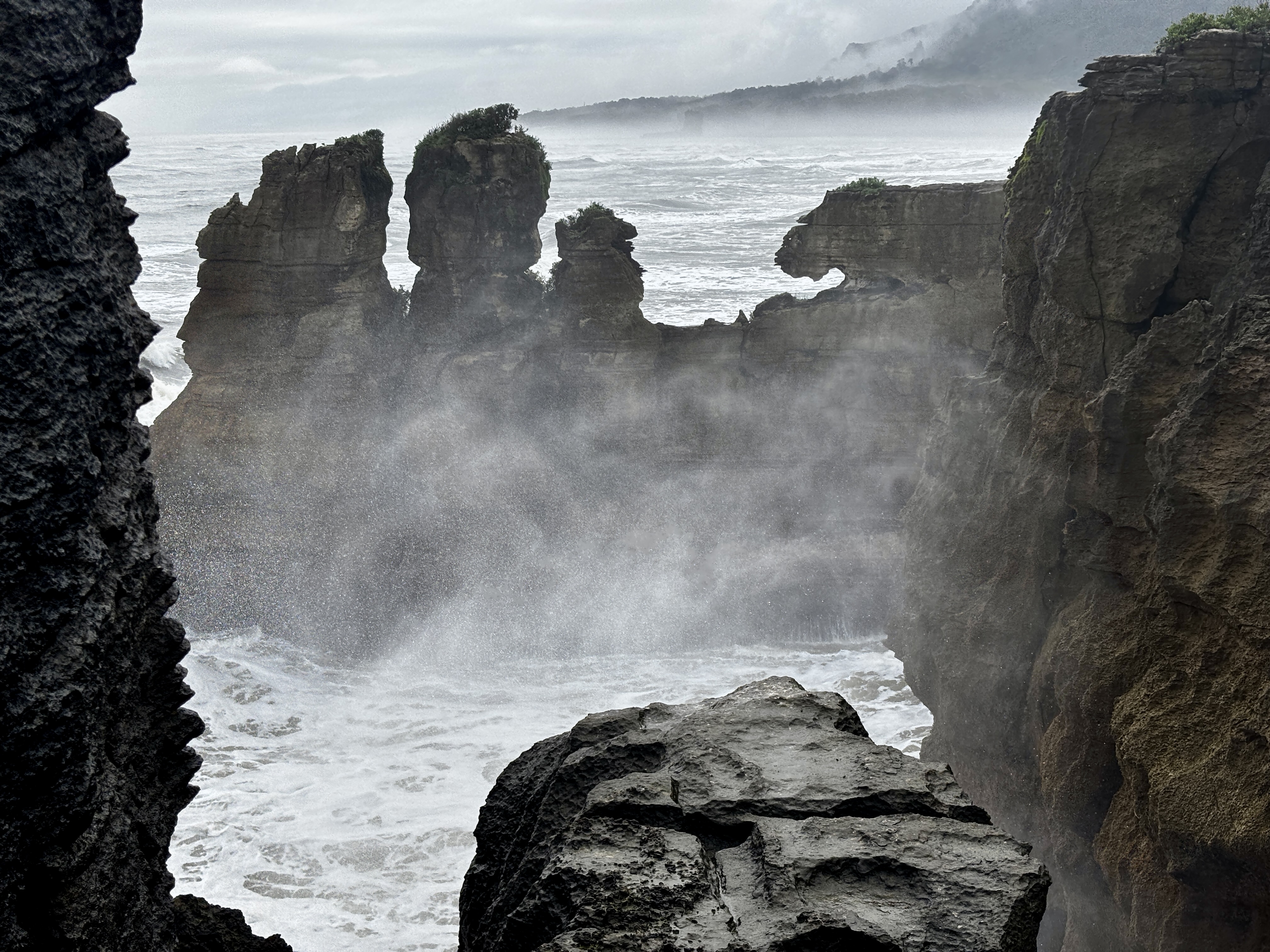 De la côte ouest, longer la mer de Tasman jusqu’à ce qu’elle vienne percuter le Dolomite Site et ce qu’on nomme ici « Pancakes Rock »— comme si l’érosion n’avait donné naissance qu’à de mauvaises plaisanteries pour touristes, quand les Maoris parlaient de Punakaiki, et dans leur mot on entend la bouche de la mer et le battement lent des mondes qui s’effacent — nous n’en verrons pas la fin, même en les regardant patiemment s’effondrer.