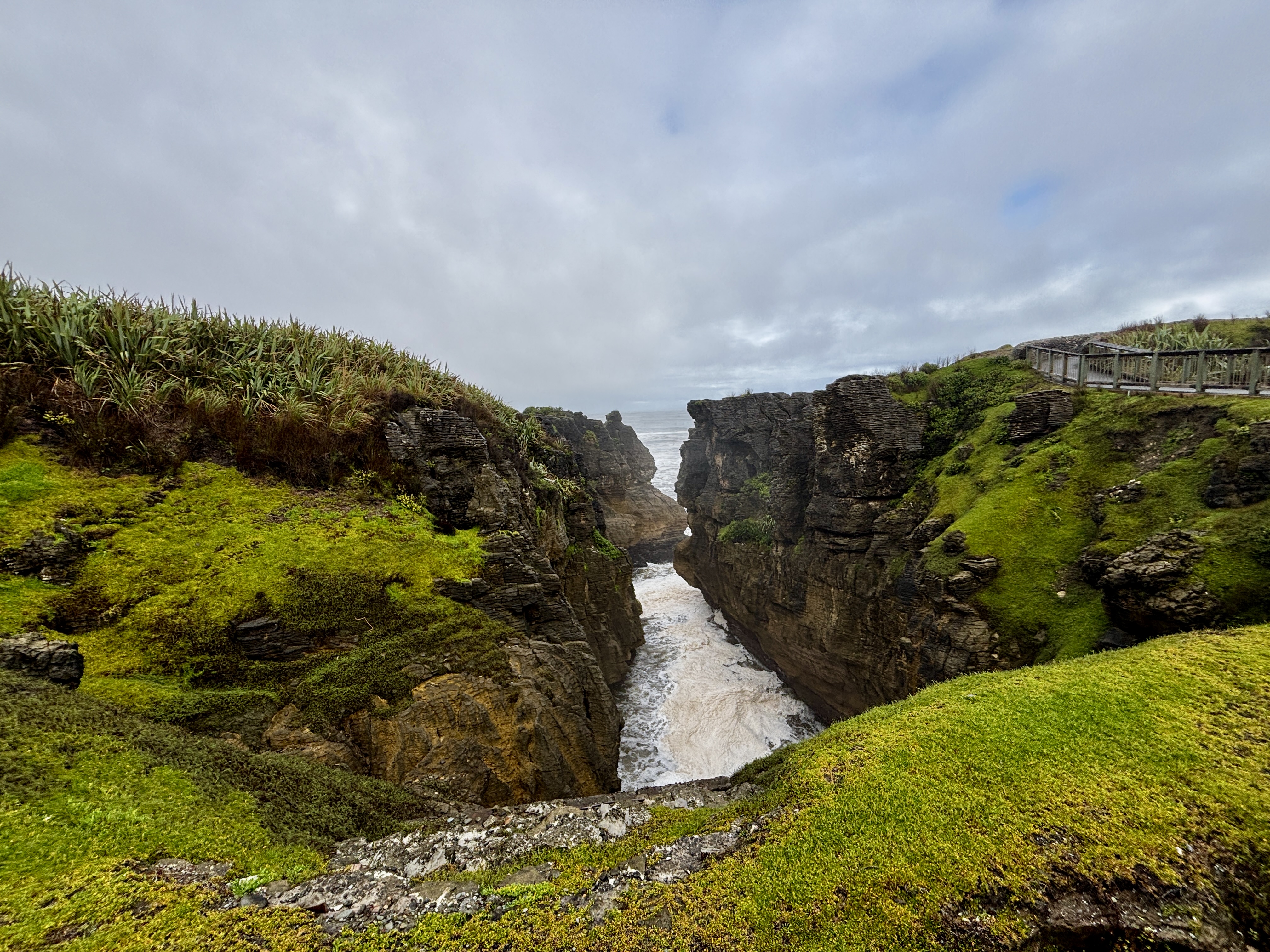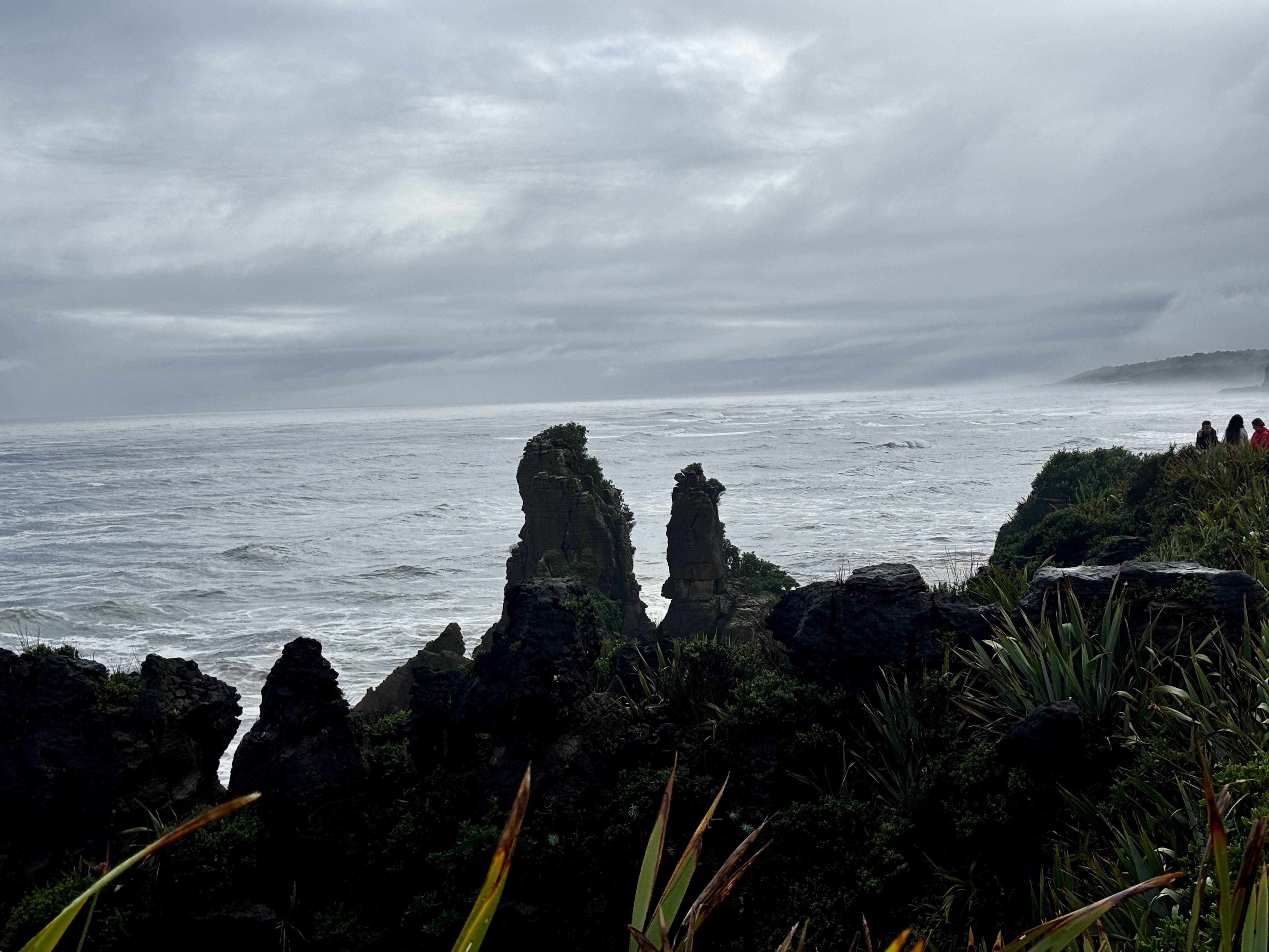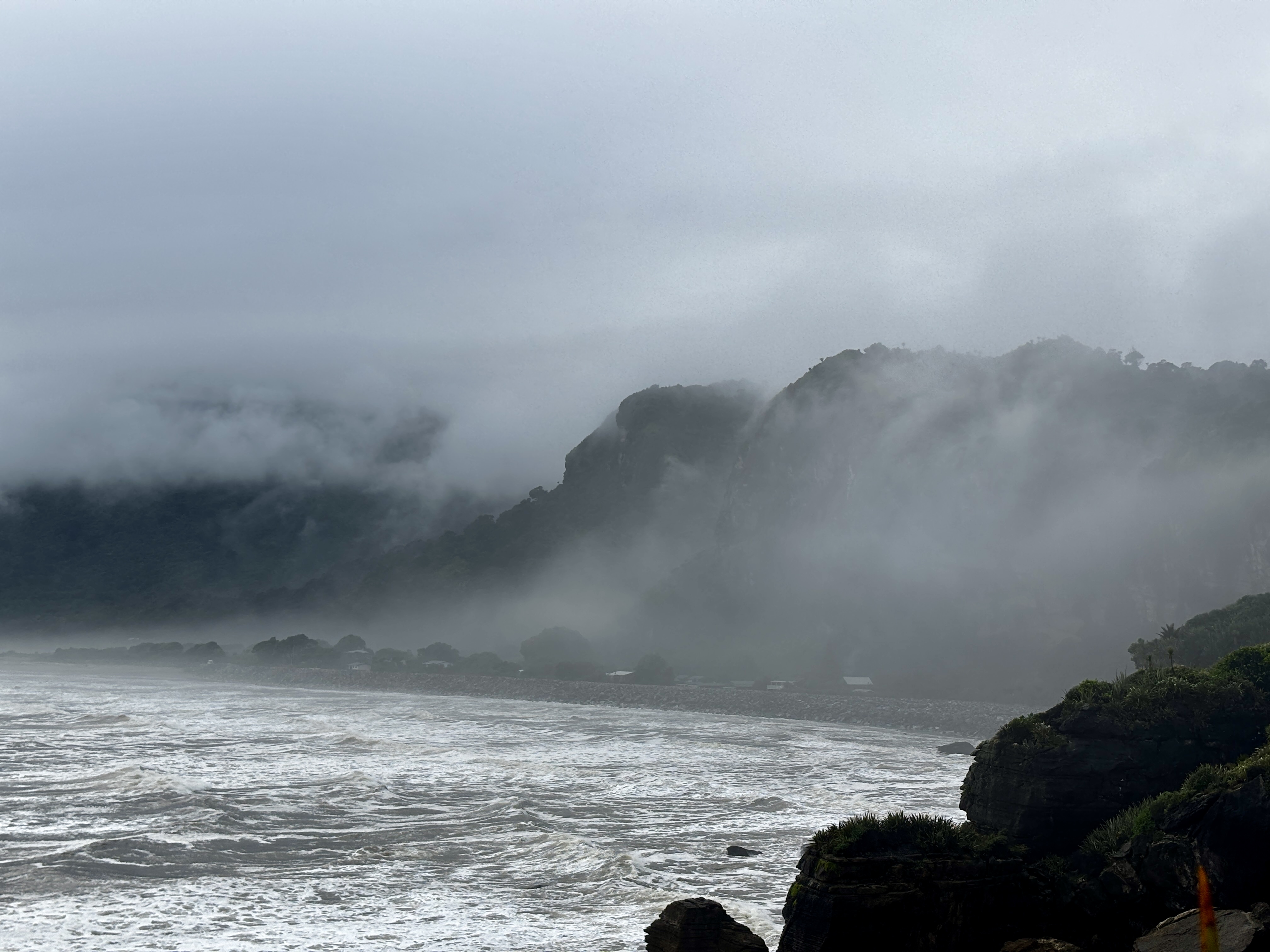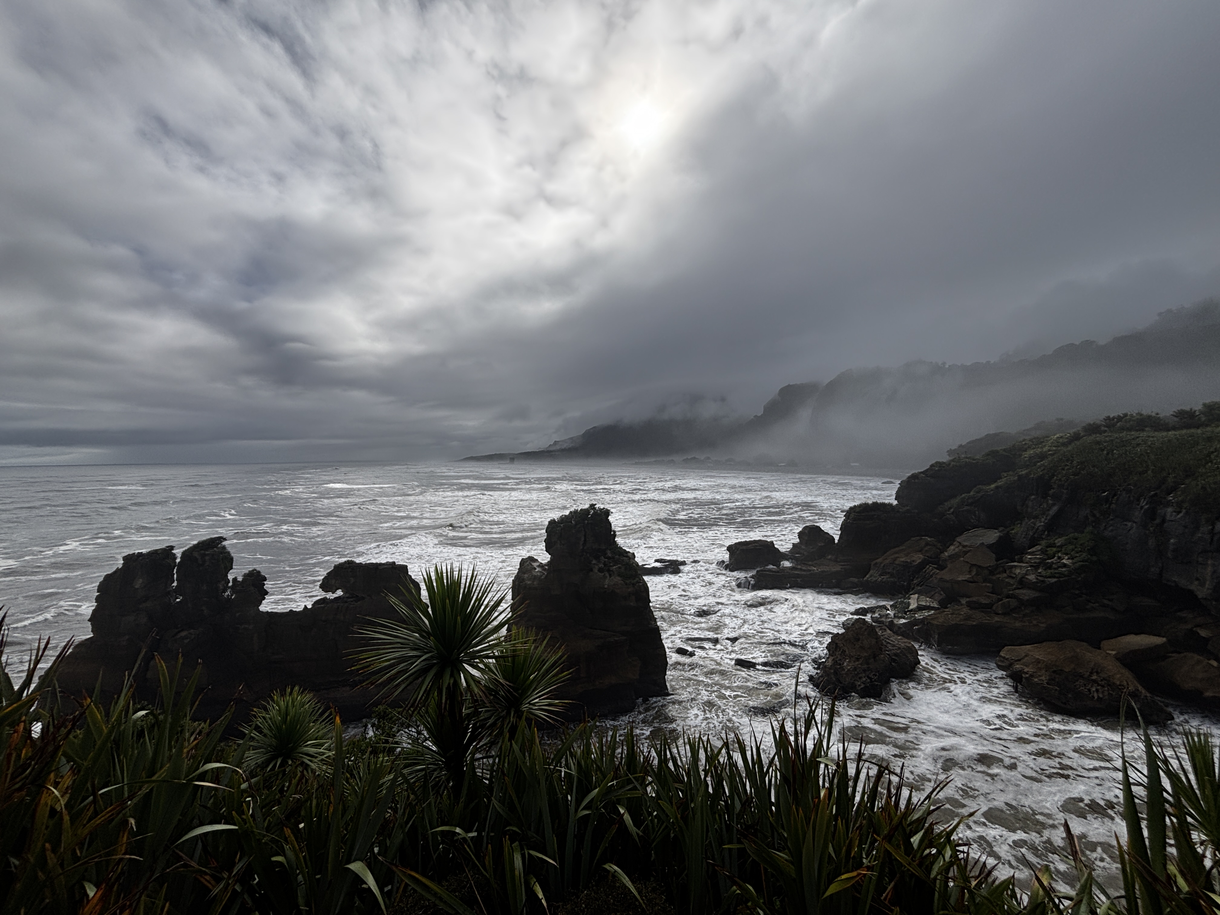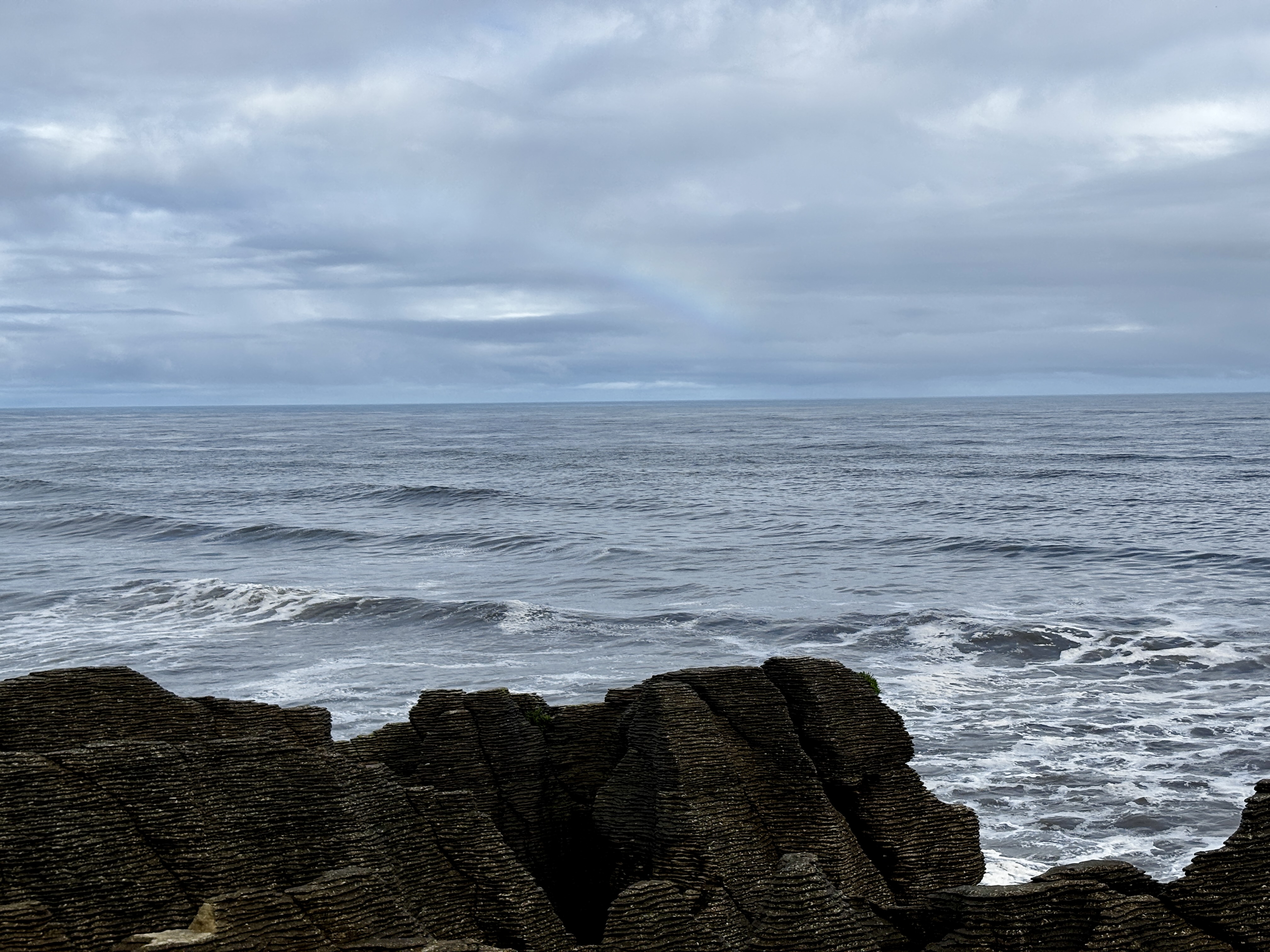 De la côte ouest, longer la mer de Tasman jusqu’à ce qu’elle vienne percuter le Dolomite Site et ce qu’on nomme ici « Pancakes Rock »— comme si l’érosion n’avait donné naissance qu’à de mauvaises plaisanteries pour touristes, quand les Maoris parlaient de Punakaiki, et dans leur mot on entend la bouche de la mer et le battement lent des mondes qui s’effacent — nous n’en verrons pas la fin, même en les regardant patiemment s’effondrer.