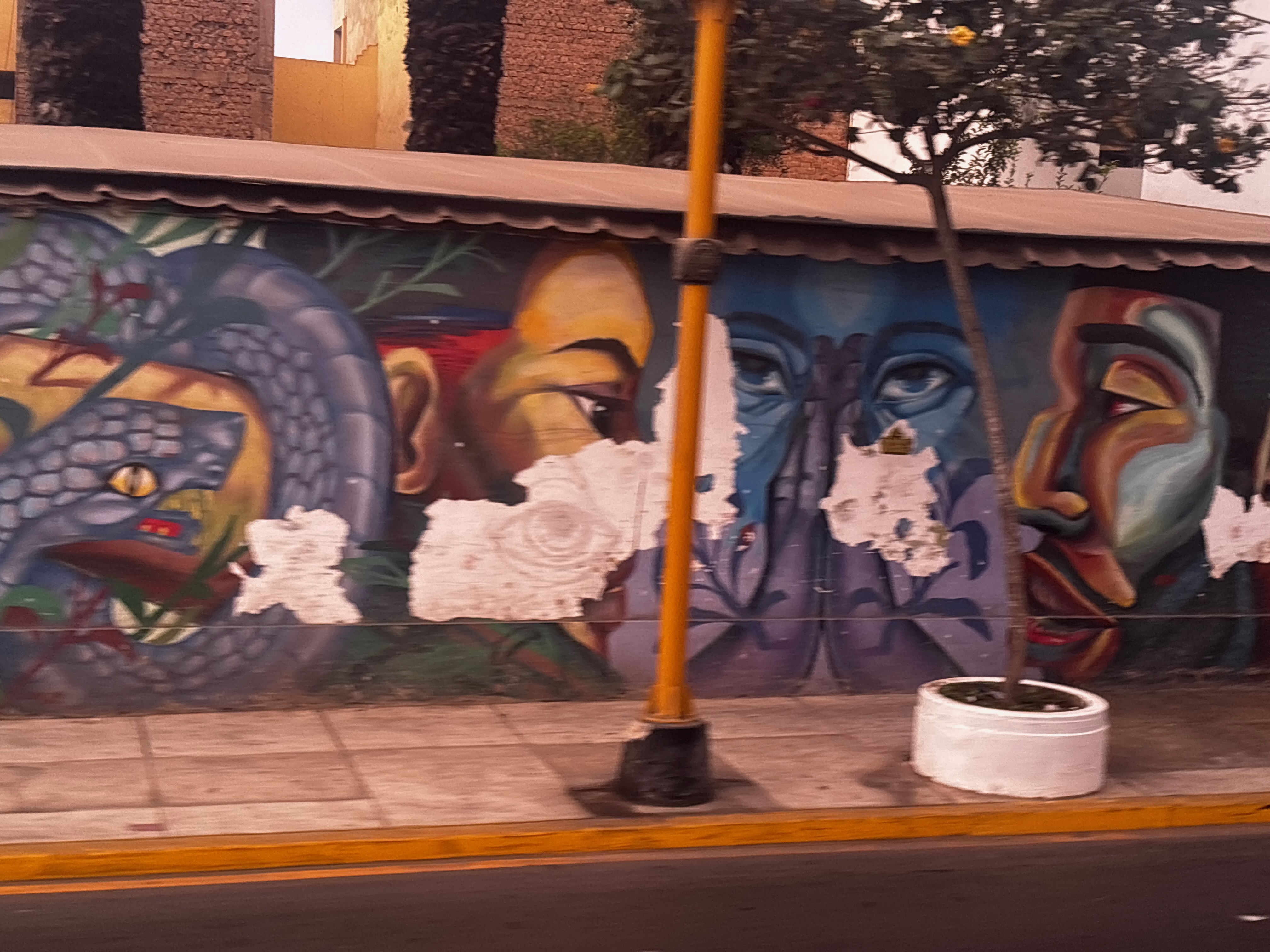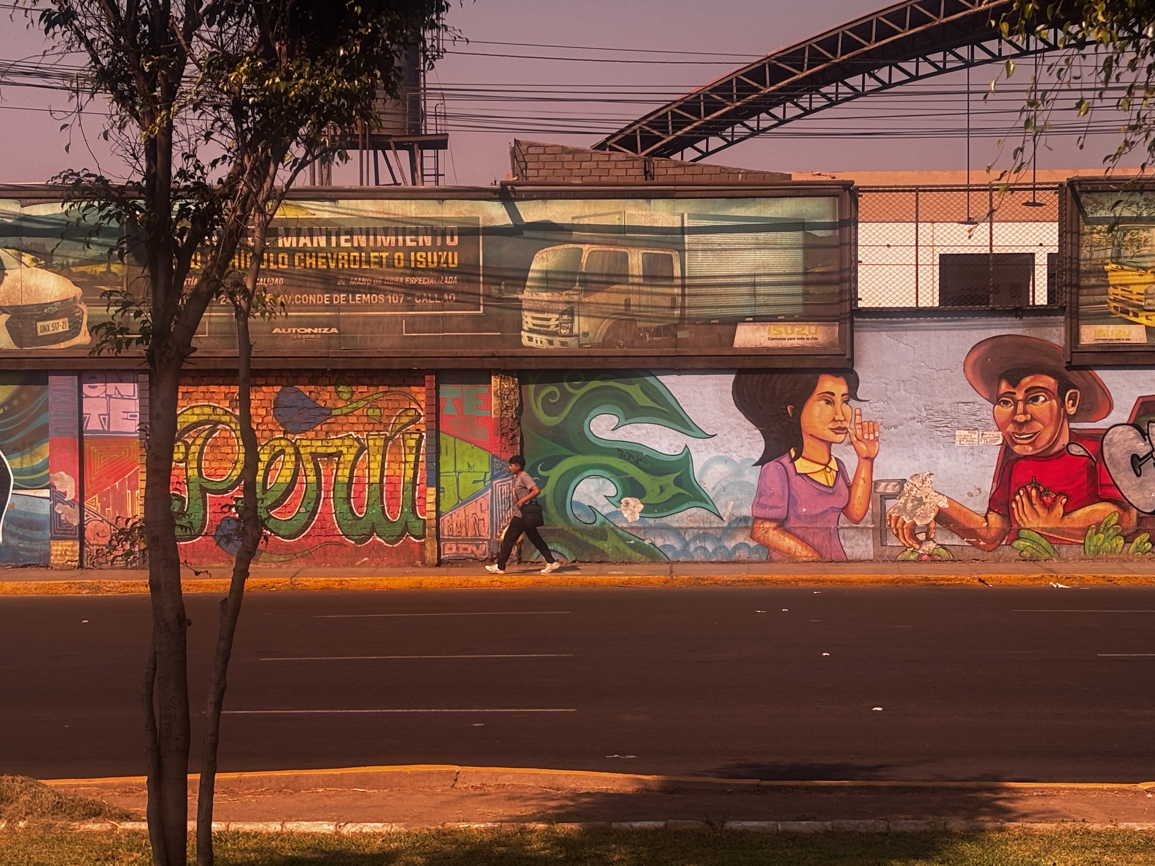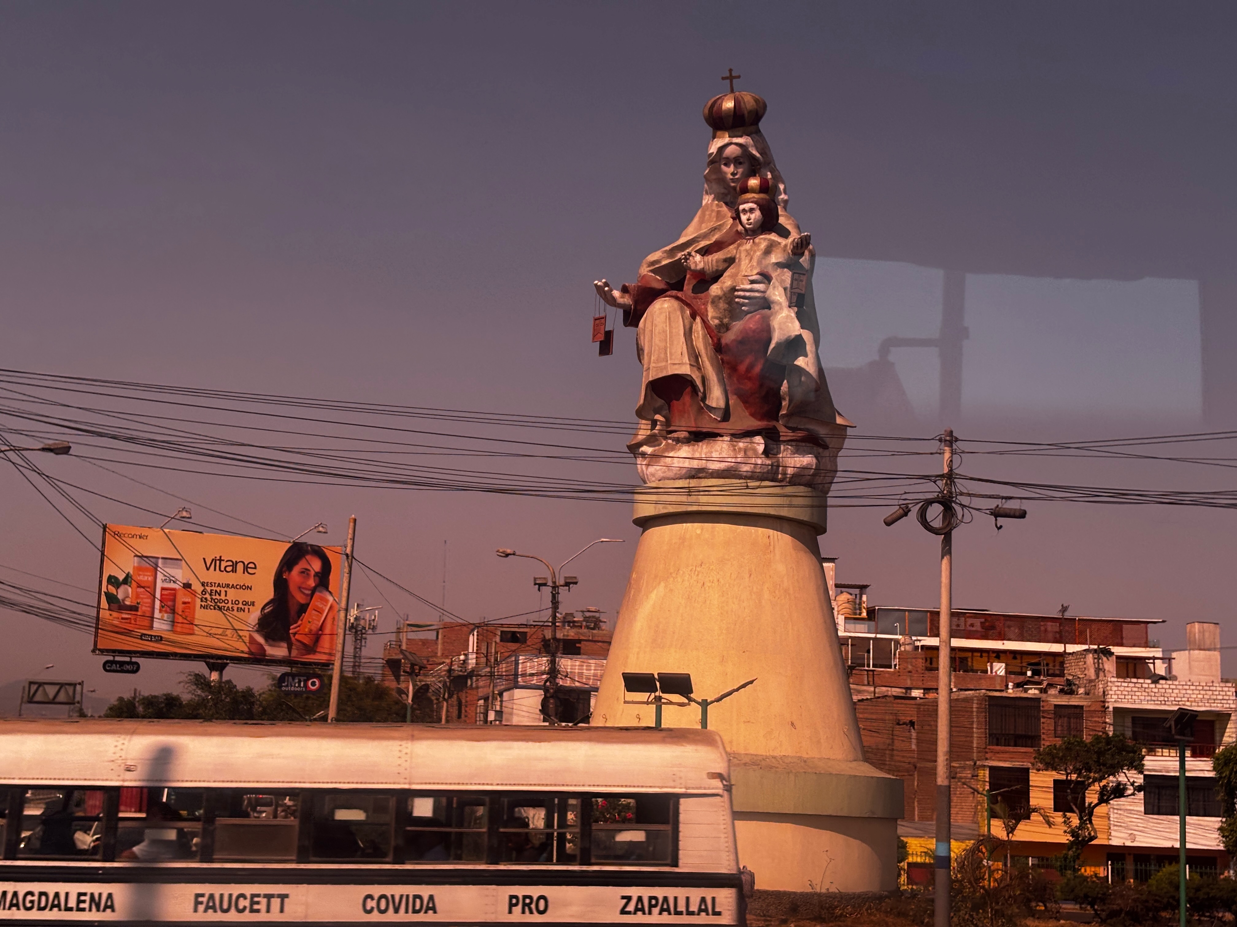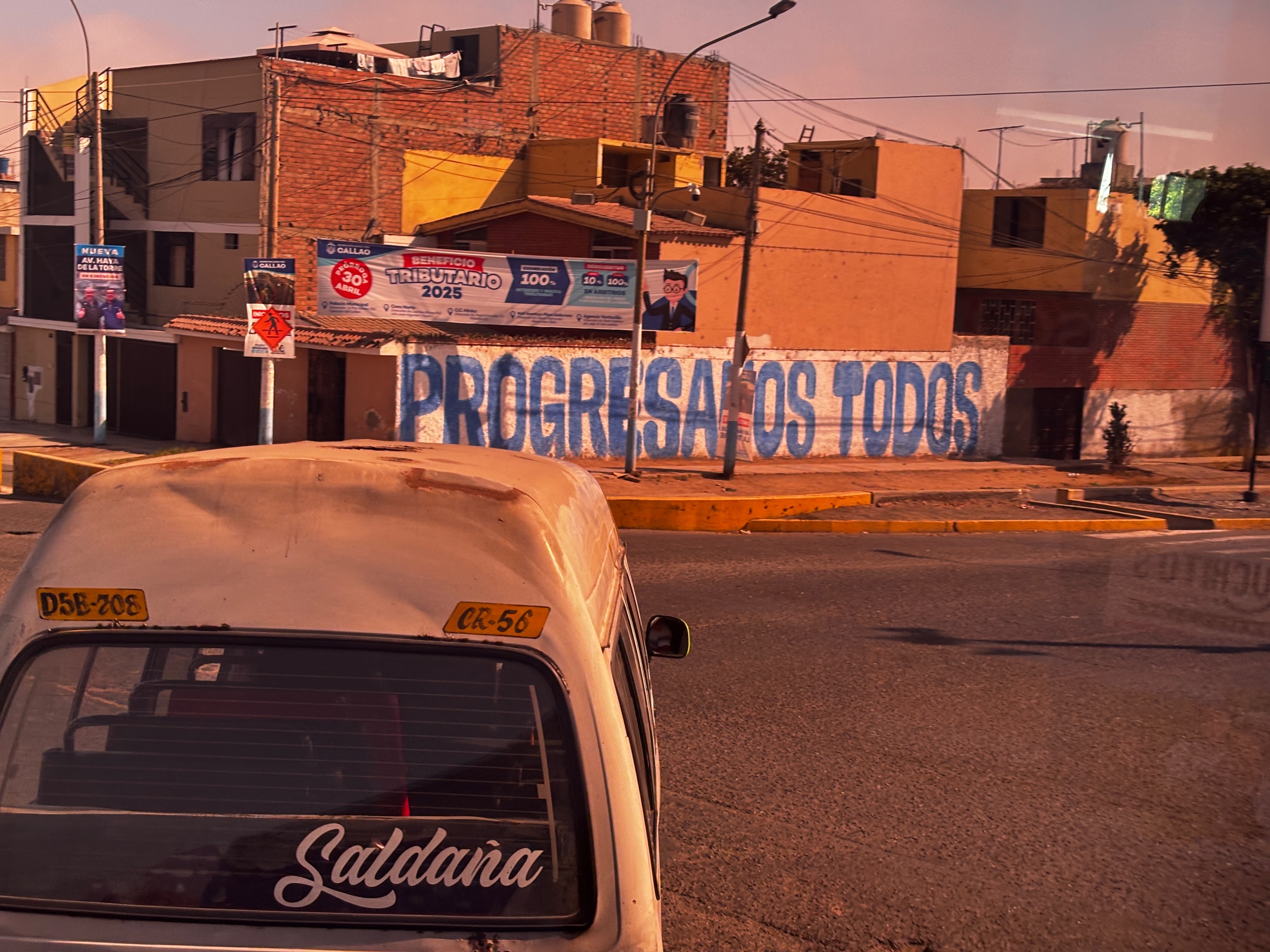 Dans le bus, les noms de quartiers résonnent comme des cartes effrangées : Faucett, Zapallal, Covida. Dans les rues, peinture criarde ou effacée, fresques murales aux couleurs vives, tôle rouillée, béton nu. La statue d’une Vierge semble veiller sur un carrefour qui ne croit plus à rien. Plus loin, sur les murs : PROGRESAMOS TODOS — tous ensemble vers un progrès introuvable, lancé comme une promesse en fuite.