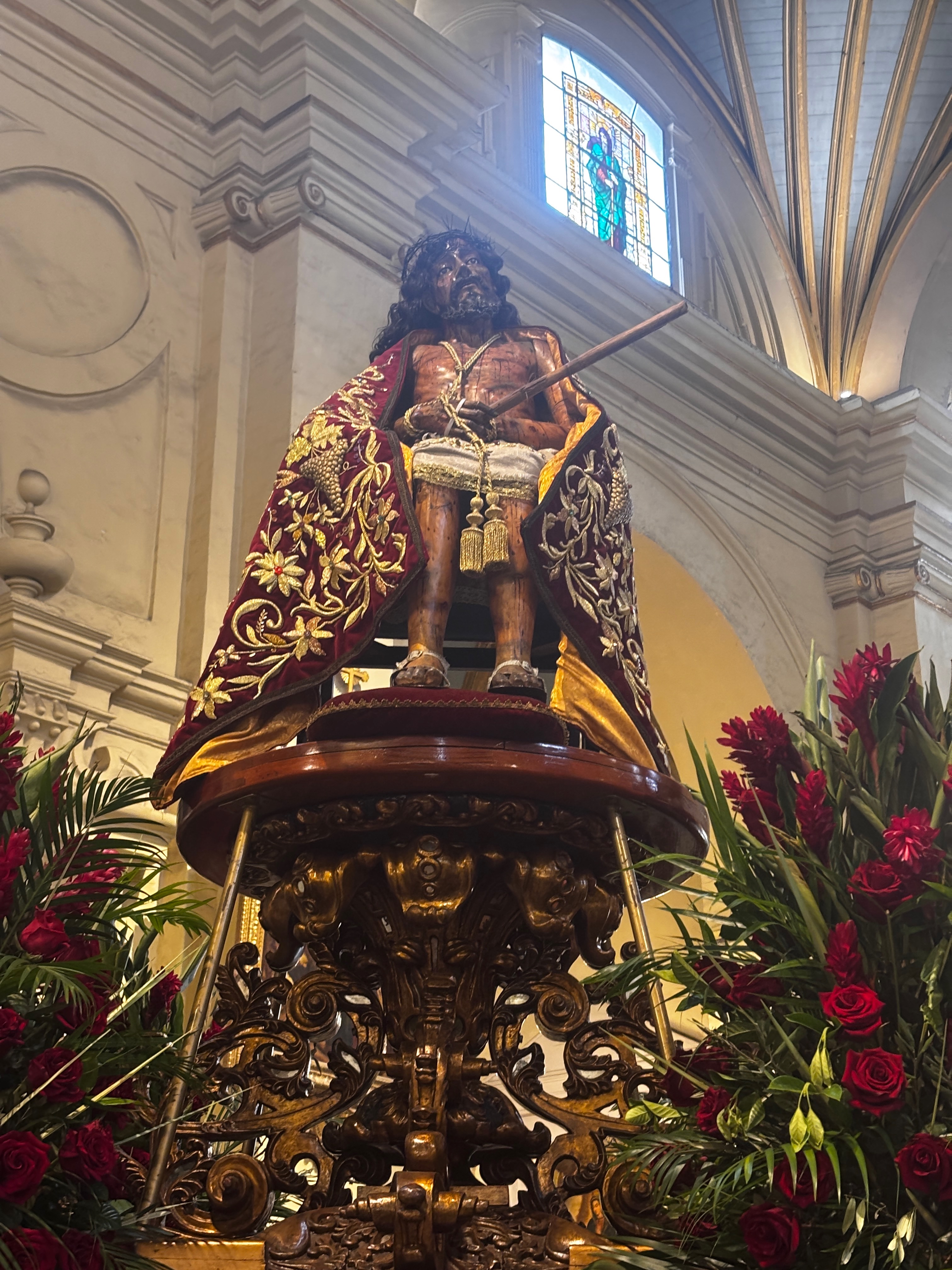 Plus loin, les Seigneurs des Miracles attendent, posés sur leur char, drapés de pourpre et d’or, prêts pour la procession. La foi, ici, est ce spectacle, simulacre et prétention au vrai qui ne dresse que son faux. Quelque chose résiste pourtant. Au fond de la chapelle, un saint décapité — visage serein, main levée — semble attendre autre chose : pas le salut, mais peut-être le silence. Au milieu des rites et des reliques, une question restait sans voix : à quoi tient cette foi qu’on expose, quand plus rien ne semble croire ?