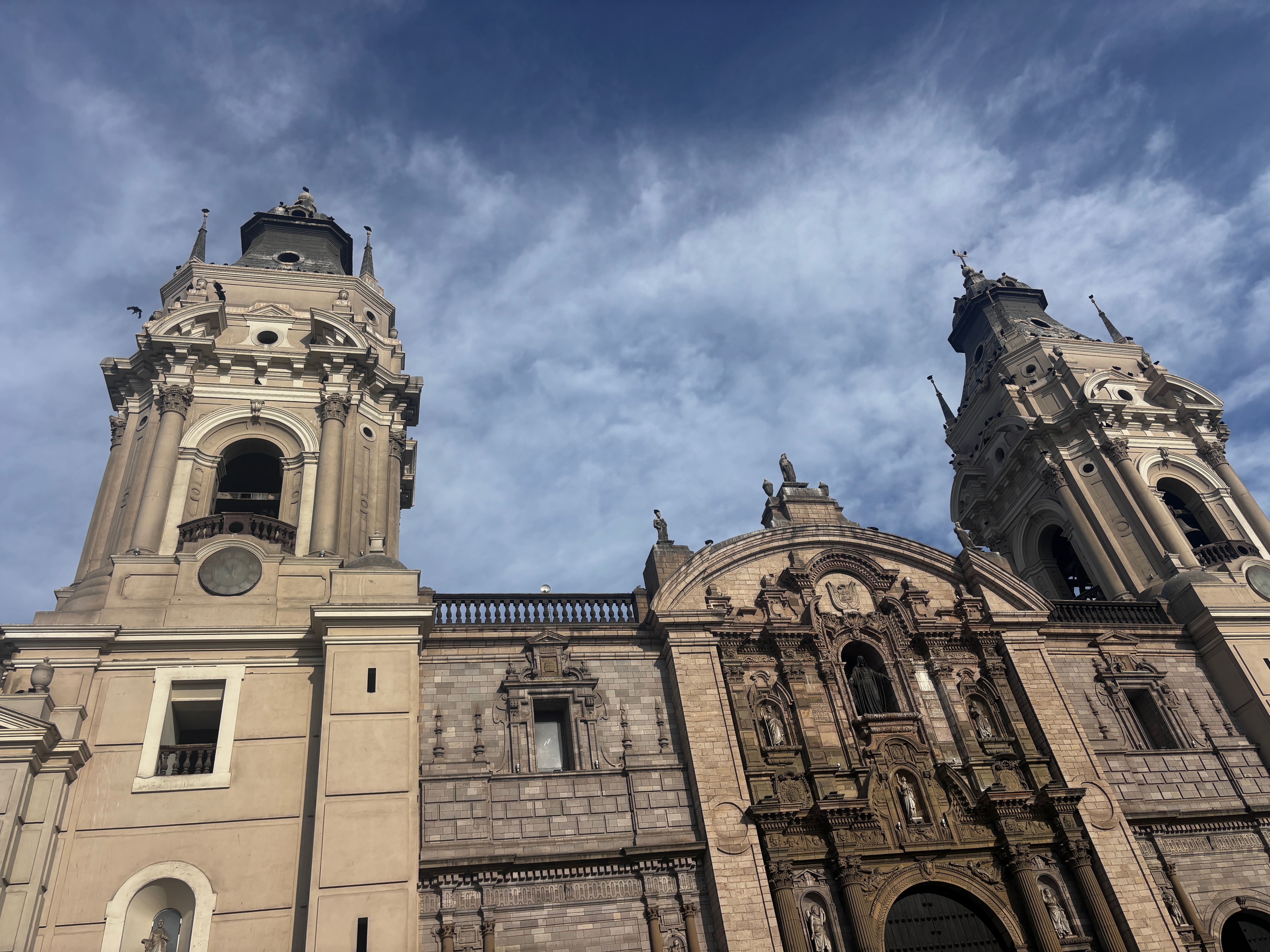 Dans Lima, le Centro aligne ses façades baroques sous le ciel terriblement bleu d’automne — balcons en bois sculptés mangés par les siècles, murs de boue compactés par l’oubli et fissurés comme des souvenirs trop pleins. Les édifices s’alignent, autant de livres fermés dont les titres ne cessent de s’effacer, les chapiteaux crient encore peut-être leur faste, mais dans une langue étrangère à la langue, et le plâtre tombe en silence. Ici, l’histoire debout reste sans mémoire ; elle s’appuie sur elle-même sans savoir qu’elle vacille. Des églises aux coupoles blanches s’élèvent au-dessus des trottoirs pendant que, figés dans leur gloire de bronze noir, les statues des anciens bourreaux trônent, absents à eux-mêmes — figures d’un empire rêvé, fondé dans le sang – oui, on marche bel et bien dans le cauchemar embrumé de Pizarro.