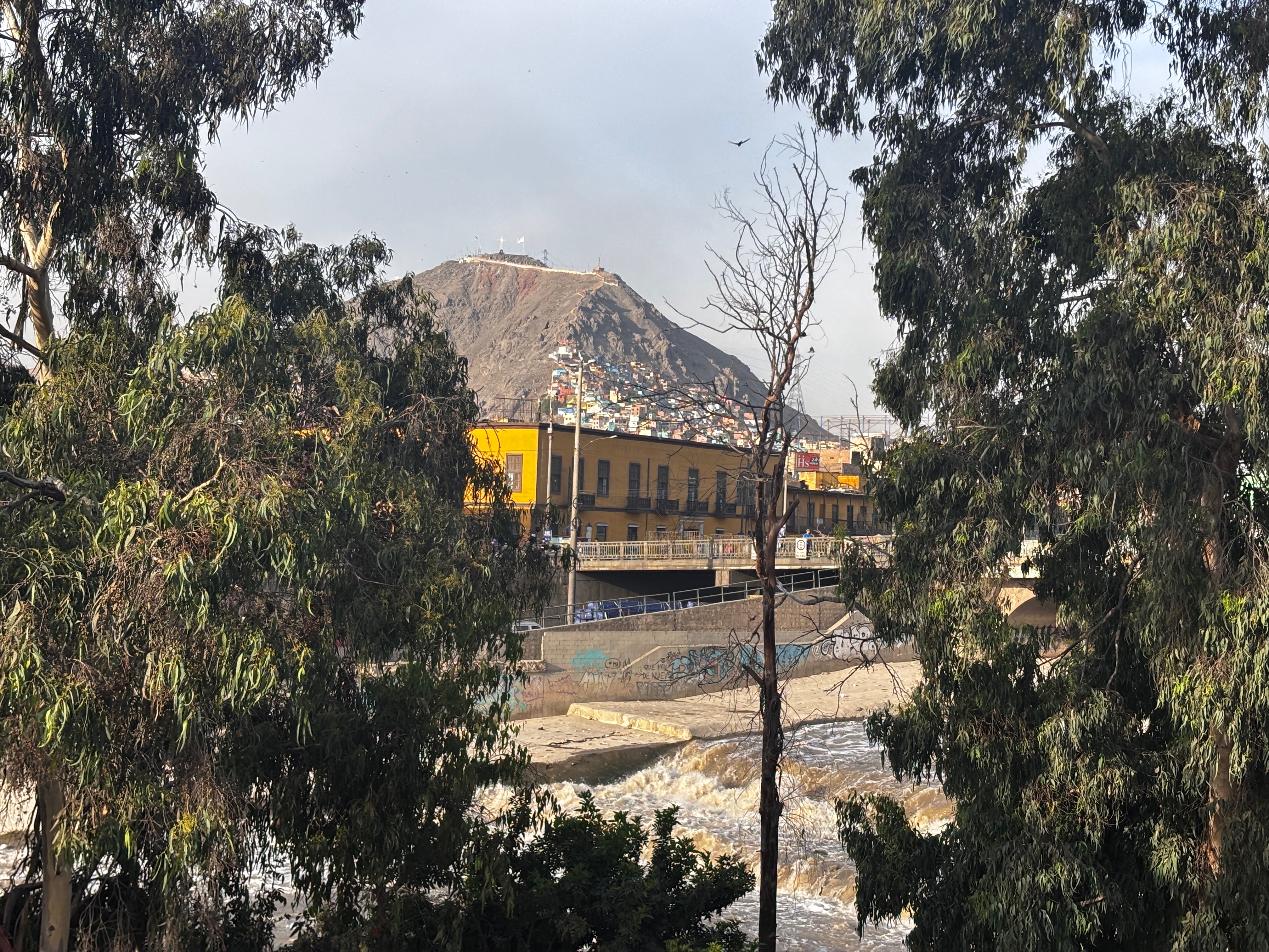 Ainsi s’efface Lima, derrière sa garúa tenace et sa propre mémoire. Rien ne commence. Rien ne finit. Les rues se succèdent en labyrinthes ouverts sur d’autres couloirs, et la ville se délite dans le mouvement. Les fantômes se glissent entre les étals, dans les cris des marchands ambulants. Le vacarme des bus, le flot des taxis, la peur et la ferveur, les drapeaux rouges et blancs mêlés aux fanions jaunes du Vatican : tout se confond. La police est là, casquée, mitraillette au poing, surveillant une ville qui n’obéit plus à rien. C’est la semaine sainte, paraît-il. Et ce n’est pas le sacré qu’on entend, mais le grondement du Rímac, qui passe en contrebas comme une artère trouble — battement d’un cœur ancien, plus vieux que les clochers, plus franc que les processions. Voix étranglé du pays indien toujours en deuil.