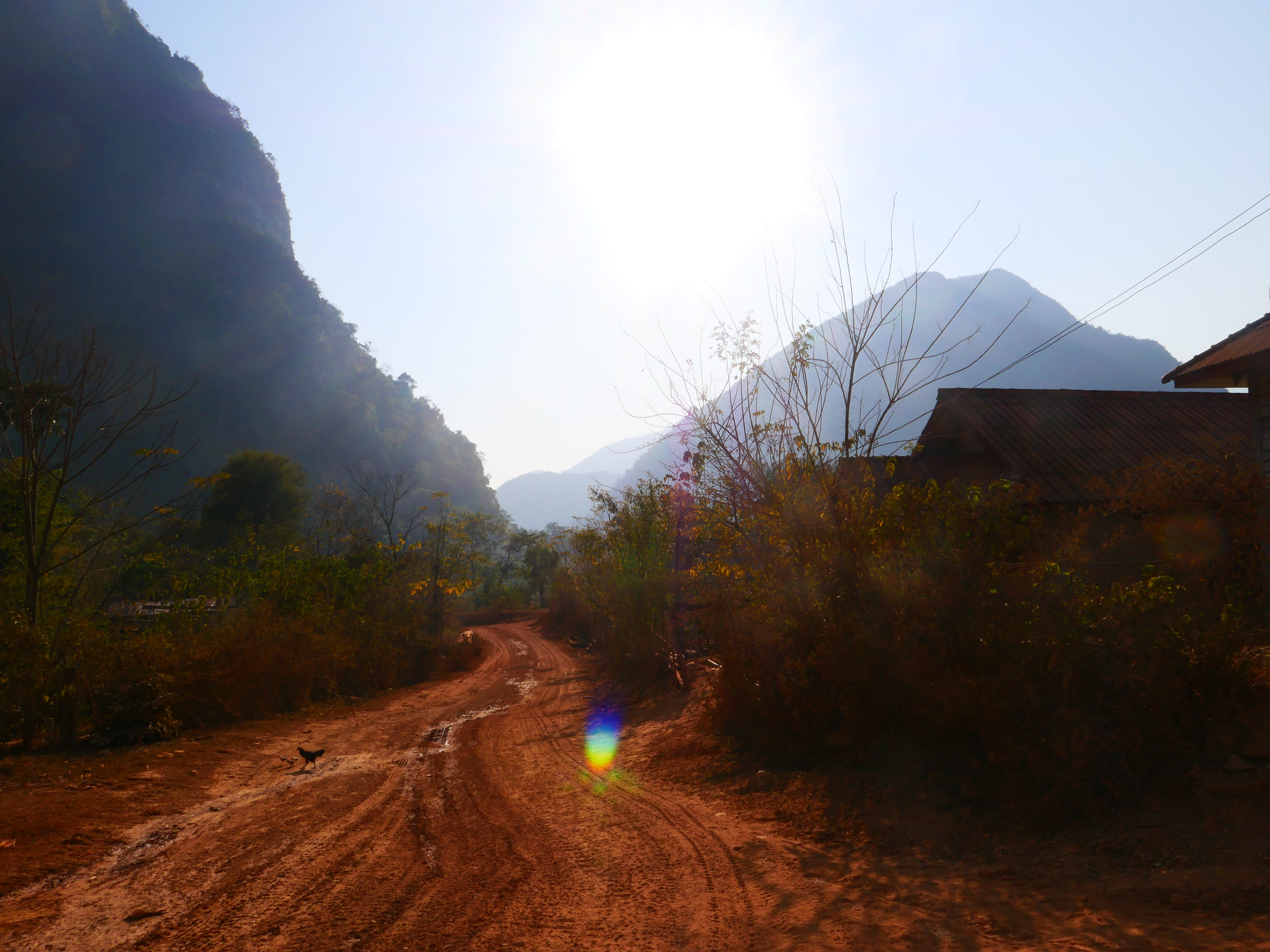 C’est à quelques heures de mauvaise route depuis Luang Prabang, en tournant le dos à la ville et en remontant le fleuve : le bitume d’abord défoncé laisse place à une piste de poussière au milieu de laquelle dorment les chiens, les vaches qu’on contourne en s’excusant presque, d’un coup de klaxon timide. Et puis, on arrive.