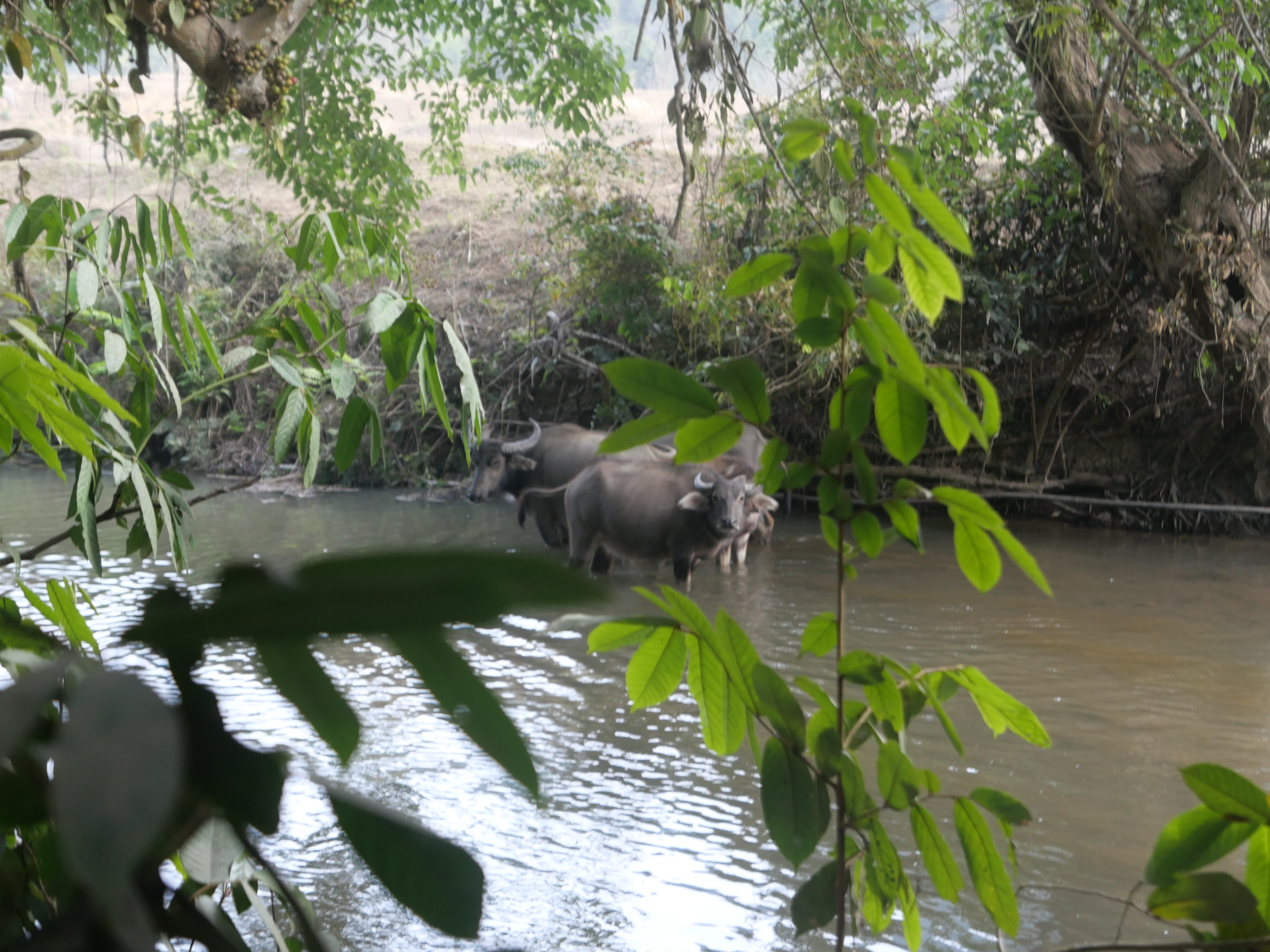 Le village est une route qui ne semble jamais finir : elle conduit au-delà des dernières maisons vers les rizières asséchées qui se prolongent en terrain vague allant se fondre dans la jungle. Un mince filet d’eau coule en contrebas. On y surprendra des buffles, et quand ils ont levé leur museau ahuri vers moi, j’étais un spectacle bien plus étrange pour eux qu’ils ne l’étaient pour moi.