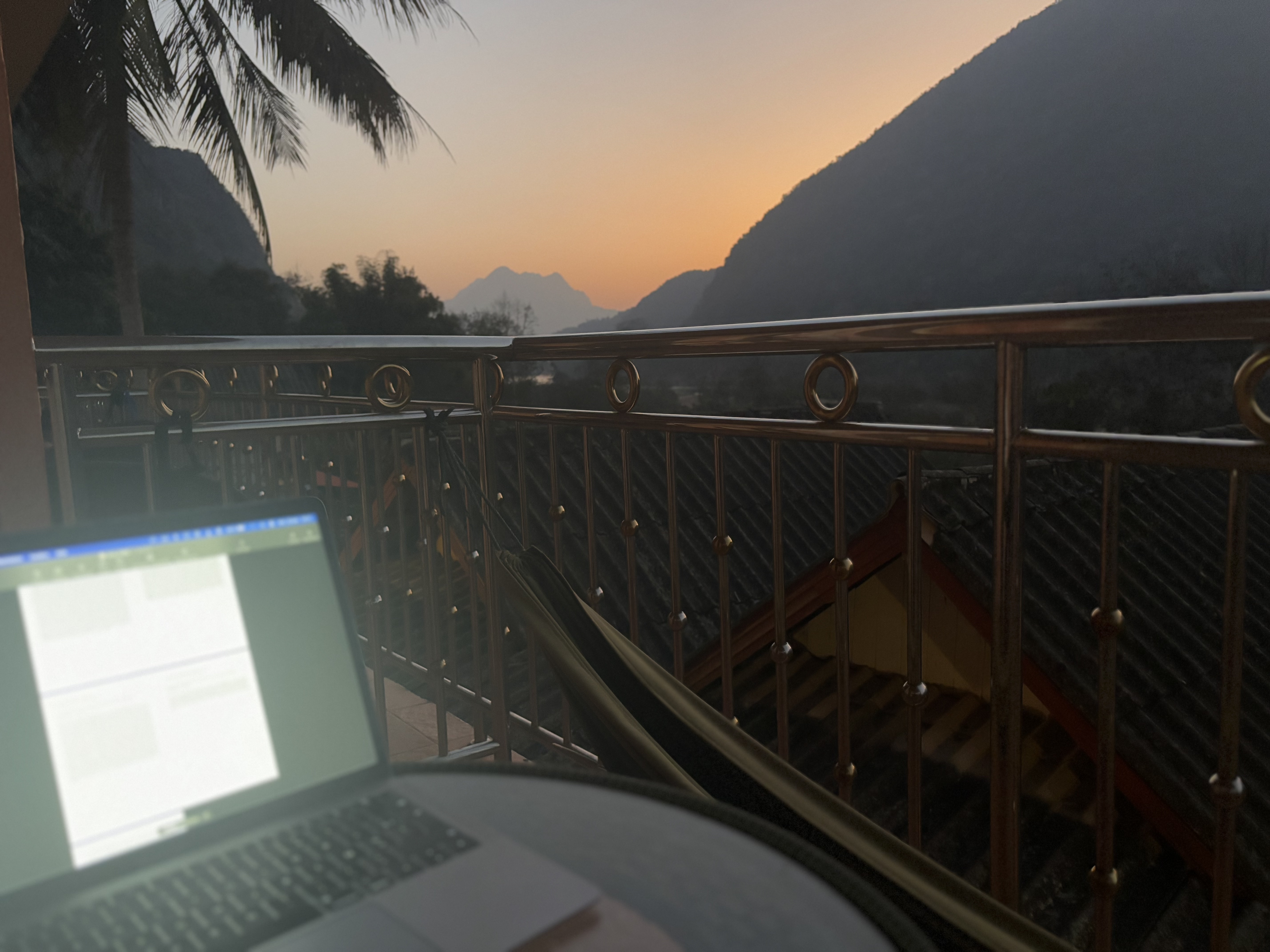 Le lendemain, retour à Nong Khiaw dans la même brume des fins du monde quand elle se confond avec son origine, gravir le Pho Daeng, tâcher de voir le monde entier après quatre-cent dix mètres d’ascension parmi les cris d’animaux cachés, d’oiseaux inconnus — là-haut, les massifs, la rivière qui s’échappe, le village déposé au hasard dans un nœud de la rivière, la vallée qui s’étend.