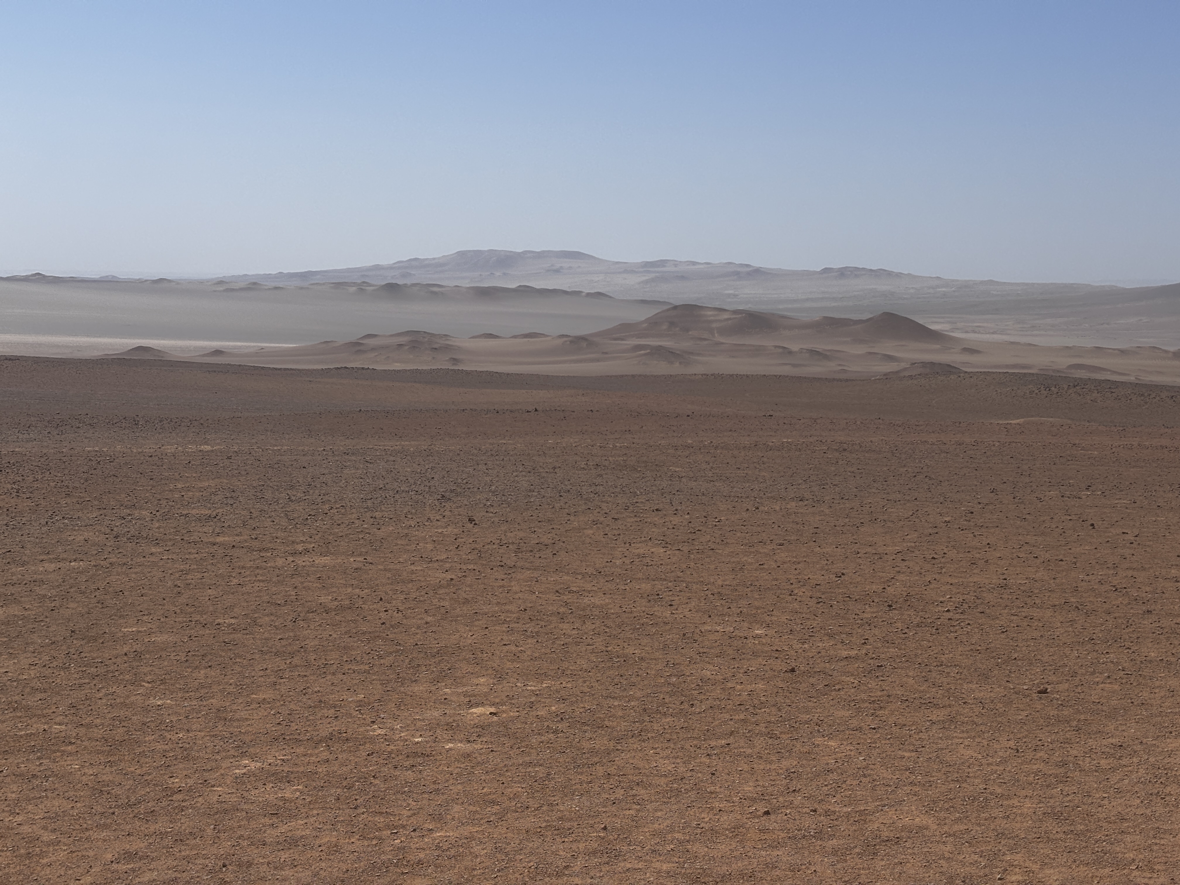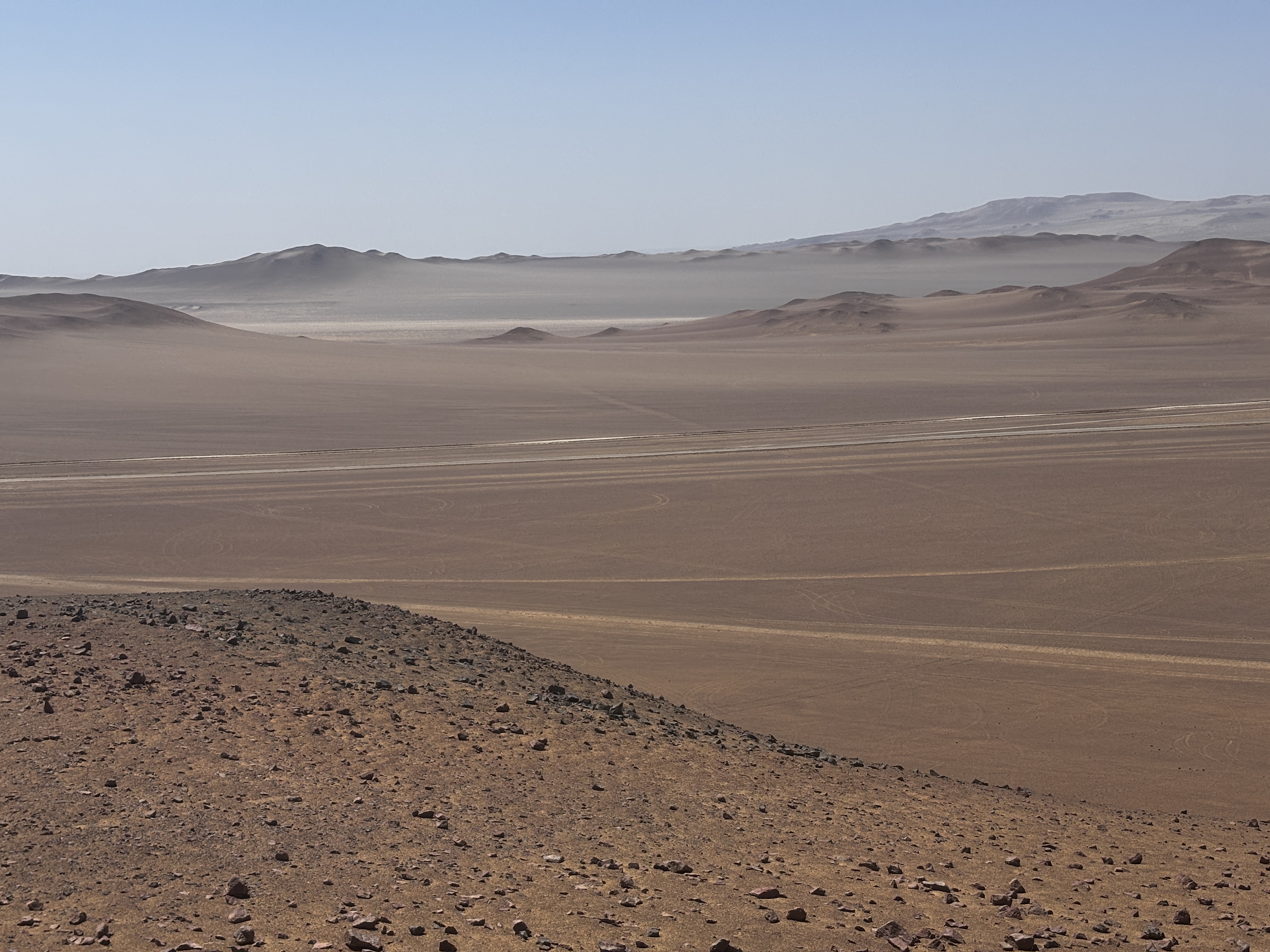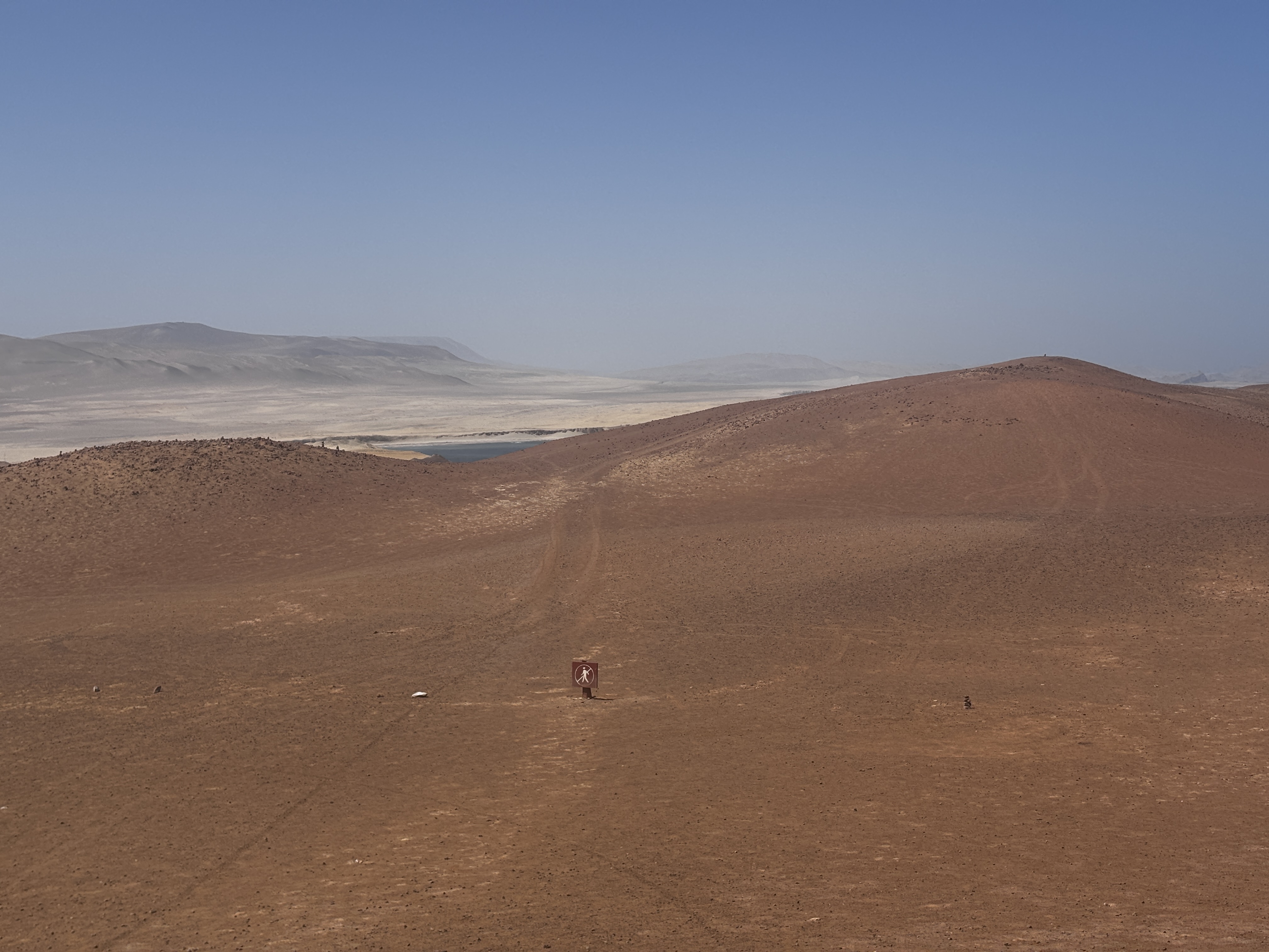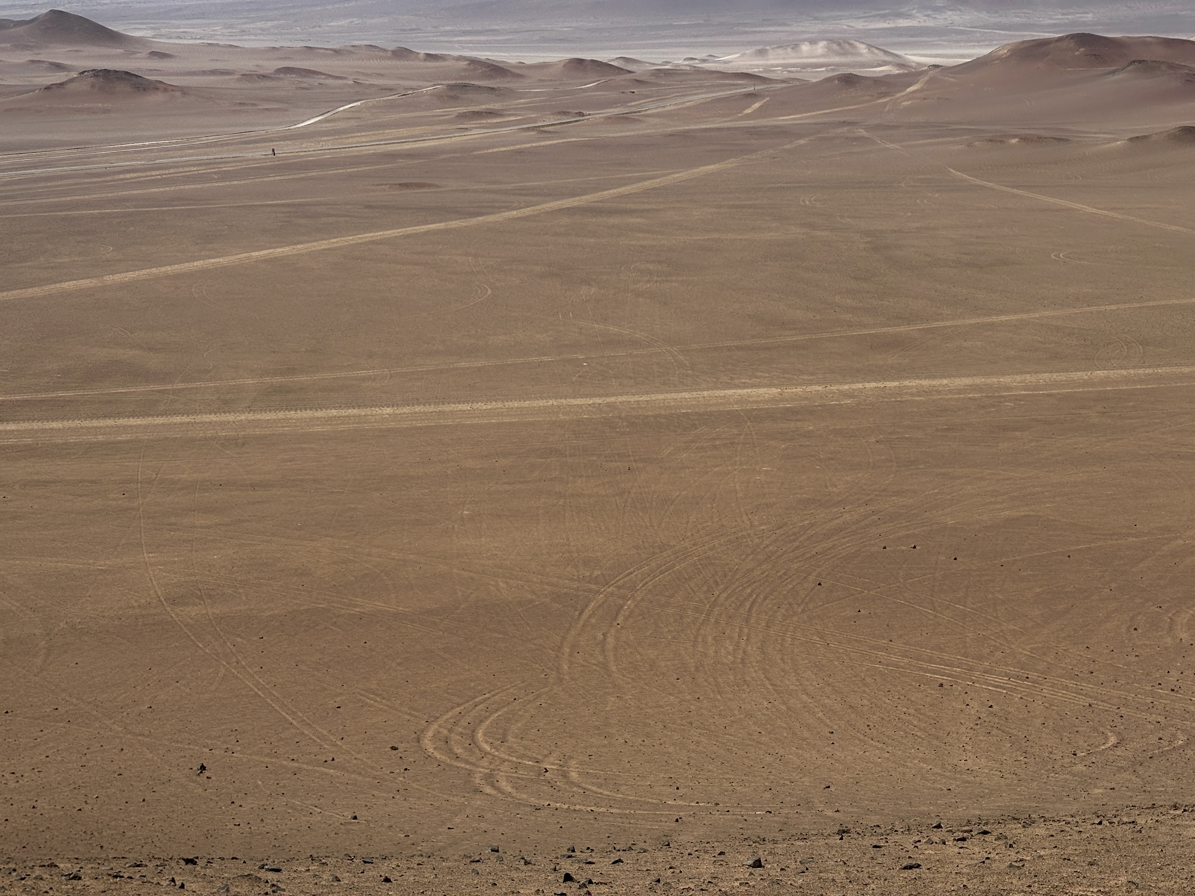 De Lima à Paracas, la route s’étire, longue et grise, entre le Pacifique sans éclat et des Andes qui s’effacent dans sa brume. On suit les traces des conquistadors sur les pistes où s’est enlisé leur soif avant qu’ils ne tournent main gauche vers les montagnes où se cachait l’Inca. Le désert avale l’horizon à grande bouchée. Des villages surgissent, s’effacent, éparpillés en mirages. À El Chaco battu par le vent, les étals débordent de souvenirs pressés : chapeaux de paille, cartes postales, céramiques bon marché — éclats figés du passé à peine glorieux. Au crépuscule, la lumière incendie les collines ; les ombres dessinent, sur les roches, les motifs funéraires des Paracas disparus qui dansait autrefois pour le soleil qui devaient sous leurs cris tomber, et il le faisait.
